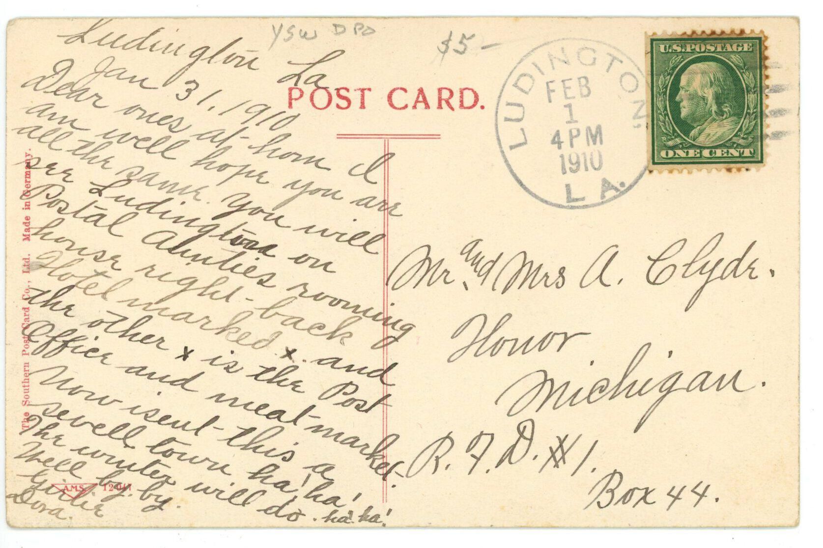 Ludington LA Jan 31 1910 Dear {undecipherable words-3] I am well hope you are all the same. You will see Ludington on Postal [undecipherable word] rooming house right-back hotel marked with x and the other x is the Post Office and {undecipherable word] marked, Wow iseul-this is serell tower ha ha ha ha! The writing will do. Well by by Girlie DoraLanguage