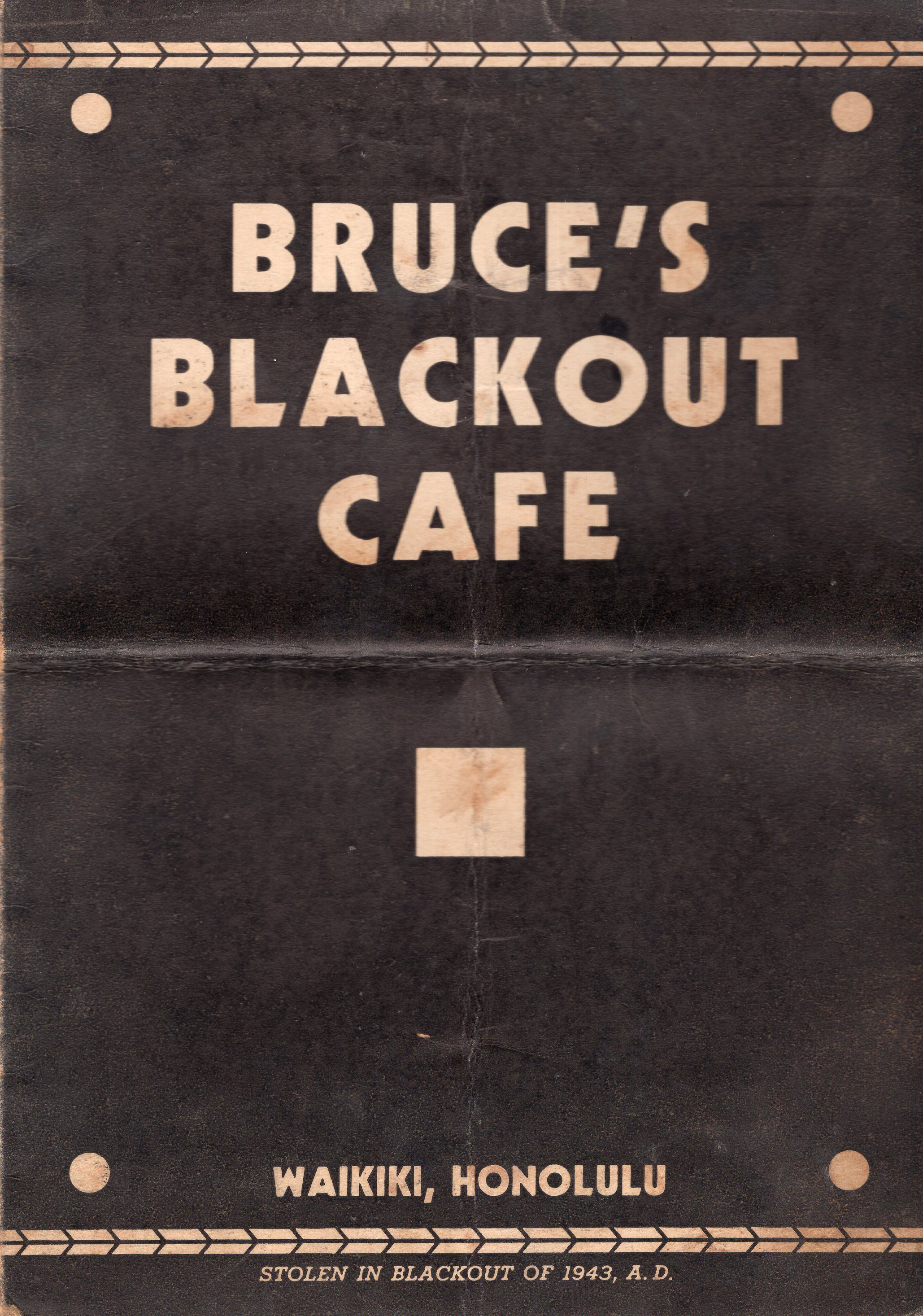 Photos show the front, back, and inside of a menu from Bruce's Blackout Cafe in Hawaii, operating during World War II.Context