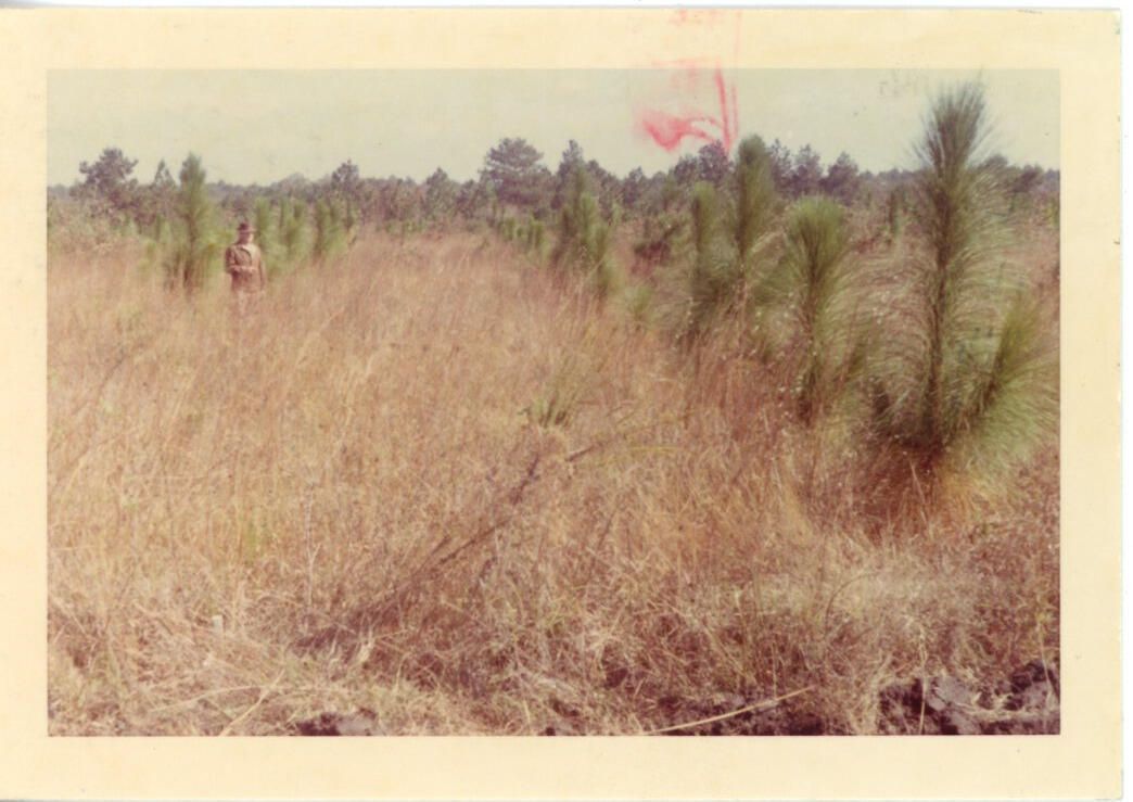 at the Long Leaf Pine Tract measuring the growth of different sections their crossbreeding (genetics); Derr standing among rows of longleaf pinesPhotograph Details