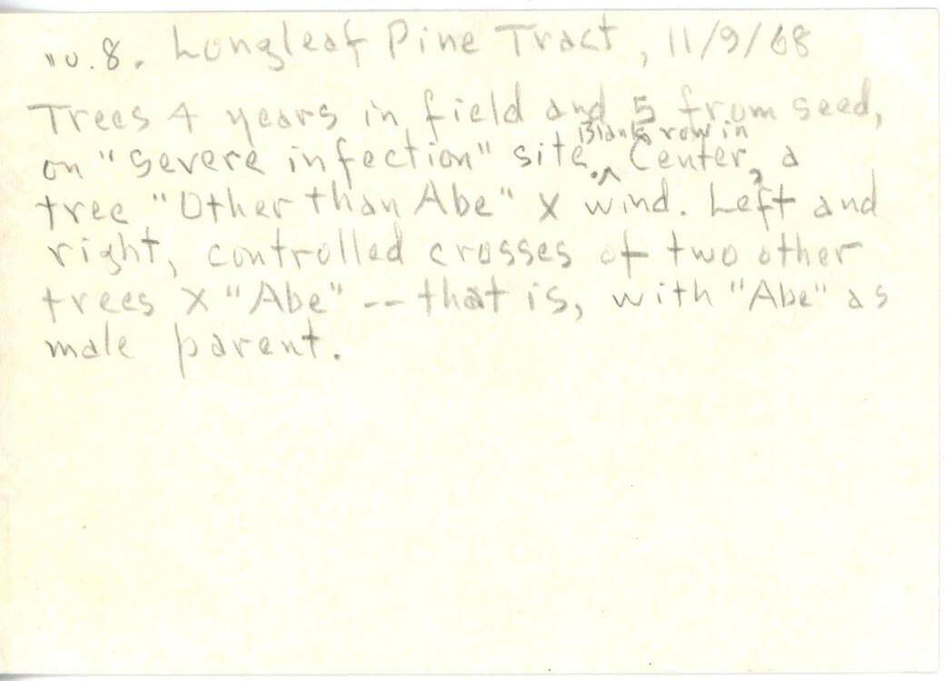 No. 8 Longleaf Pine Tract, 11/9/68 Trees 4 years in field and 5 from seed, on "severe infection" site Blankrowin Center, a tree "Other than Abe' x wind. Left and right, controlled crosses of two other trees x "Abe"--that is, with "Abe" as male parentMaterial/Technique