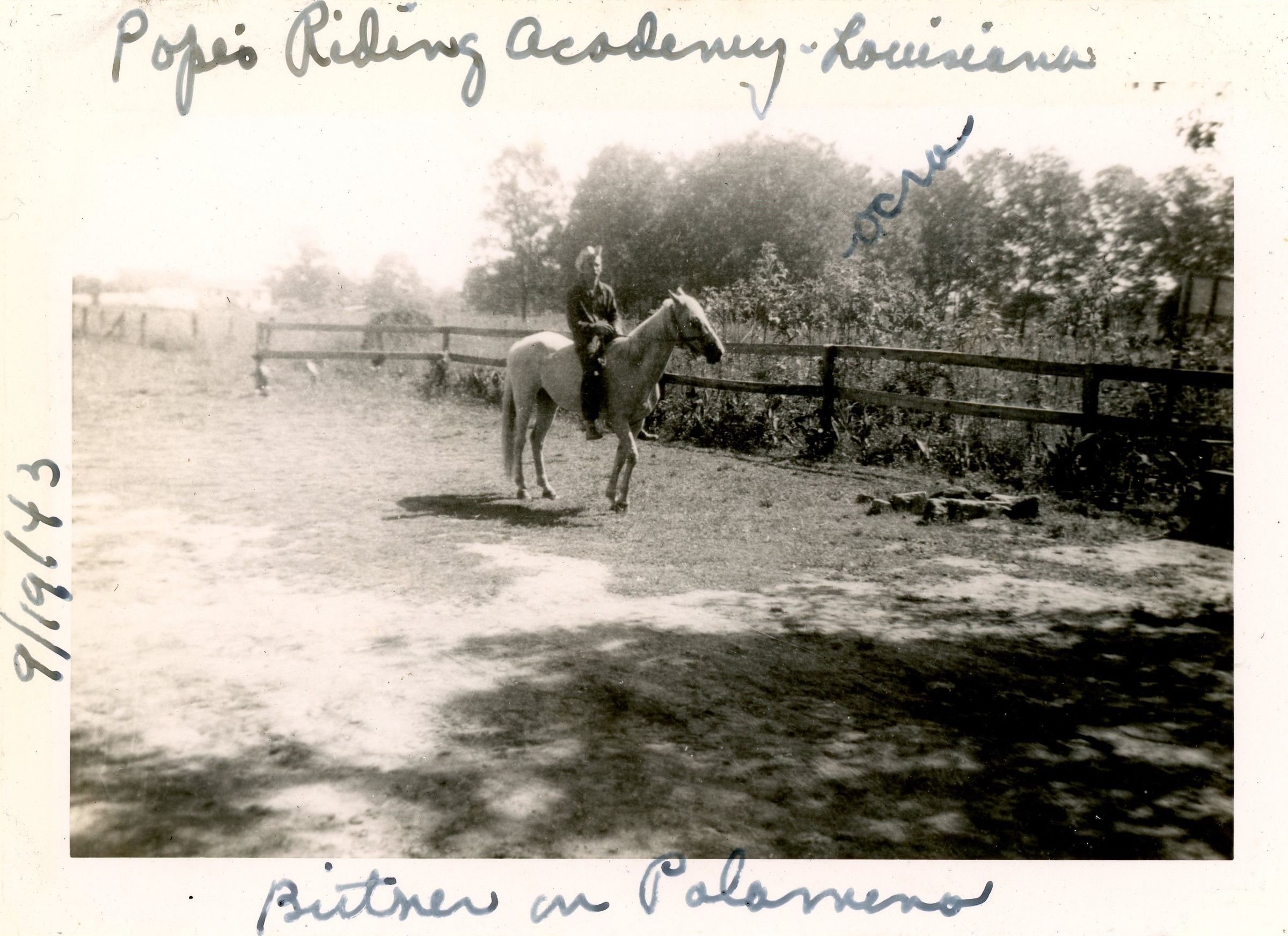 Pope's Riding Academy - Louisiana; 9/19/43; Butner on Palomino [unsure of name]; NOTE: ocra [misspelling of okra]Material/Technique