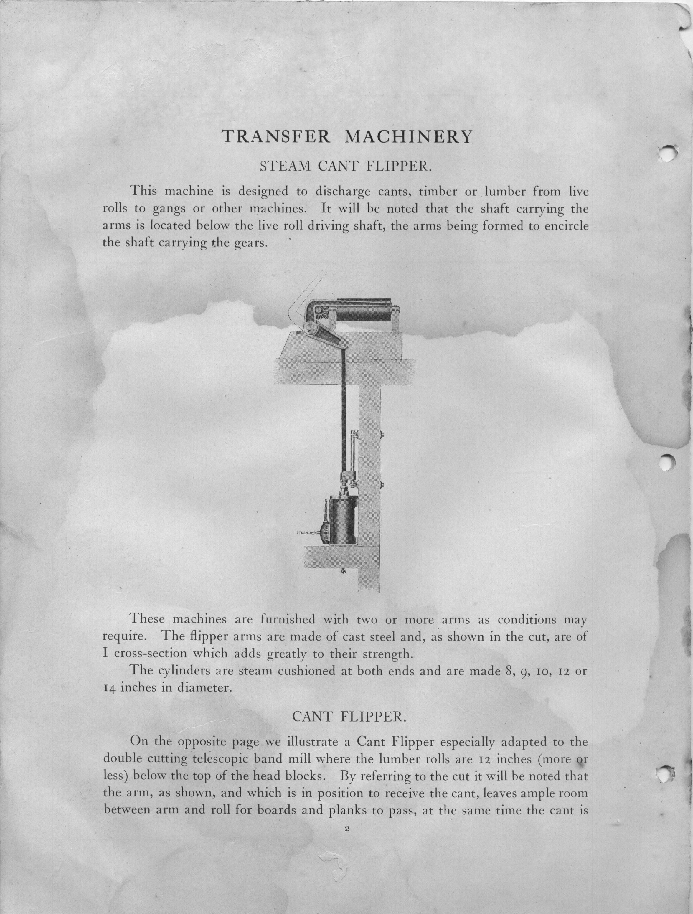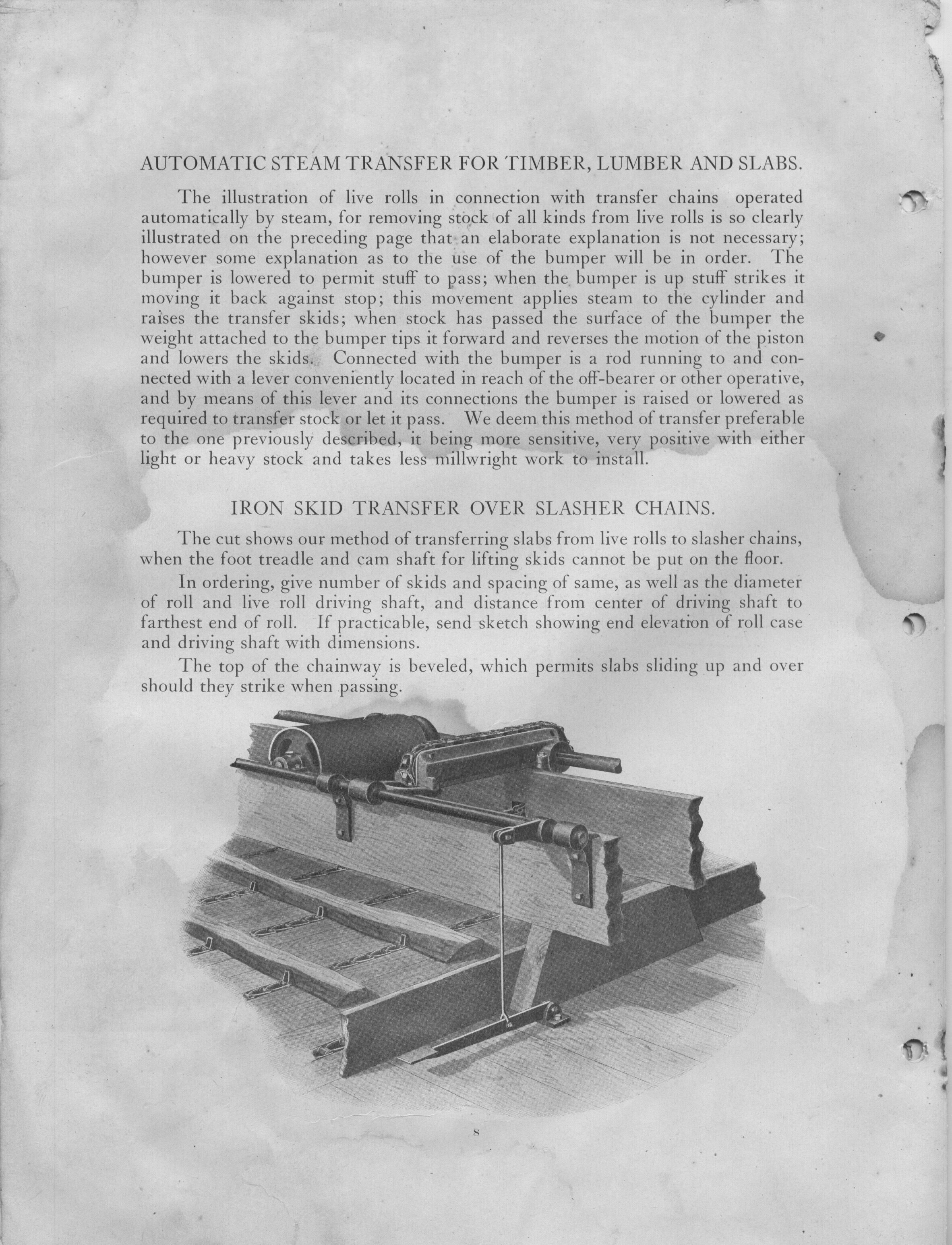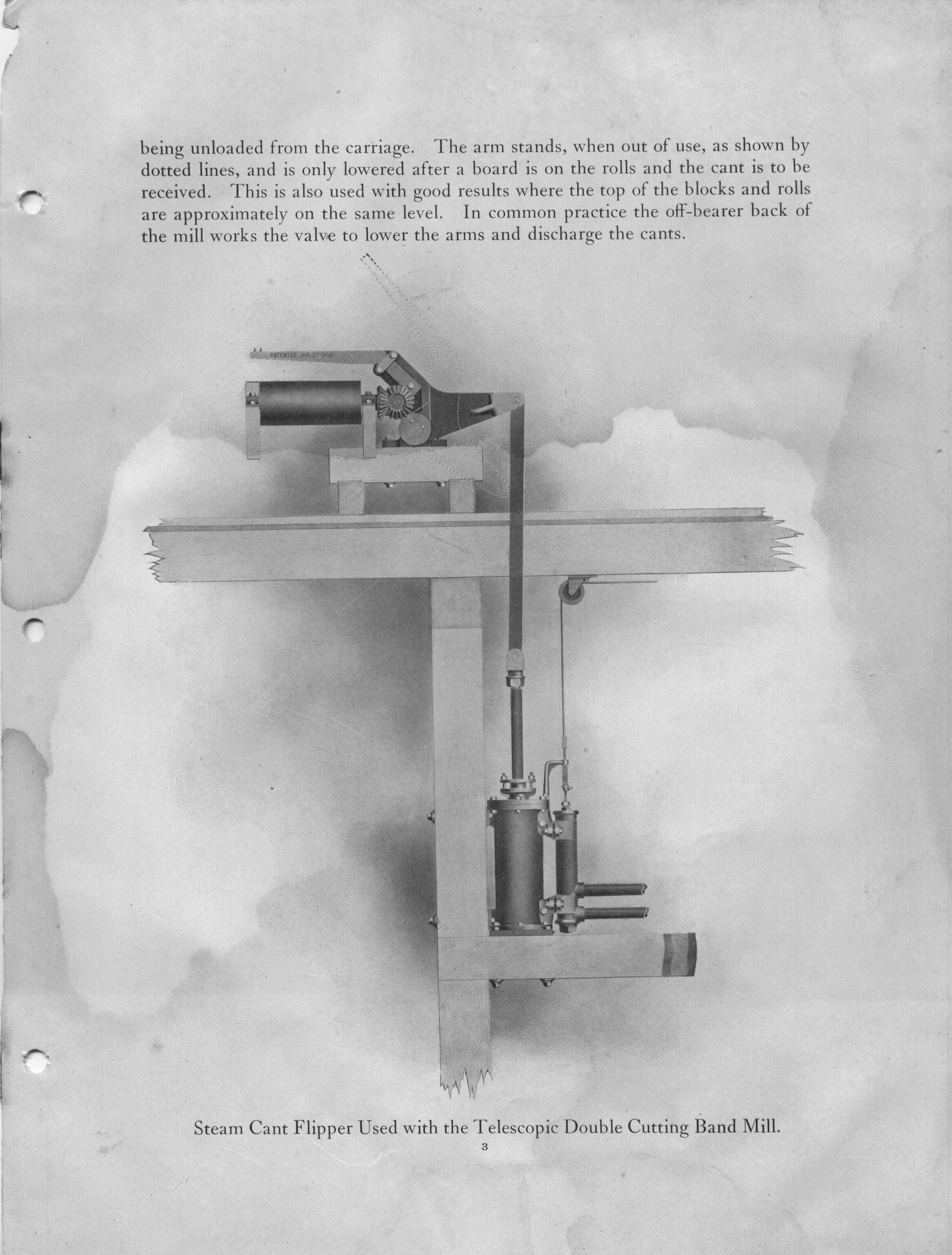 Out of New Orleans District company; features: Steam cant flipper, Cant flipper, Steam cant flipper used the telescopic double cutting band mill, Steam stock lifter, Iron skid transfer operated by foot treadle, Automatic transfer to edger, Automatic steam transfer for timber lumber and slabs, Iron skid transfer over slasher chains, Reversible friction live roll drive, and Live rollsContext