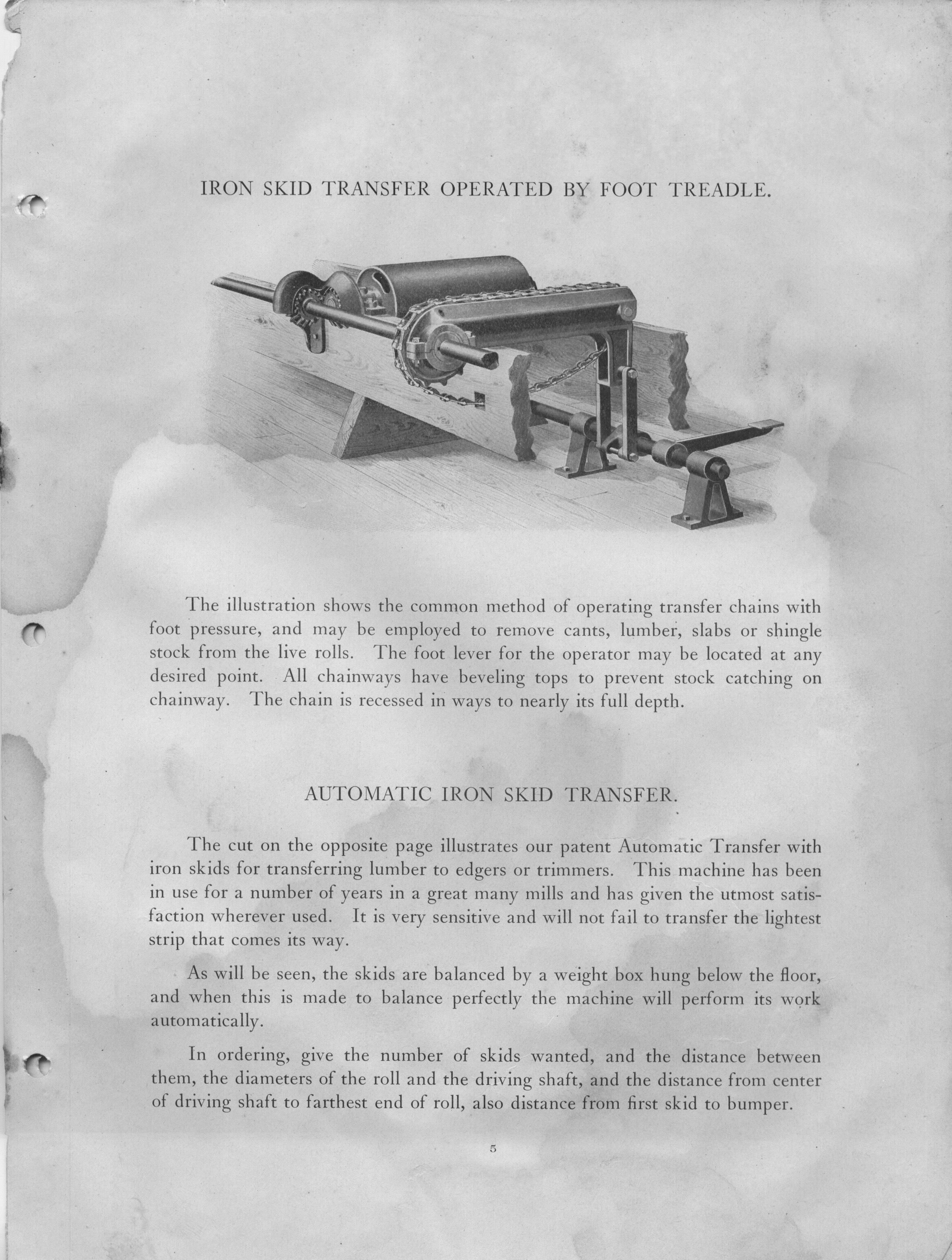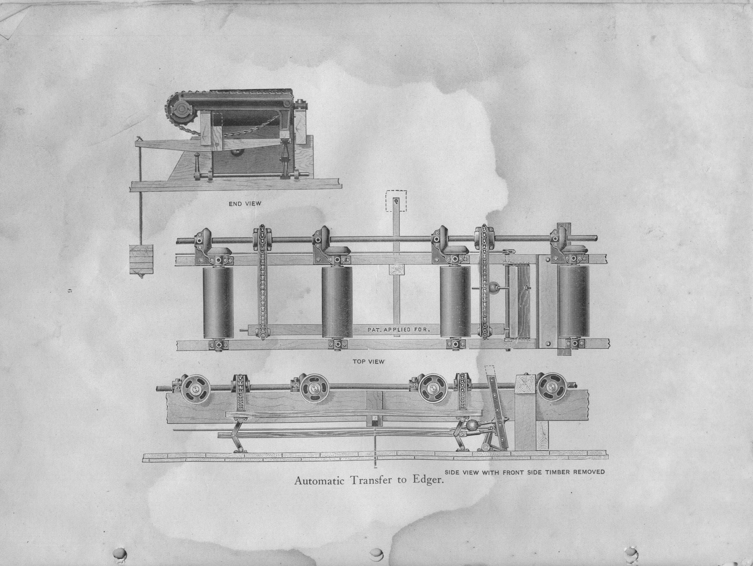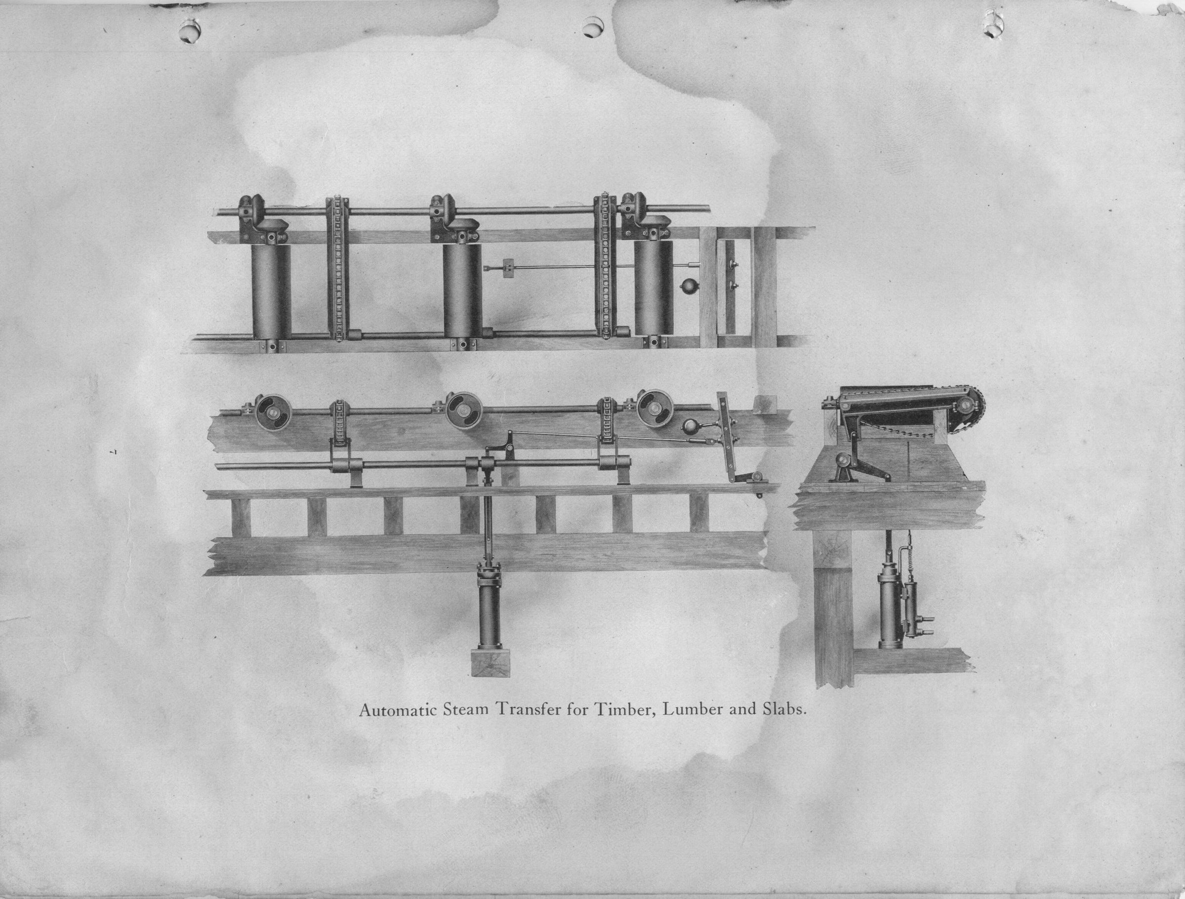 Out of New Orleans District company; features: Steam cant flipper, Cant flipper, Steam cant flipper used the telescopic double cutting band mill, Steam stock lifter, Iron skid transfer operated by foot treadle, Automatic transfer to edger, Automatic steam transfer for timber lumber and slabs, Iron skid transfer over slasher chains, Reversible friction live roll drive, and Live rollsContext