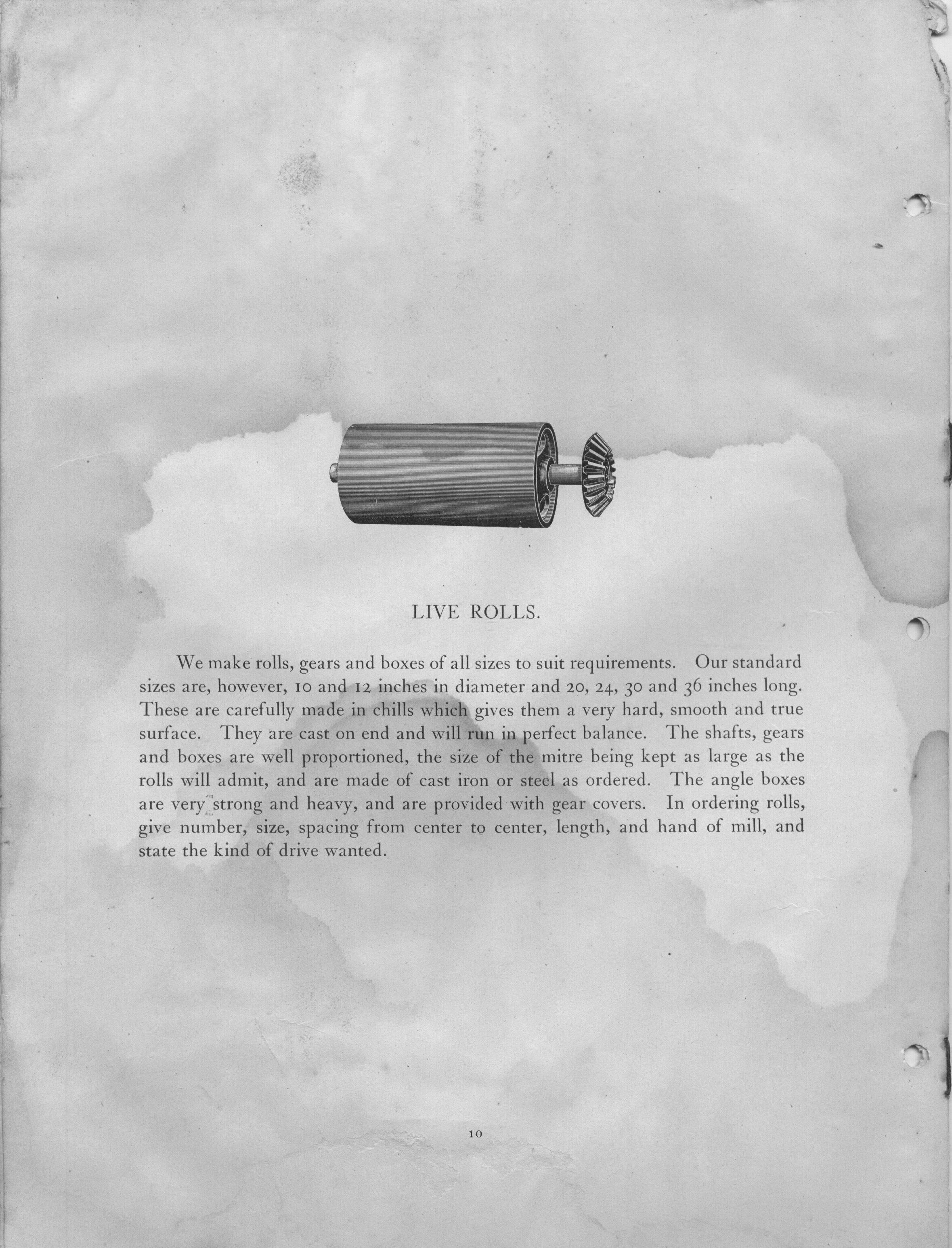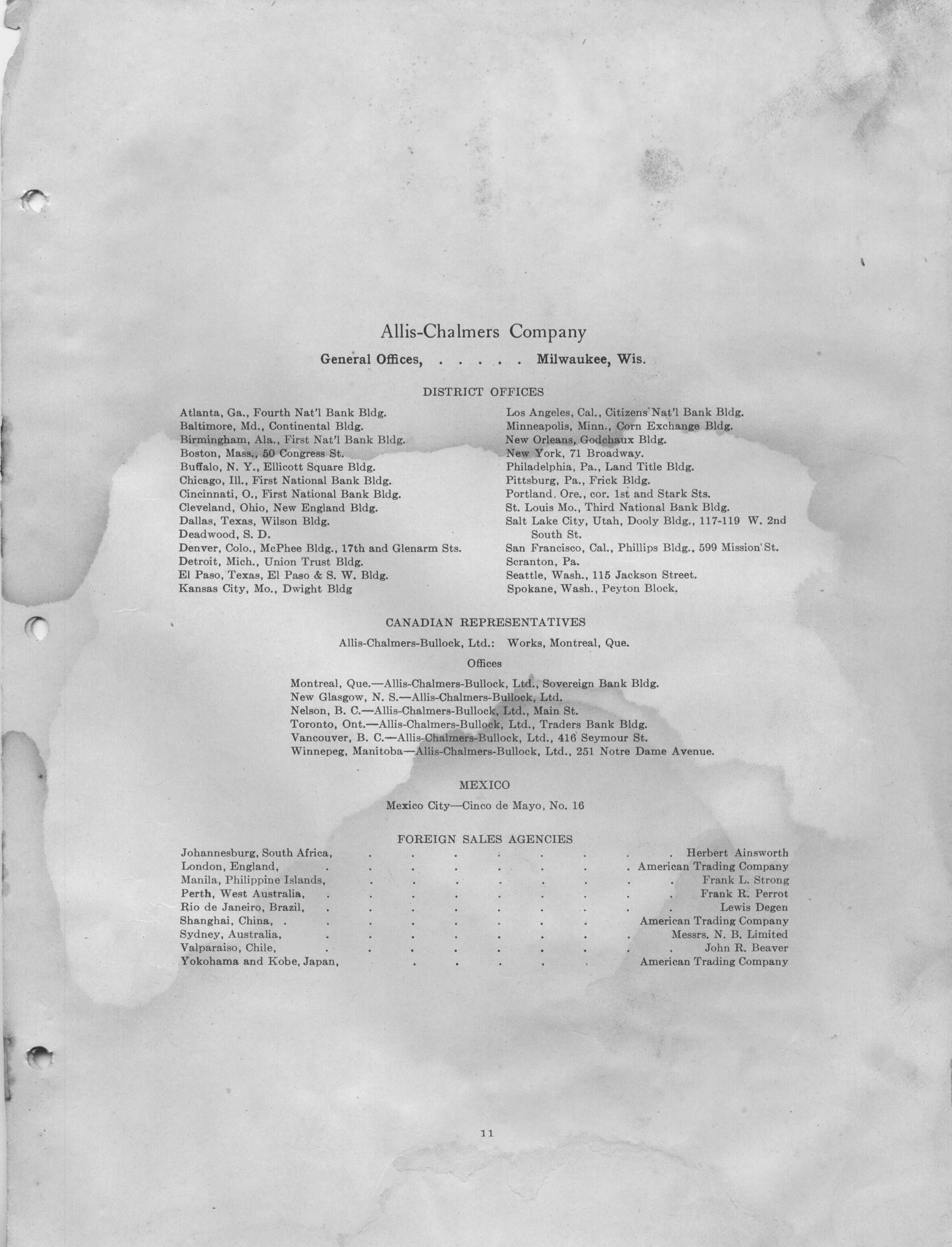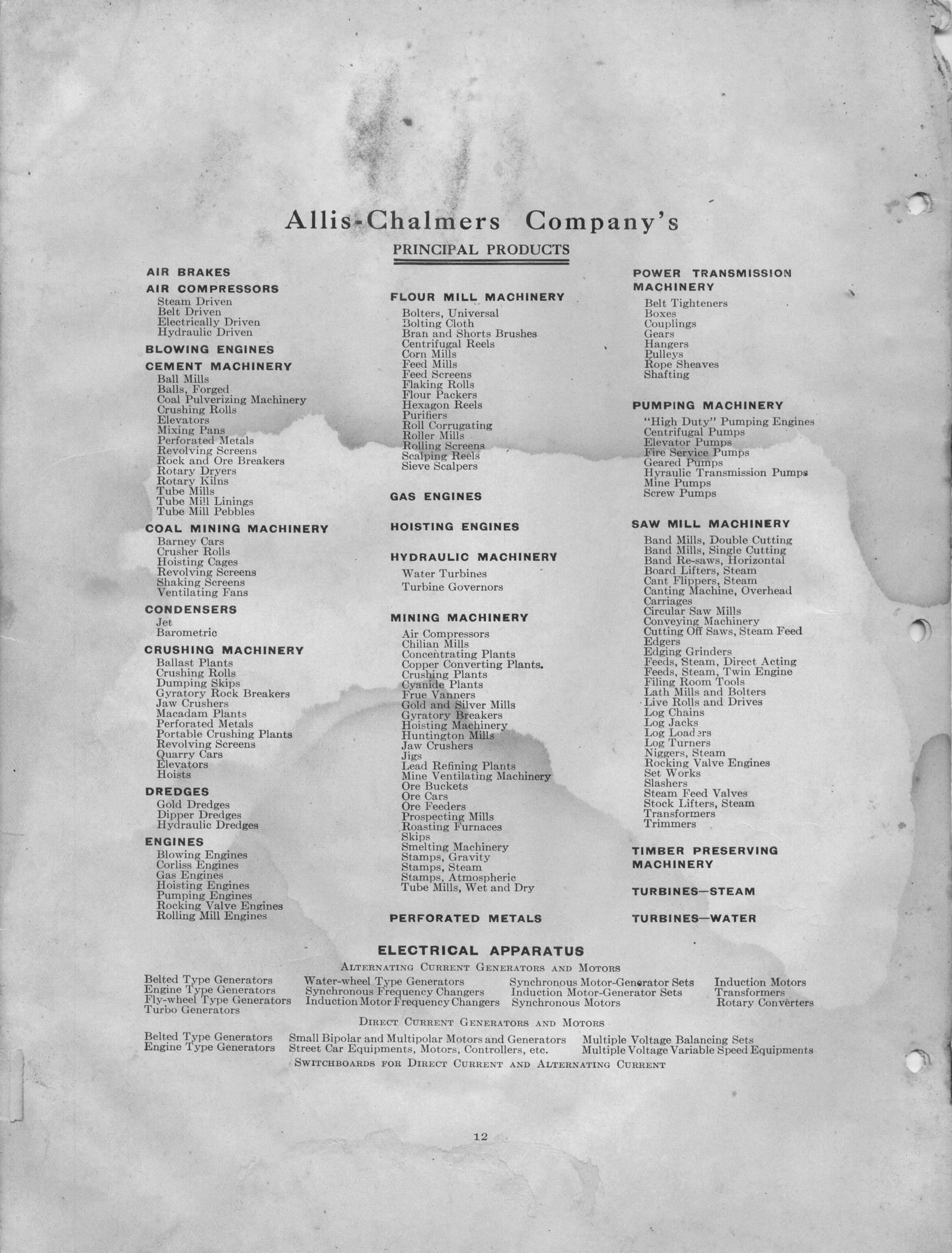 has equipment of air brakes, air compressors, blowing engines, cement machinery, chilled rolls, coal mining machinery, condensers, Corliss engines, crushing machinery, dredges, engines, electrical apparatus (alternating current, direct current, and switchboards for generators and motors), flour mill machinery, gas engines, hoisting engines, hydraulic machinery, mining machinery, perforated metals, power transmission machinery, pumping machinery, rolling mill engines, sugar machinery, sawmill machinery, steam shovels, timber preserving machinery, turbines-steam, and turbines-water
