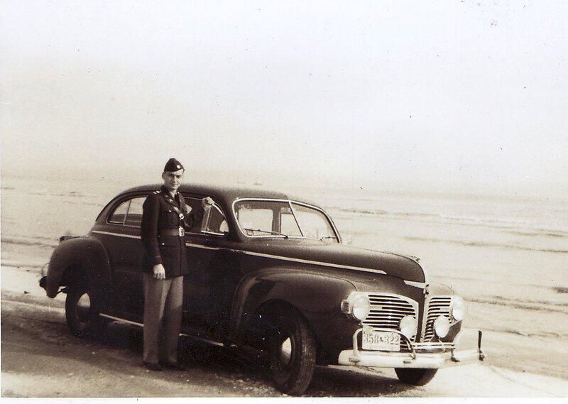 Soldier in parade dress stands beside his car on the bank of a body of water.