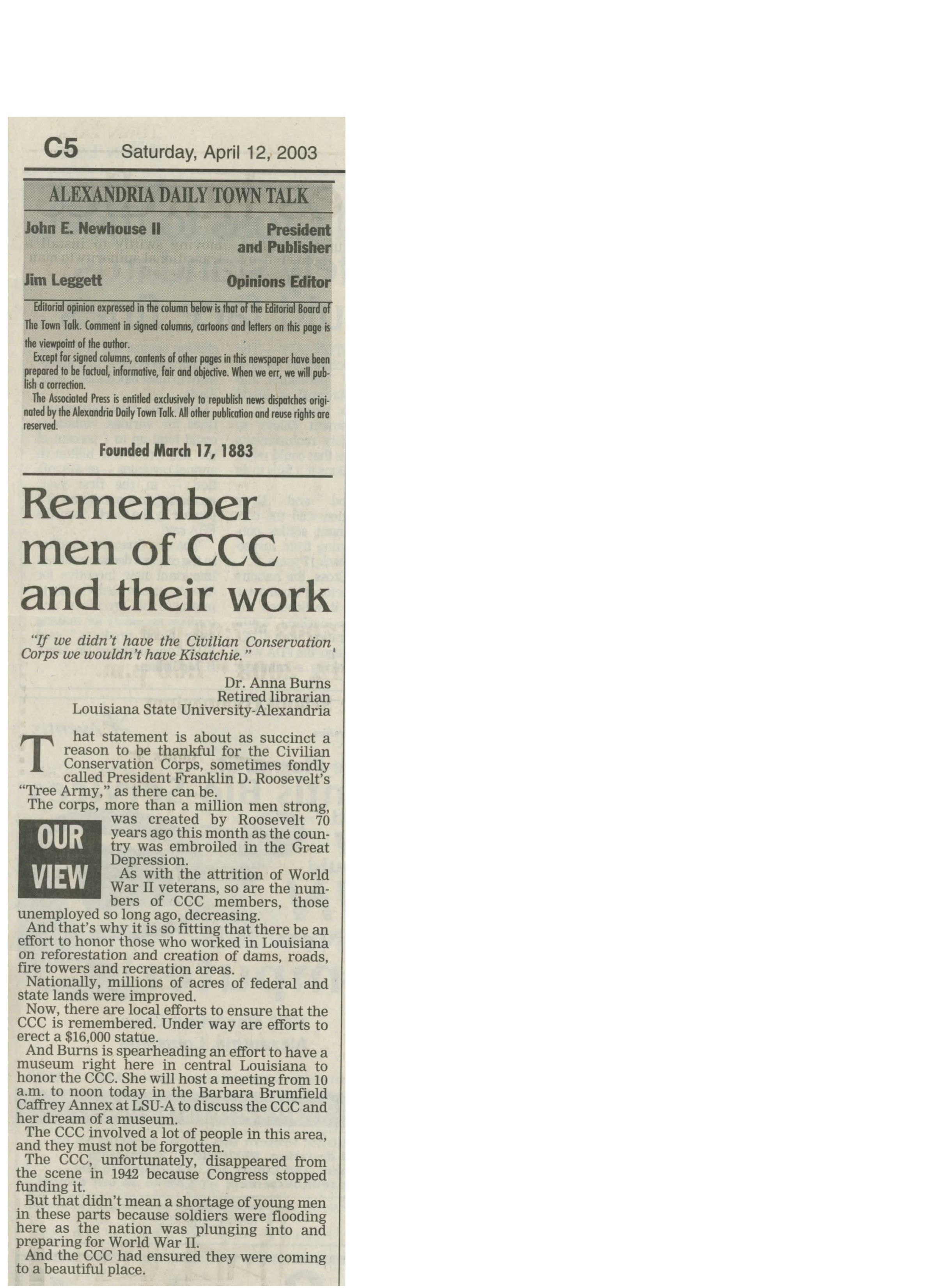 Newspaper clipping "Remember men of CCC and their work;" a call for remembrance of the CCC in the area and a project creating a museum for the CCC by Dr. Burns; From the "Town Talk" from Alexandria, LA; Apr. 12, 2003; written by Dr. Anna BurnsCollection