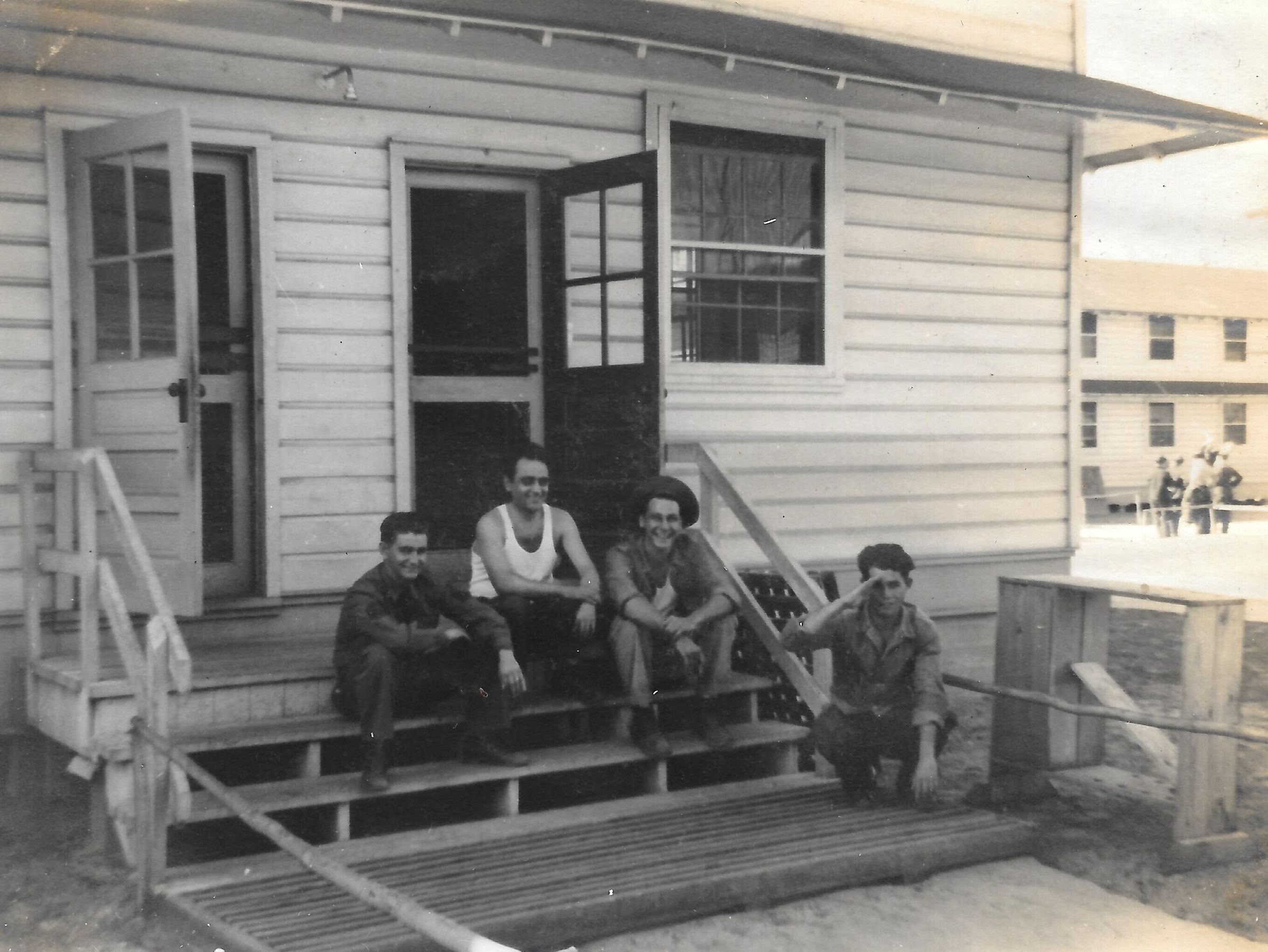 Four soldiers sit on the porch of a barracks building relaxing.Photograph Details