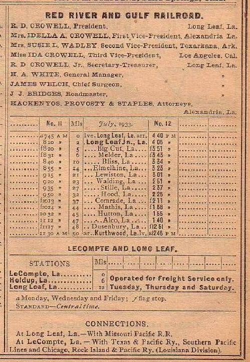 the officials in 1933 were R. D. Crowell president in Long Leaf, H. A. White general manager in Long Leaf, Idella A. Crowell first vice president in Alexandria, Susie L. Wadley second vice president in Texarkana, Ida Crowell third vice president in Los Angeles R. D. Crowell Jr. secretary-treasurer in Long Leaf, Hakenyos, Provosty & Staples attorneys in Alexandria, James Welch chief surgeon in Long Leaf, and J. J. Bridges roadmaster in Long leaf;