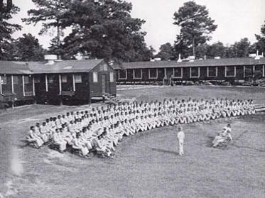 Military camp, ASCS; a camp meeting; CCC boys sitting and listening to two men in center; one standing, the other sittingPhotograph Details