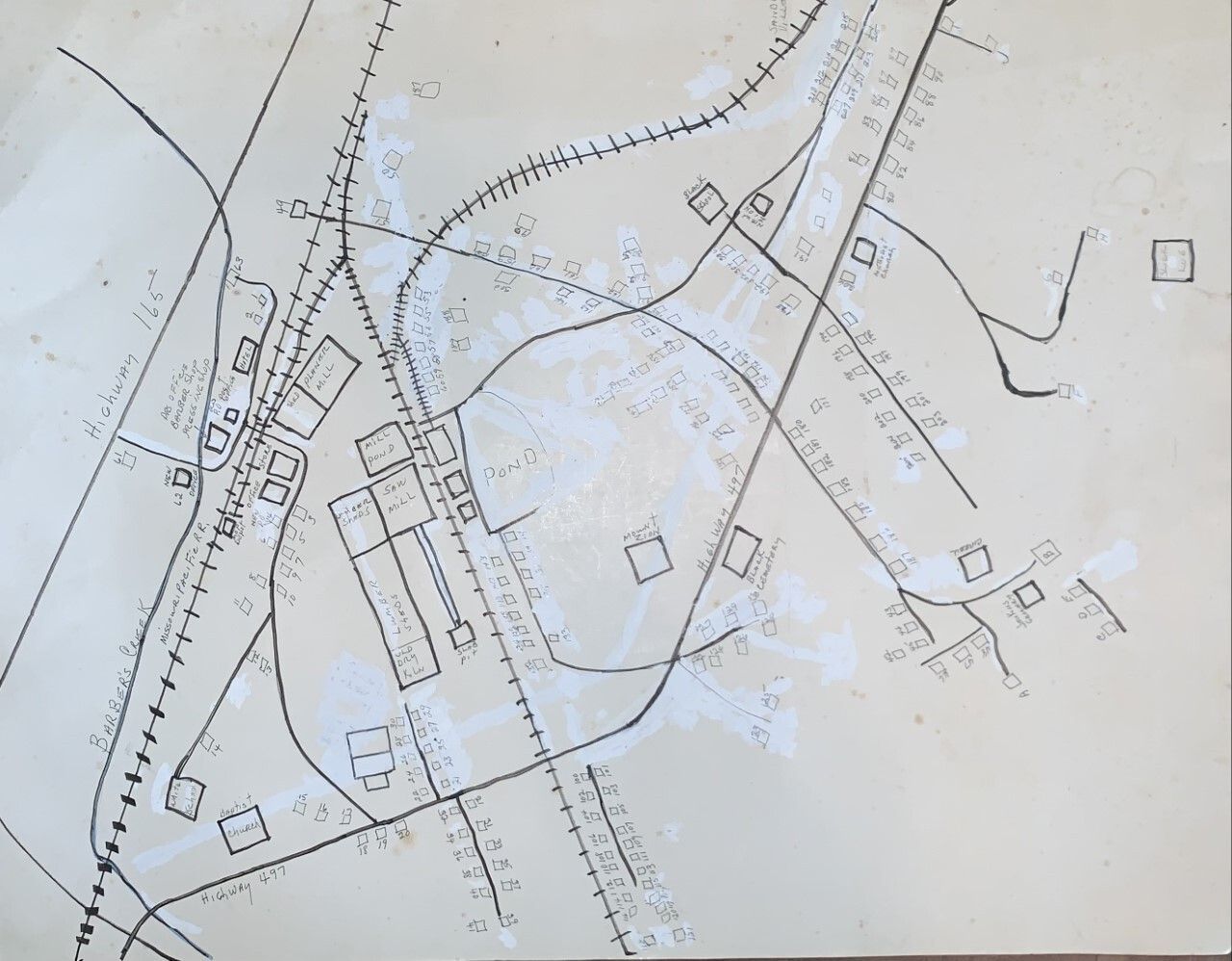 A drawn map of Long Leaf, Louisiana Lumber TownContext