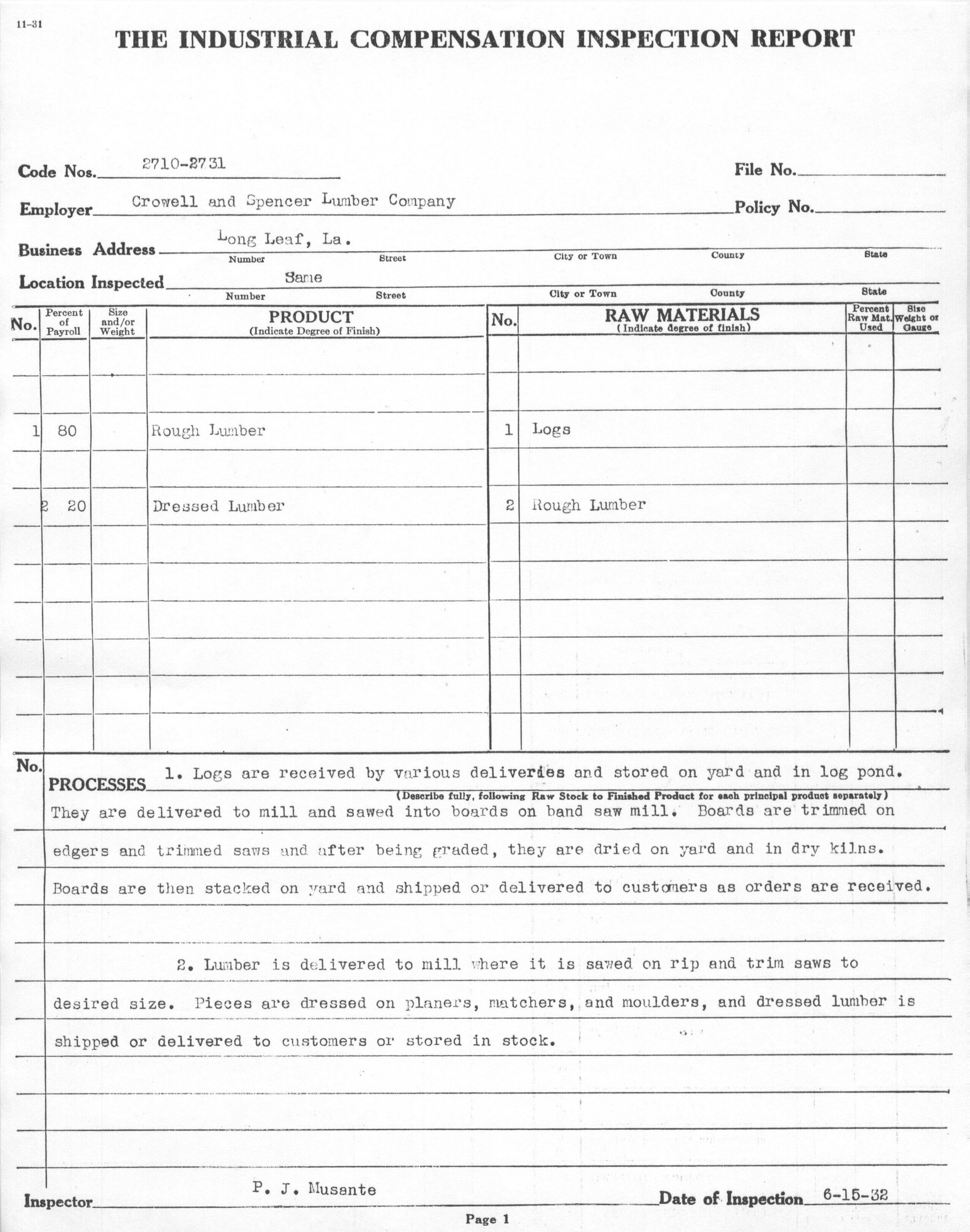 Crowell & Spencer Lumber Company Industrial Compensation Inspection ReportDescription