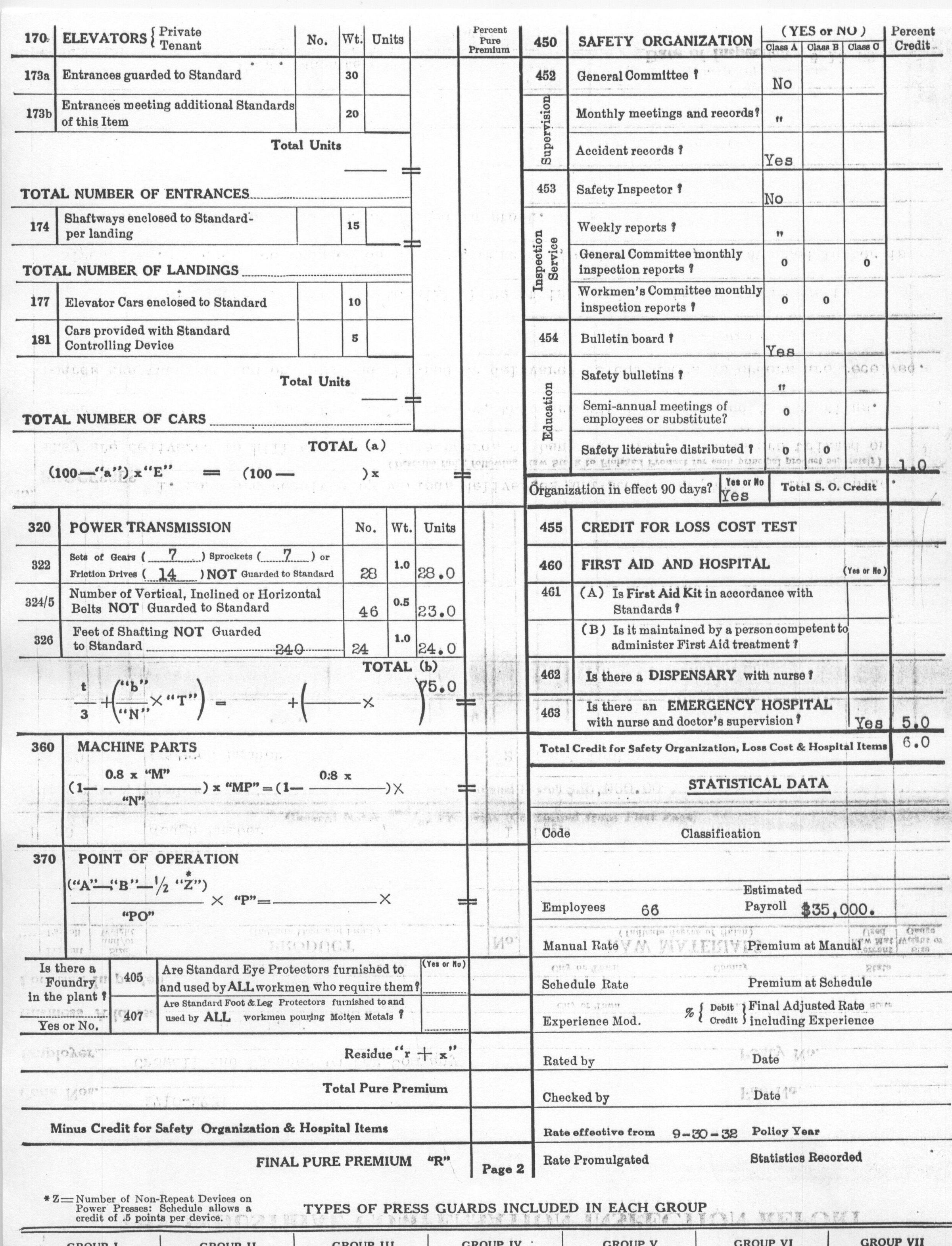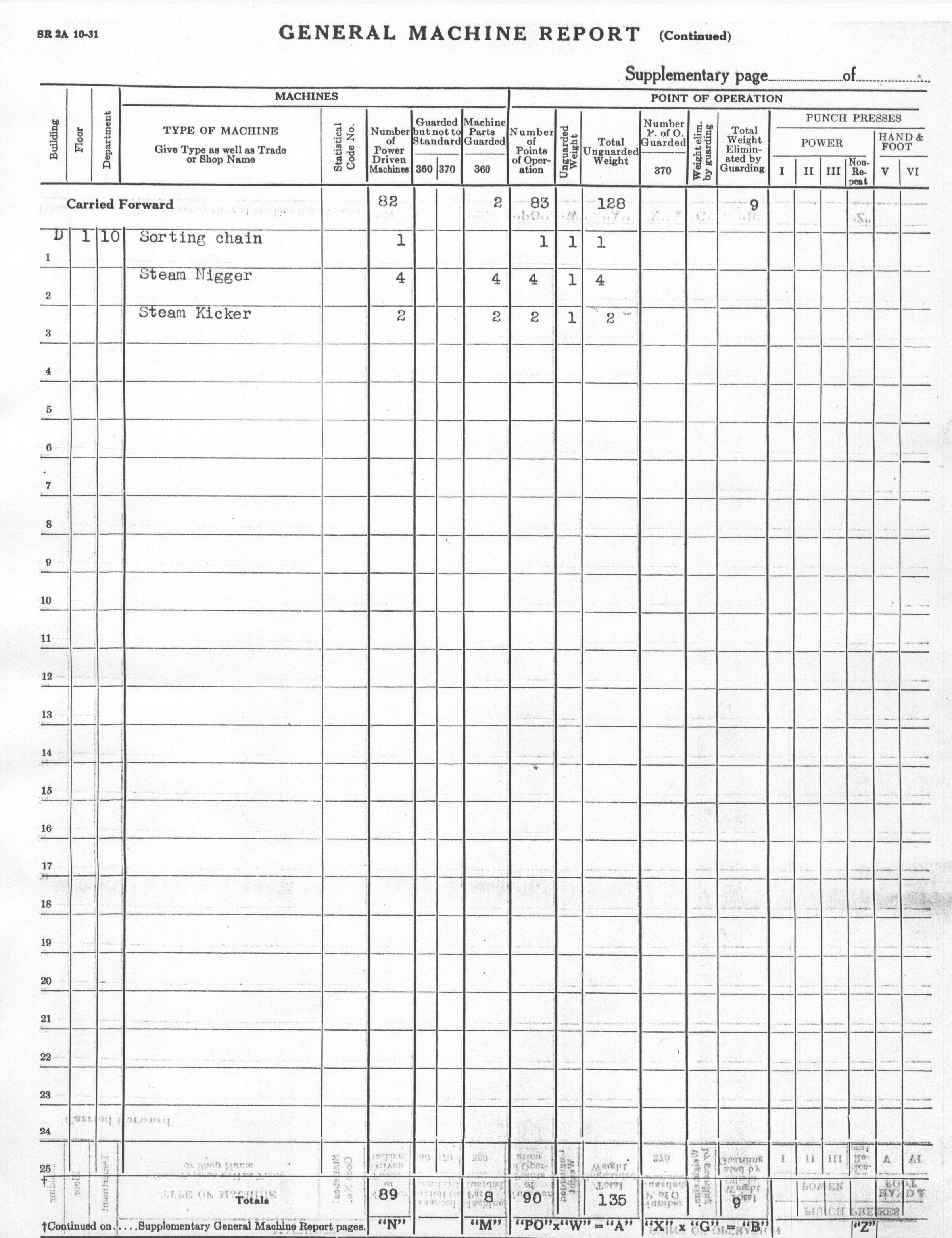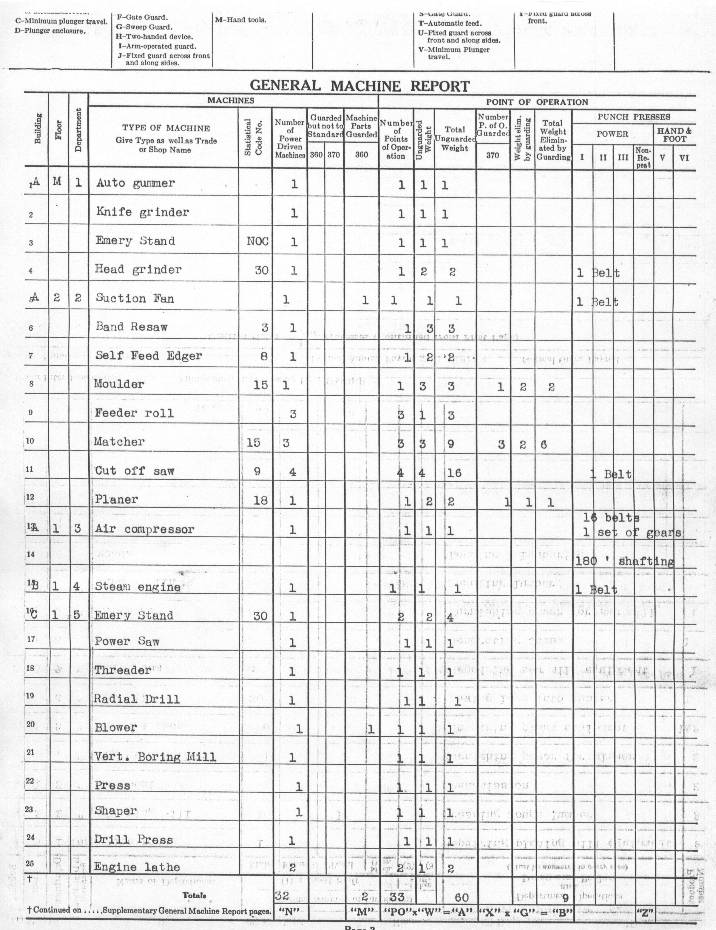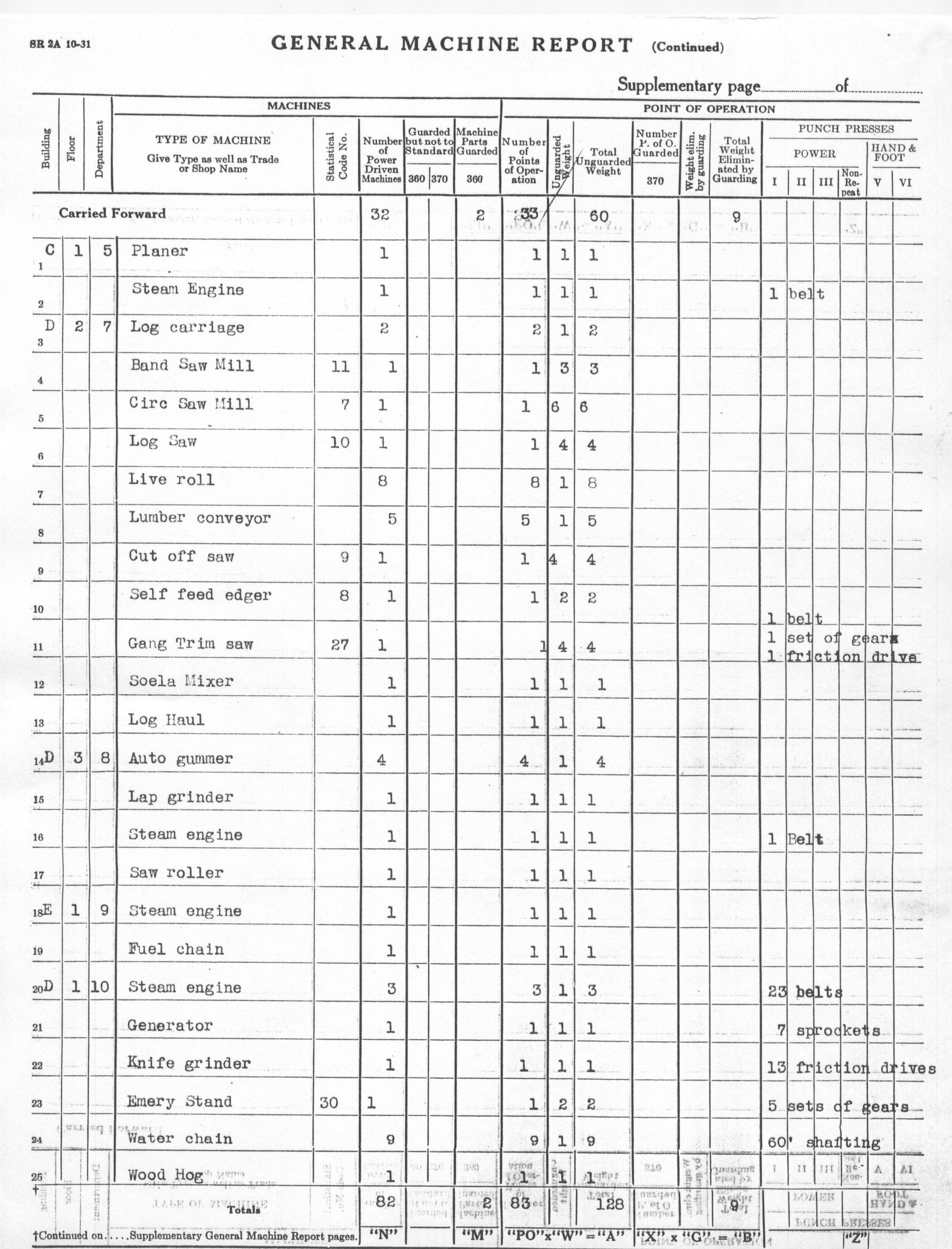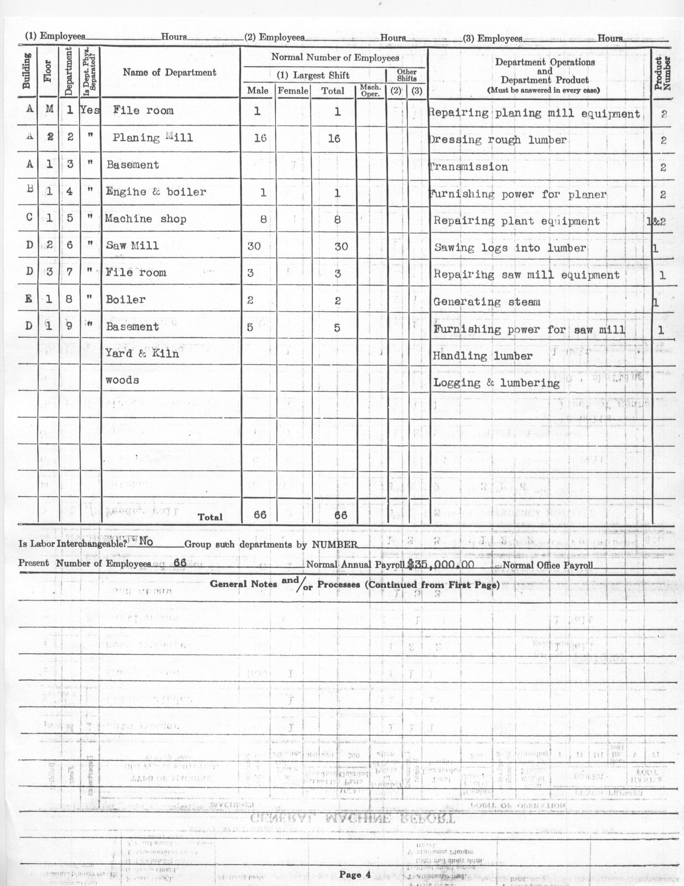 inspector was P. J. Musante; product of rough lumber and dressed lumber; raw materials of logs and rough lumber; describes the process of raw materials to finished product; checked the machines (General Machine Report 3): auto gummer, knife grinder, emery stand, head grinder, suction fan, band resaw, self feed edger, moulder, feeder roll, matcher, cut off raw, planer, air compressor, steam engine, emery stand, power saw, threader, radial drill, blower, vert. boring mill, press, shaper, drill press, engine lathe, planner, steam engine, log carriage, band saw mill, circ saw mill, log saw, live roll, lumber conveyor, cut off saw, self feed edger, gang trim saw, soela mixer, log haul, auto gummer, lap grinder, steam engine, saw roller, steam engine, fuel chain, generator, knife grinder, emery stand, water chain, wood hog, sorting chain, steam nigger, and steam kicker ; total of 33 machines; Employees Department 4; 11 departments of file room, planning mill, basement, engine & boiler, machine shop, saw mil, file room, boiler, basement, yard & kiln, woods; department operations: repairing planning mill equipment, dressing rough lumber, transmission, furnishing power for planer, repairing plant equipment, sawing logs into lumber, repairing saw mill equipment, generating steam, furnishing power for saw mill, handling lumber, and logging & lumbering; total of 66 employees; a summary page of the inspectionCreator