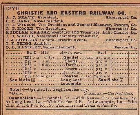 the officials in 1925 were A. J. Peavy president at Shreveport, C. C. Cray vice president at Shreveport, R. J. Wilson vice president and general manger at Peason, R. T. Moore vice president at Shreveport, Rudolph Krause secretary and treasurer at Lake Charles, J. S. Welsh assistant secretary-treasurer at Lake Charles, T. J. Shelton general freight agent at Shreveport, T. E. Trigg auditor at Shreveport, D. L. Handley superintendent at Peason;