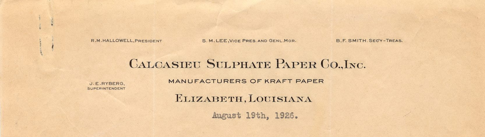 Letterhead from Calcasieu Sulphate Paper Co., Inc. Aug 19, 1926Context