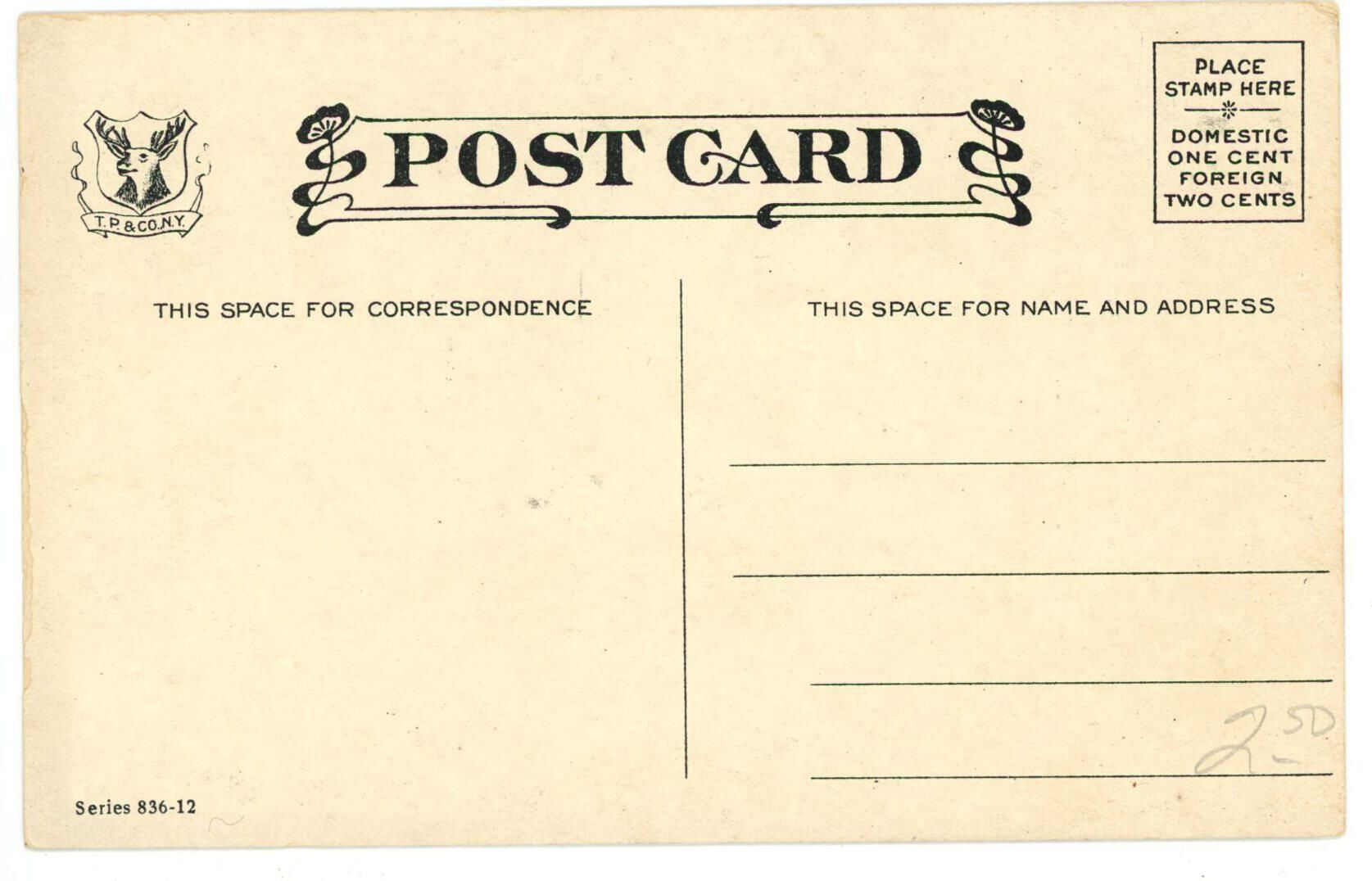 POST CARD: This Space for Correspondence/This Space for Name and Address / Place Stamp here: Domestic One Cent, Foreign Two CentsLanguage