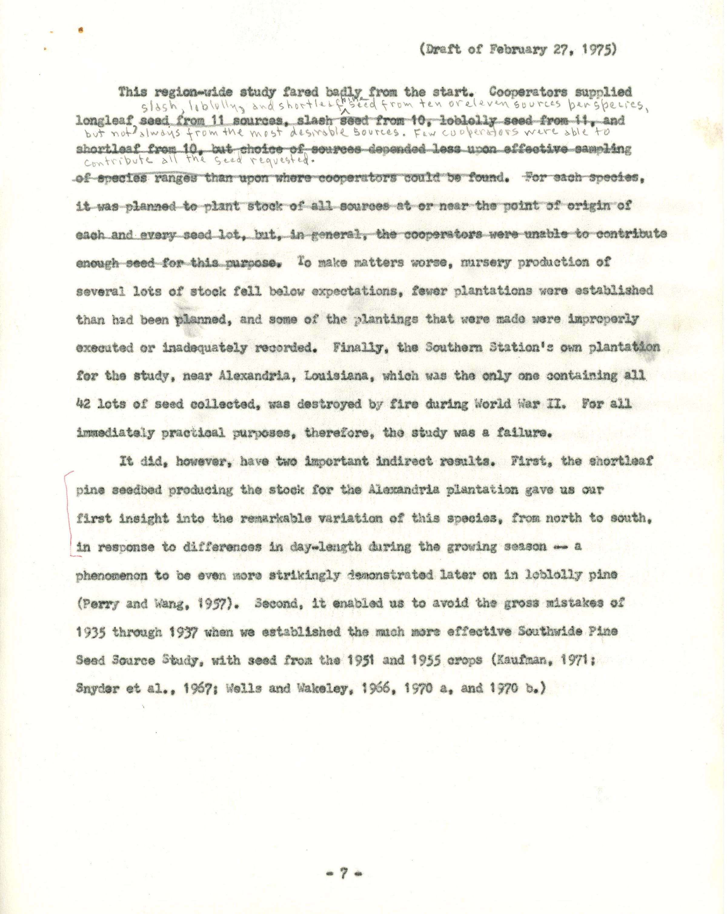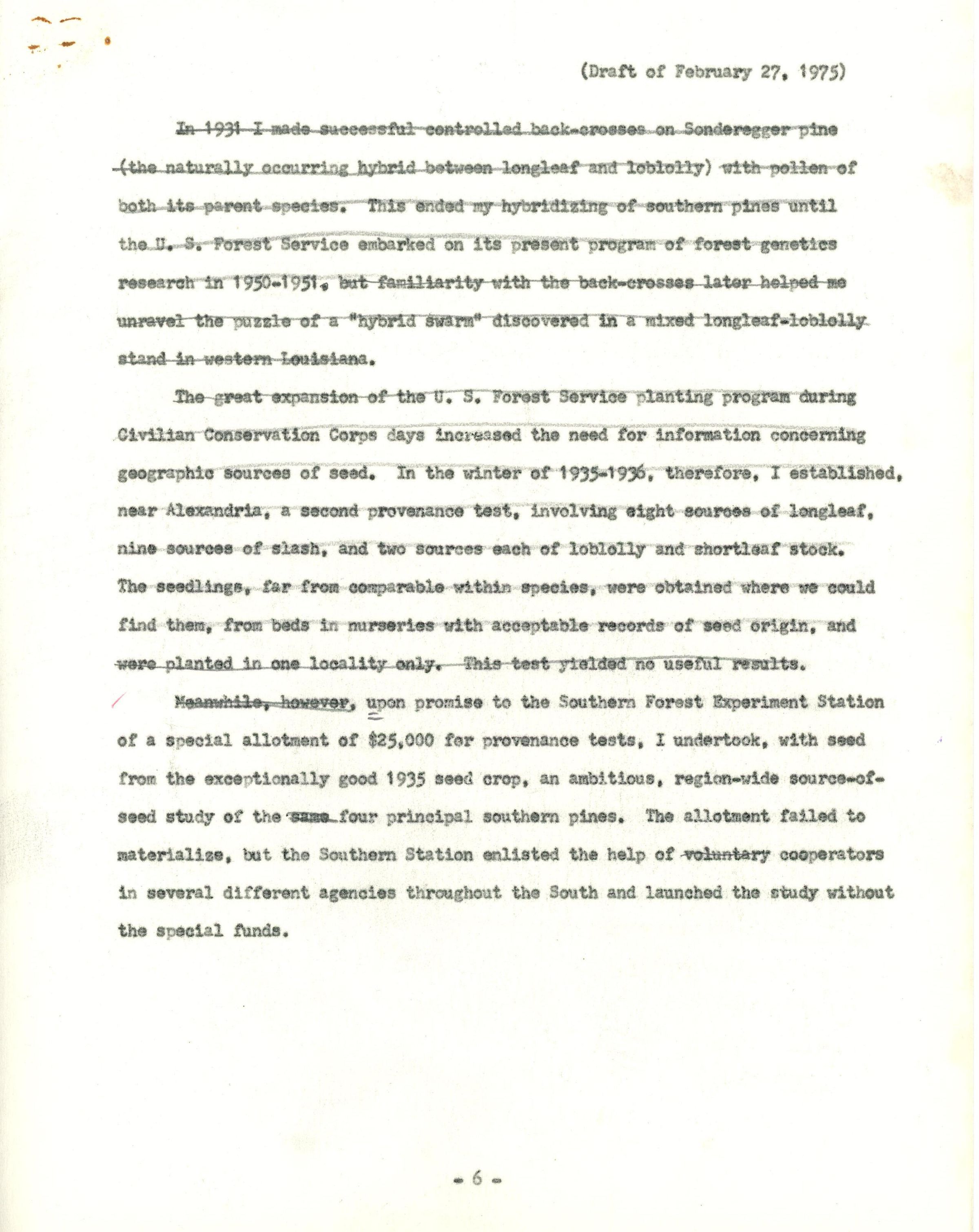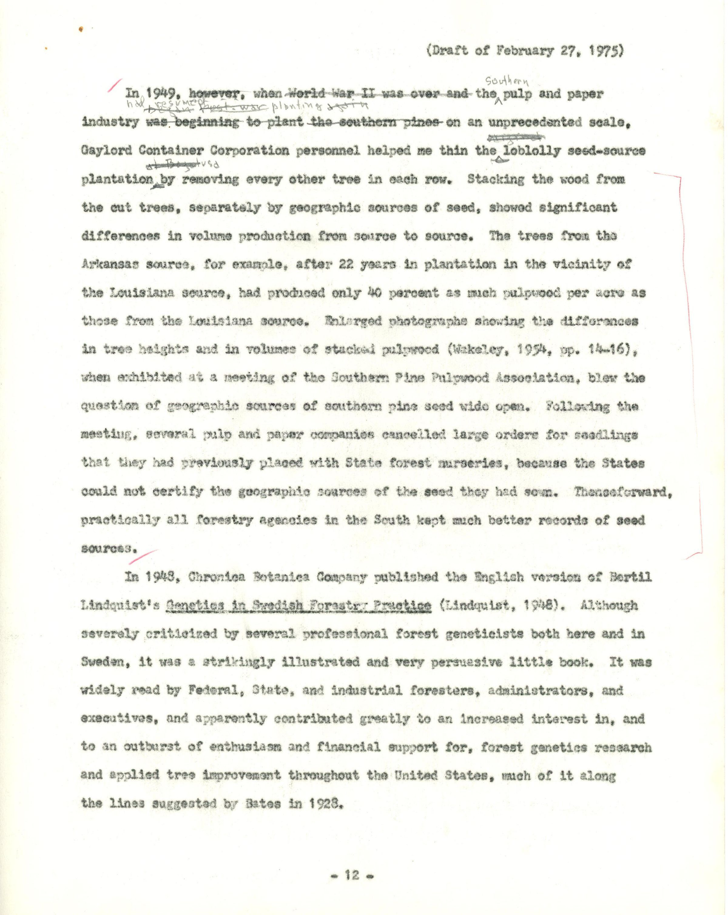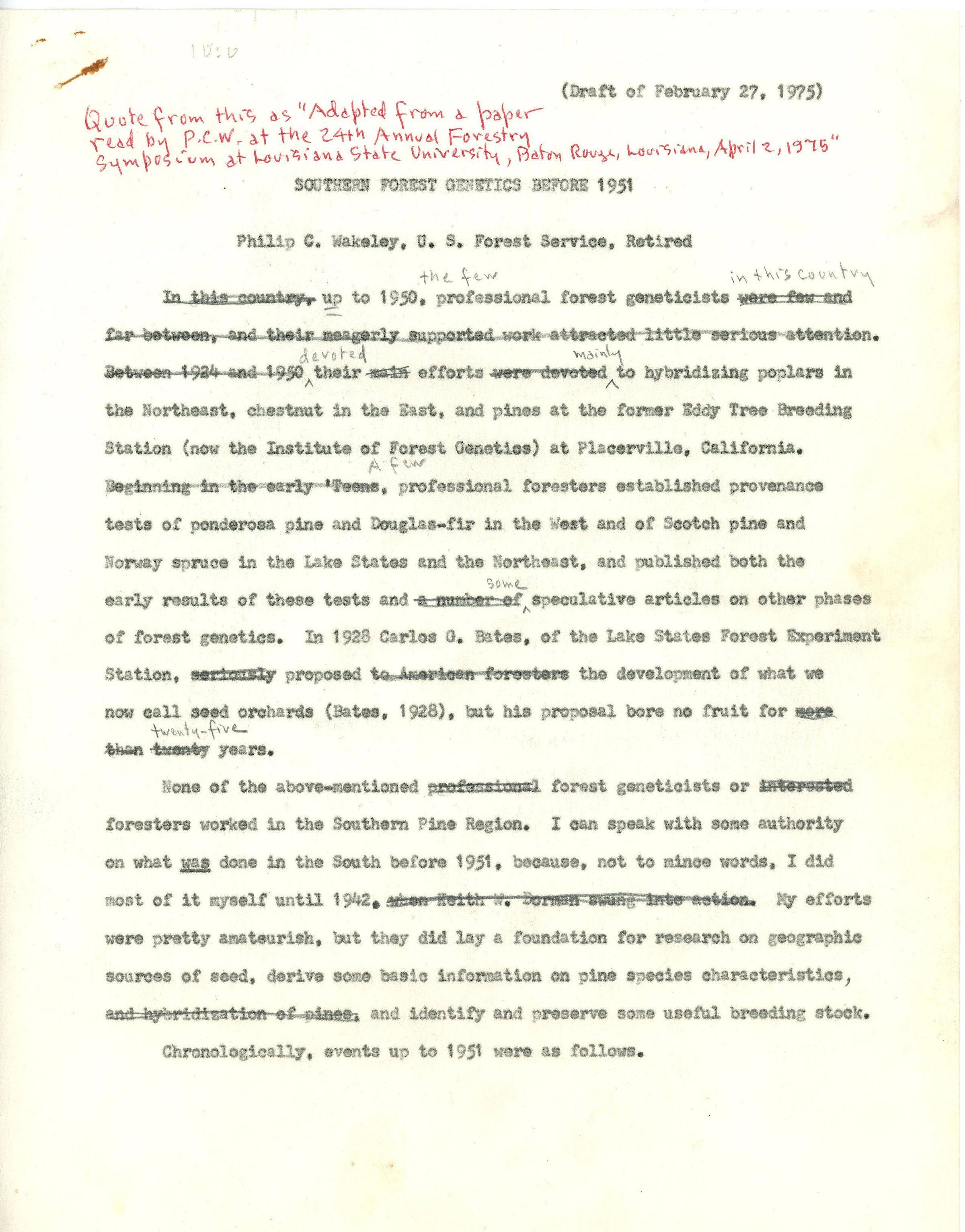 Wakleley describes what he did in the Southern Pine Region regarding breeding stock and laying the foundation for after 1950 with southern forest genetics; written corrections in red pencil or a #2 pencil; eventually published in the Forest Tree Improvement--the Third DecadeCreator