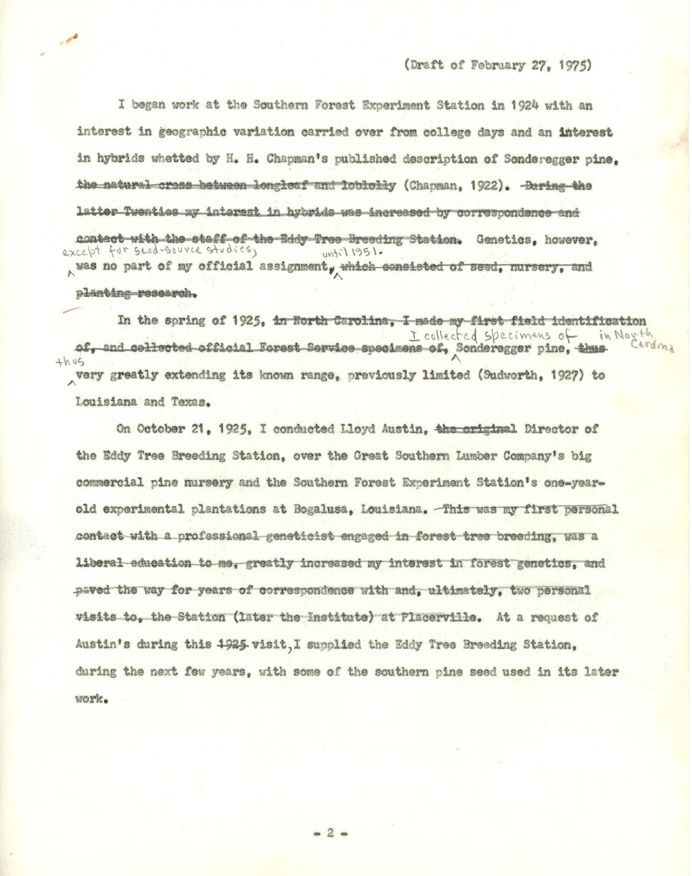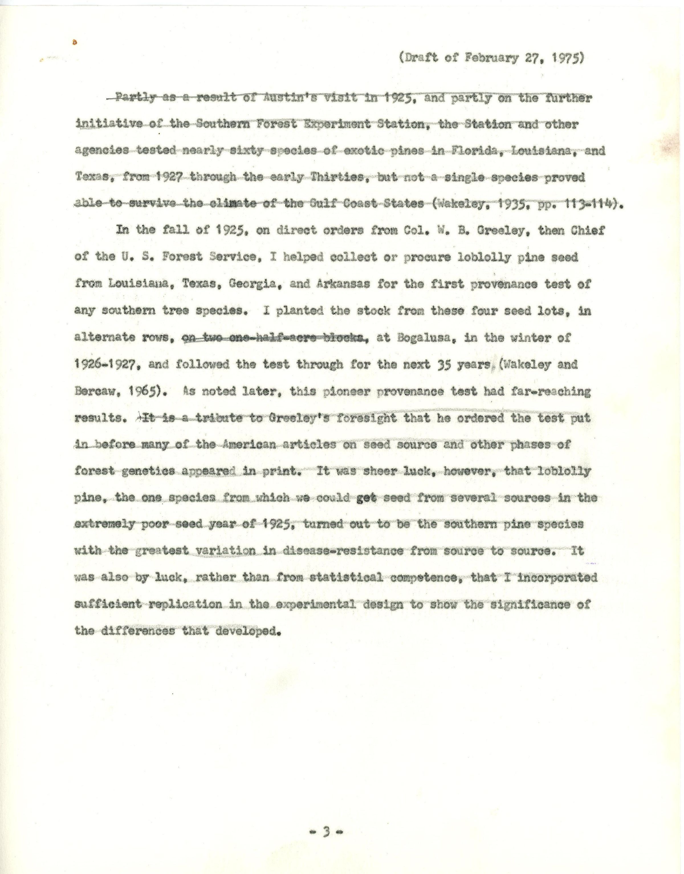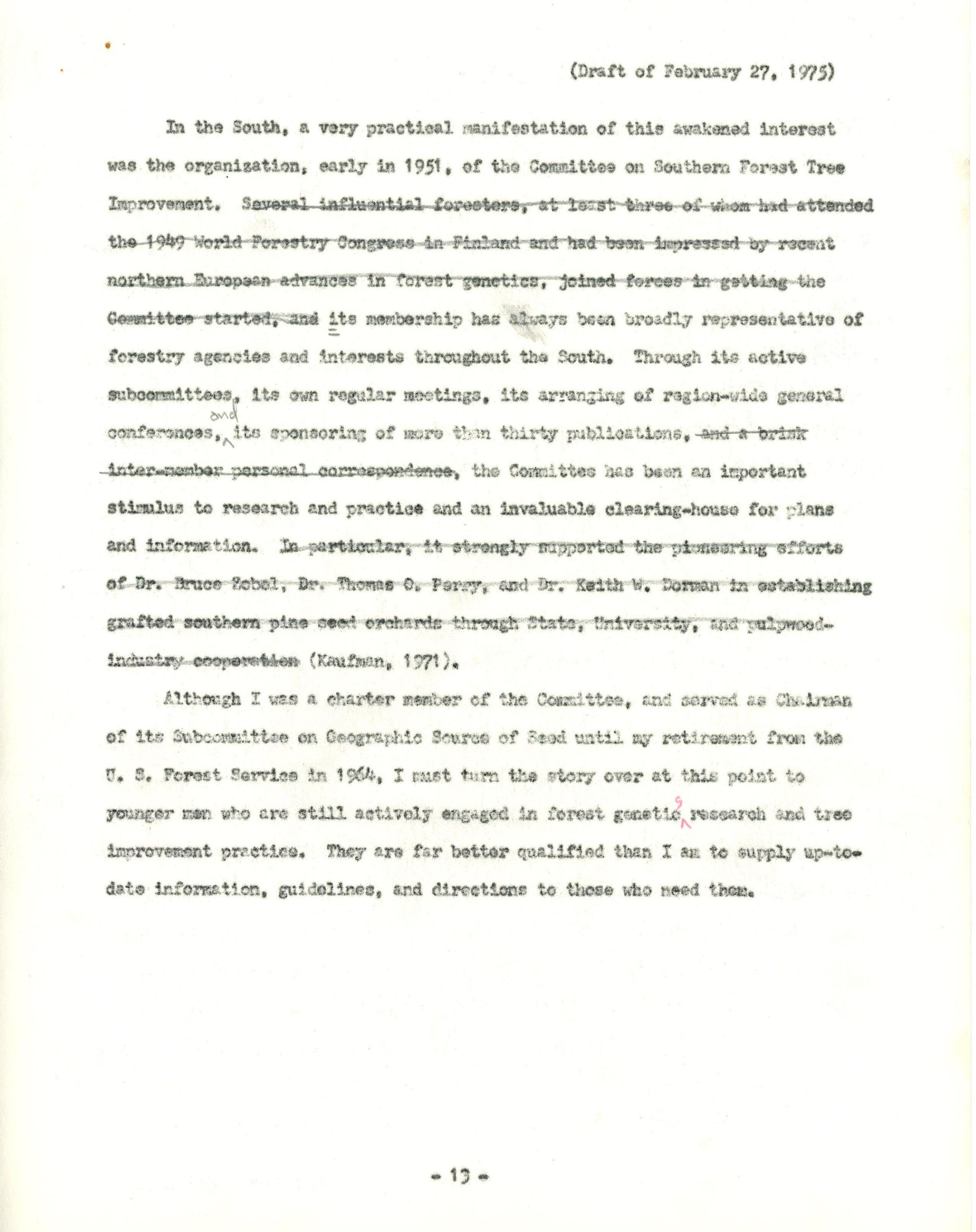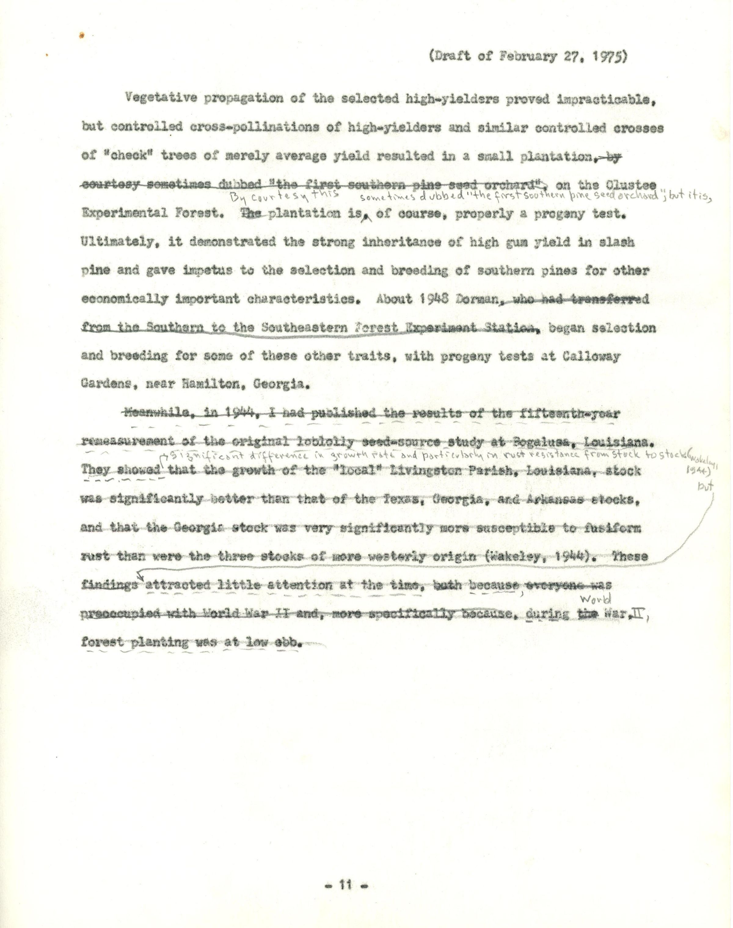 Wakleley describes what he did in the Southern Pine Region regarding breeding stock and laying the foundation for after 1950 with southern forest genetics; written corrections in red pencil or a #2 pencil; eventually published in the Forest Tree Improvement--the Third DecadeCreator
