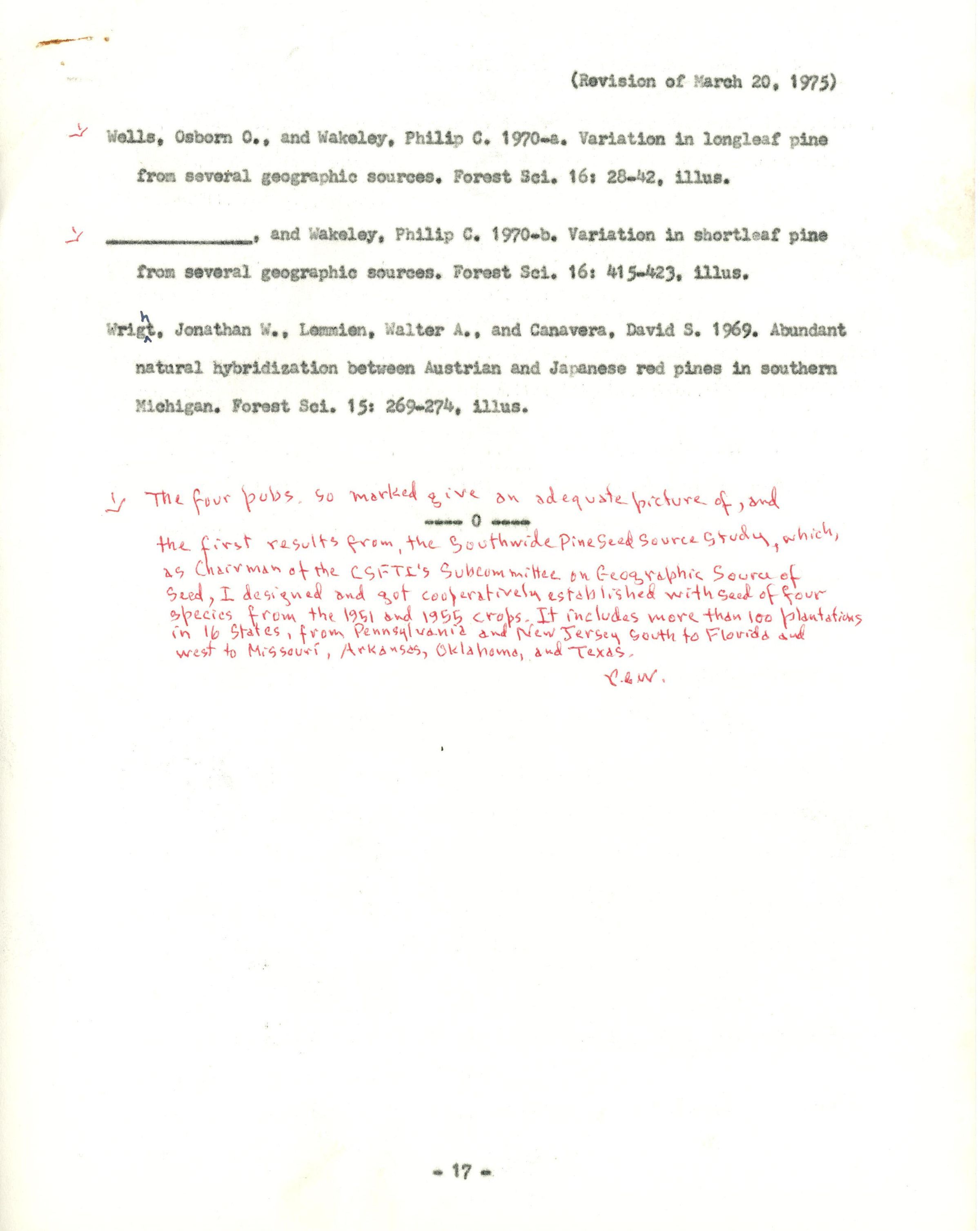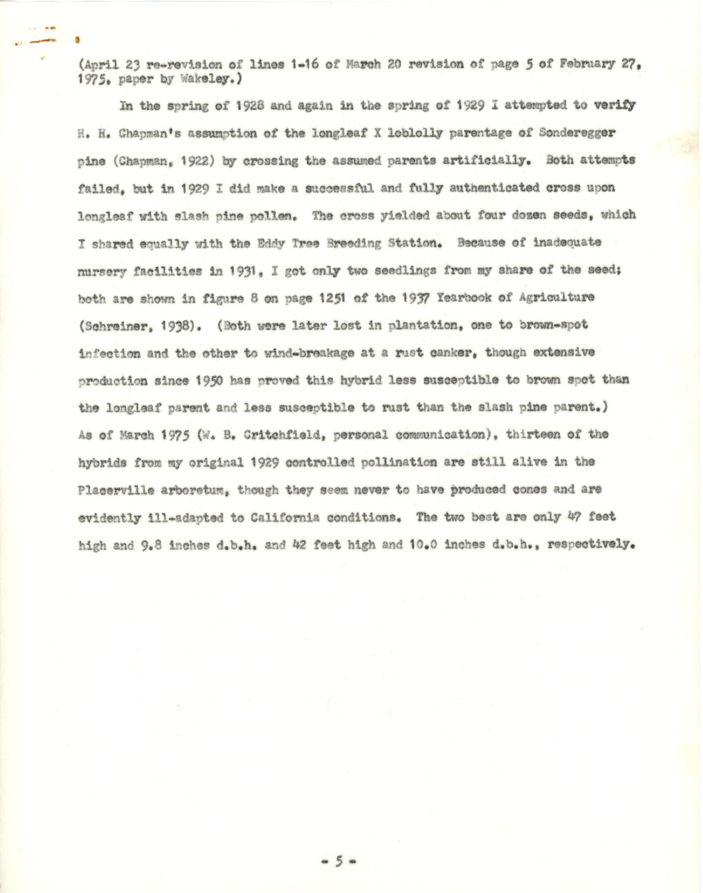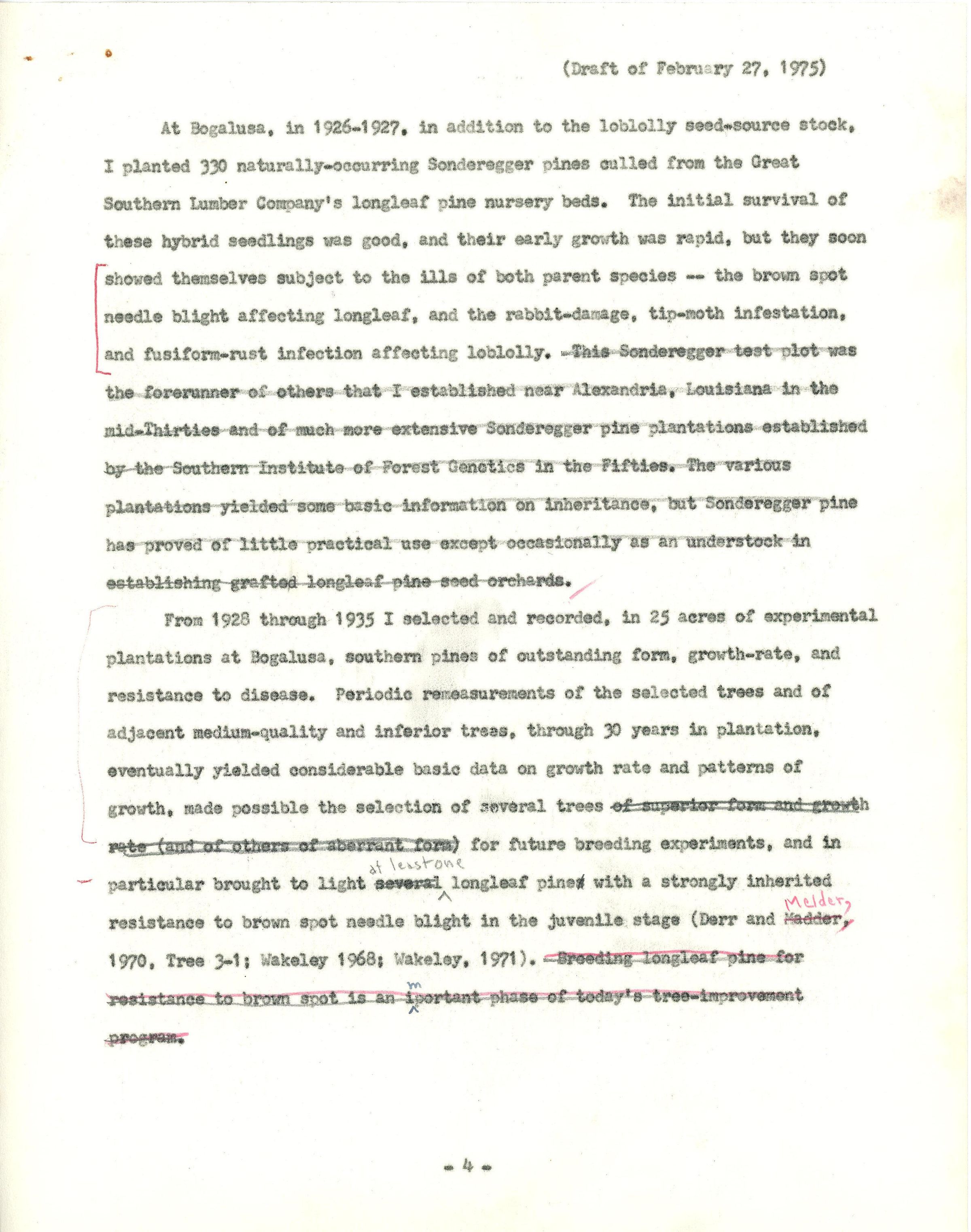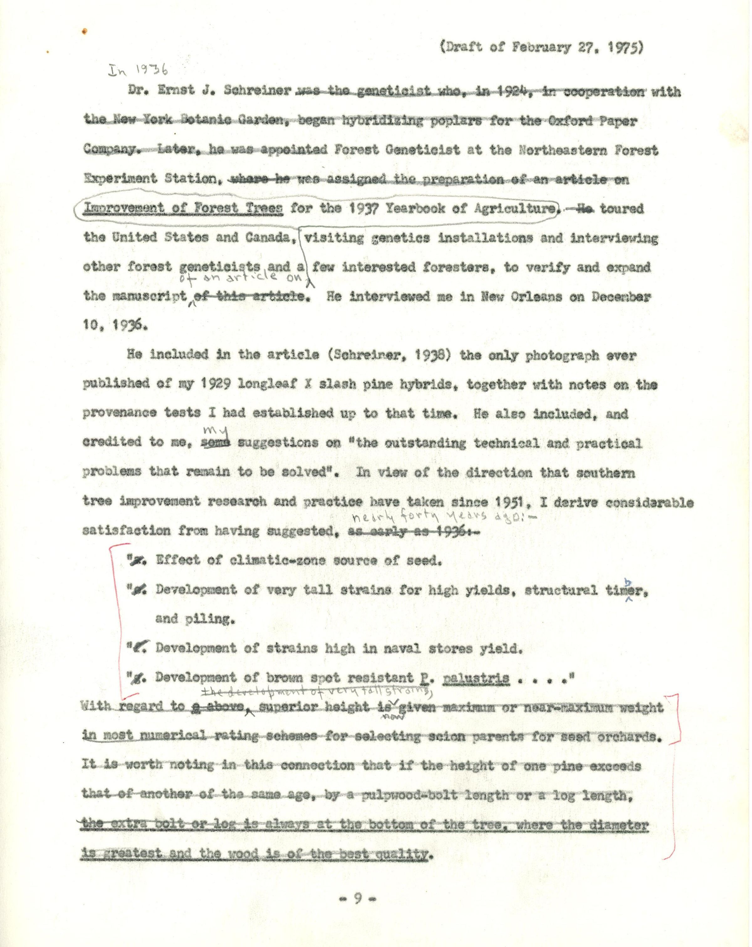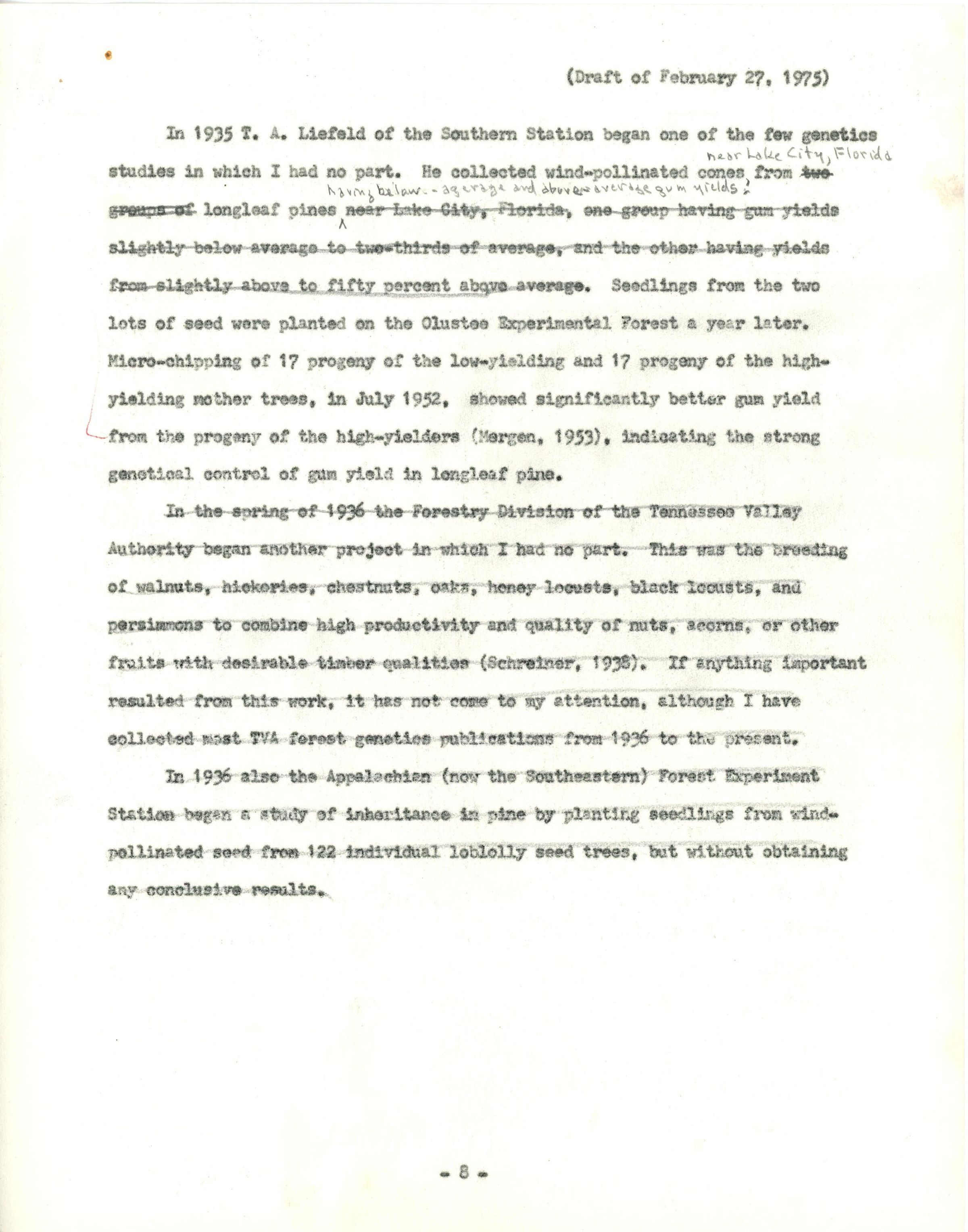 Wakleley describes what he did in the Southern Pine Region regarding breeding stock and laying the foundation for after 1950 with southern forest genetics; written corrections in red pencil or a #2 pencil; eventually published in the Forest Tree Improvement--the Third DecadeCreator