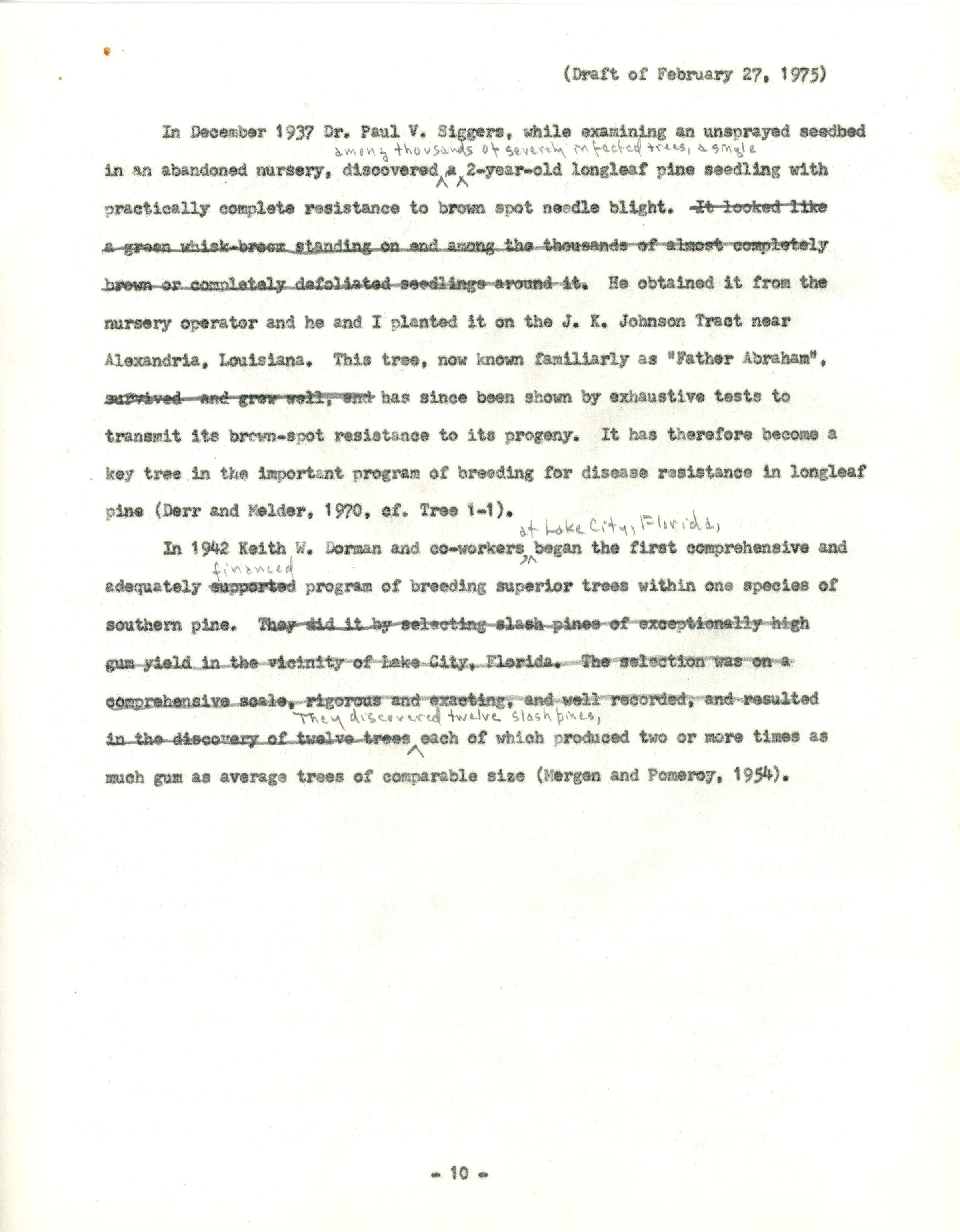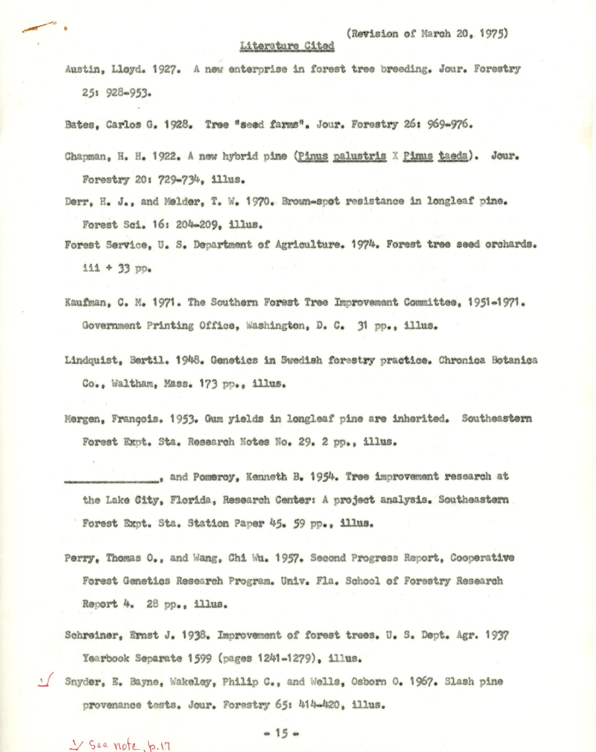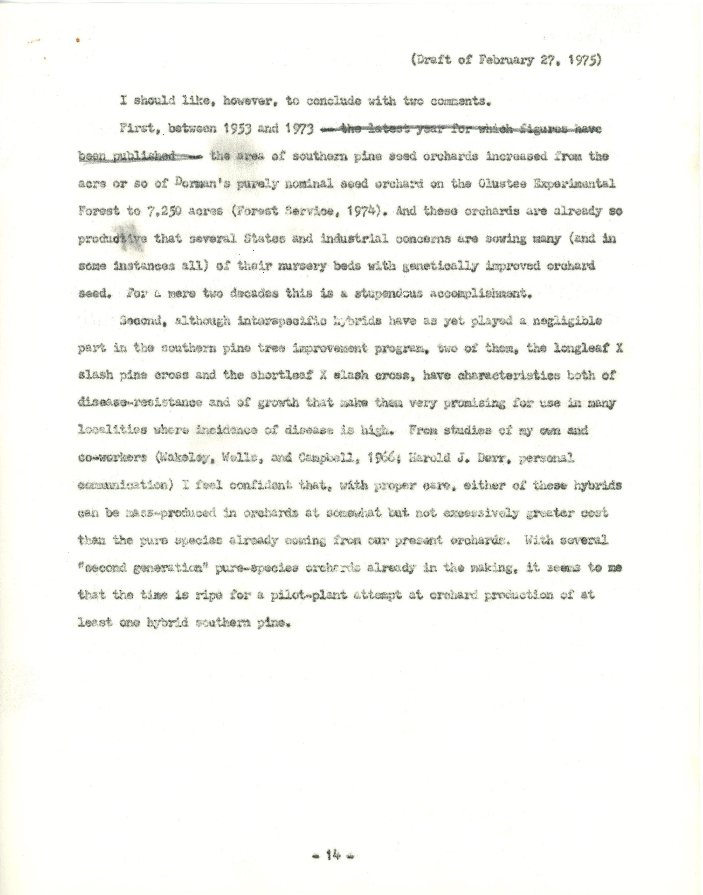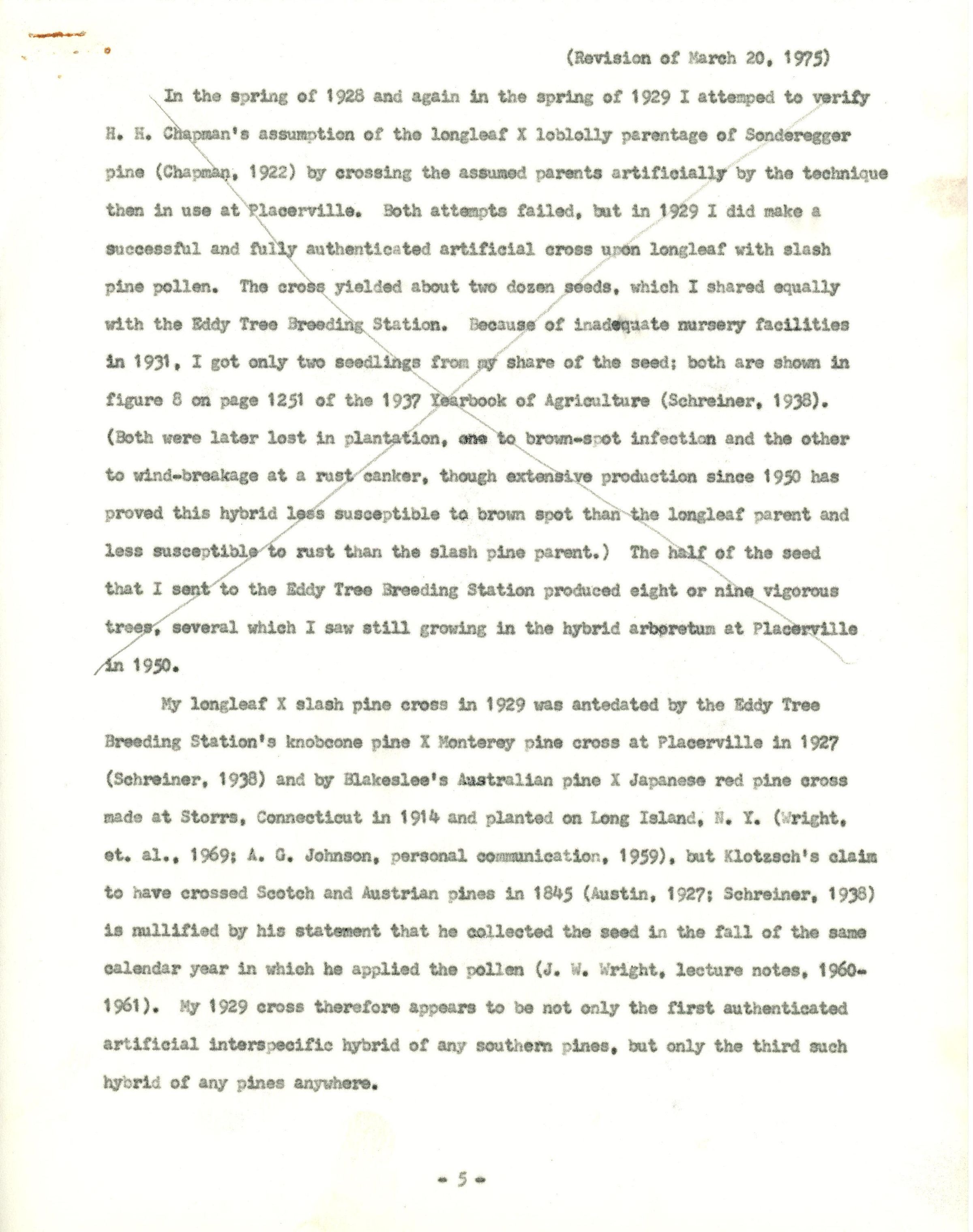 Wakleley describes what he did in the Southern Pine Region regarding breeding stock and laying the foundation for after 1950 with southern forest genetics; written corrections in red pencil or a #2 pencil; eventually published in the Forest Tree Improvement--the Third DecadeCreator