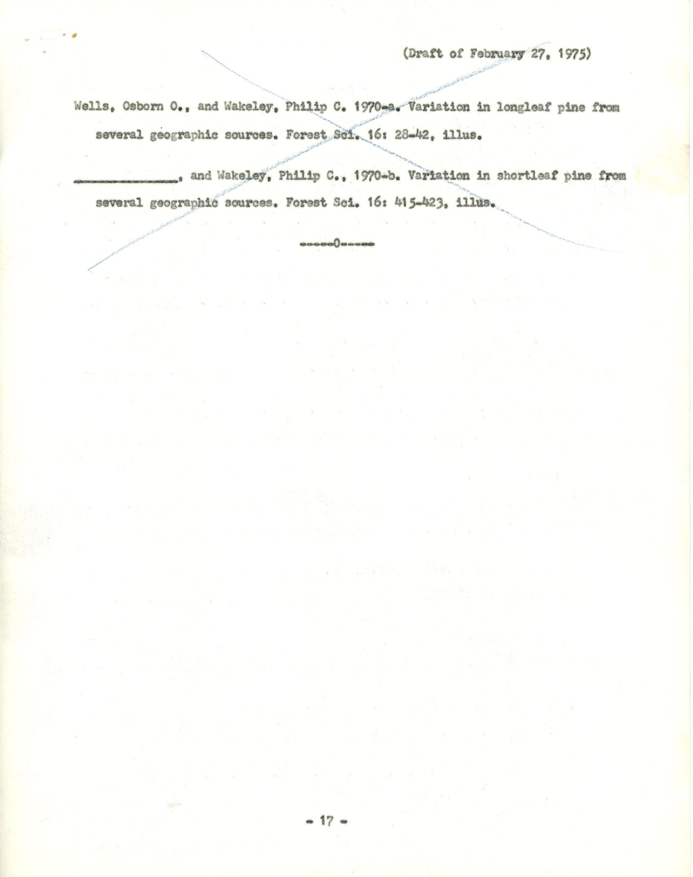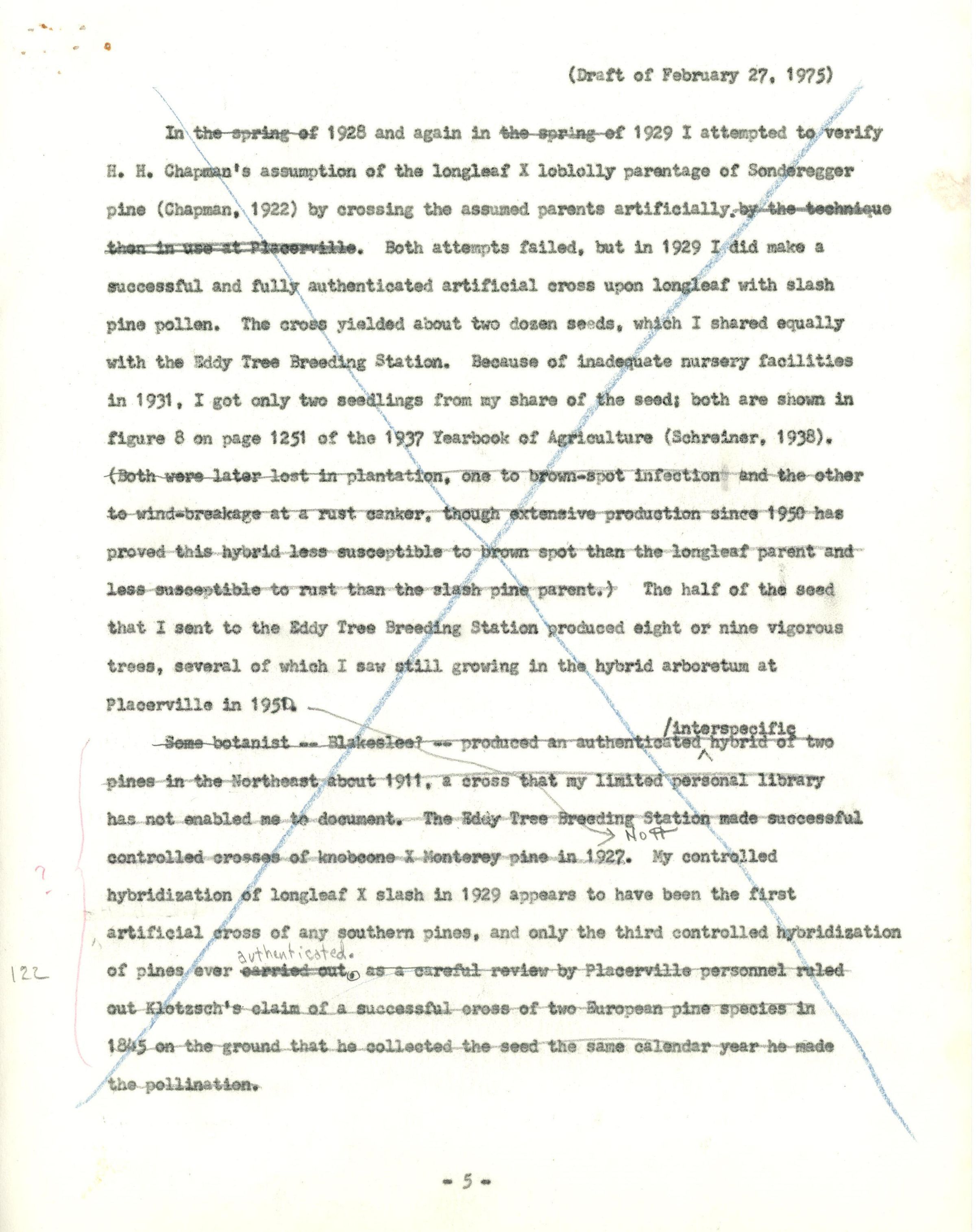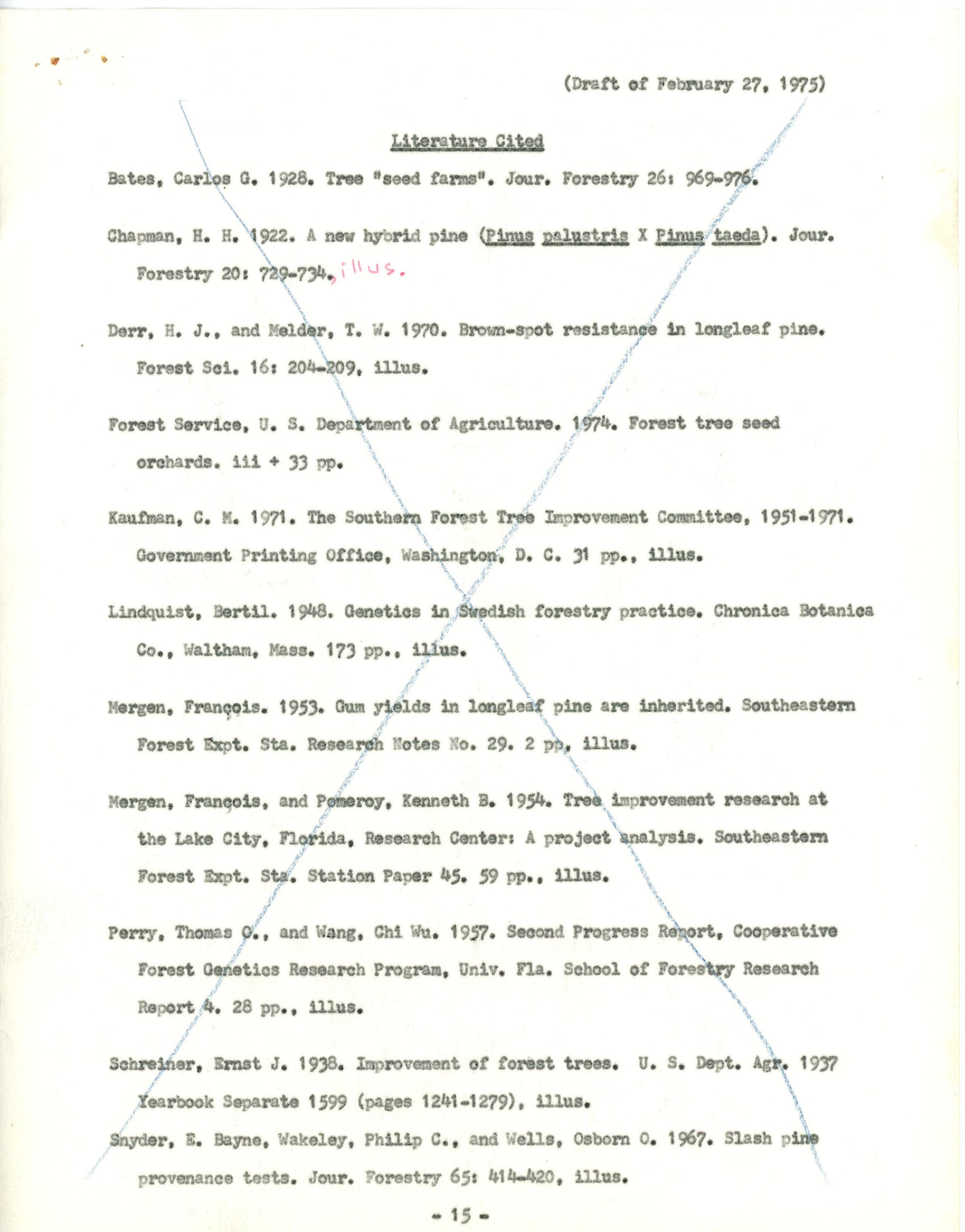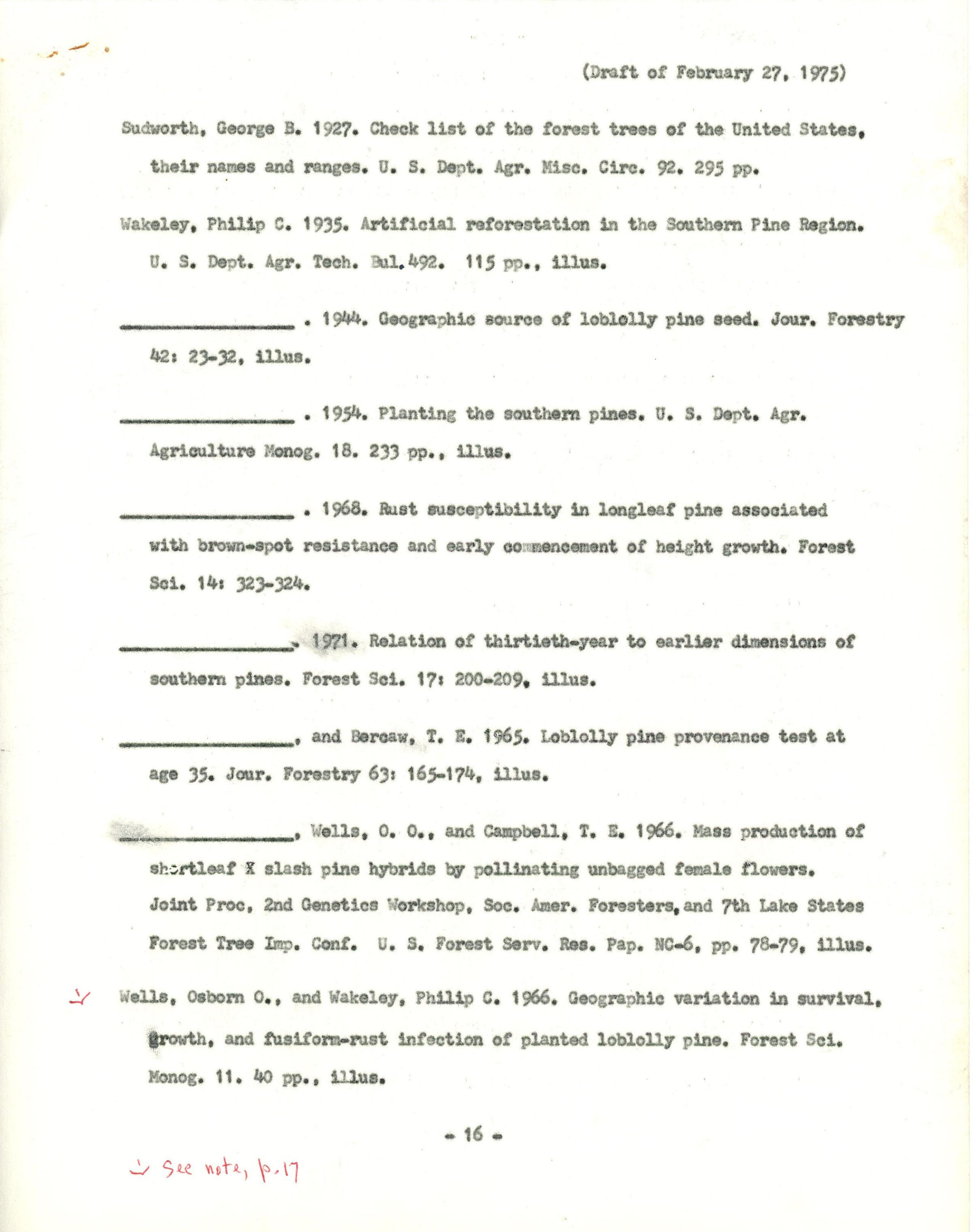 Wakleley describes what he did in the Southern Pine Region regarding breeding stock and laying the foundation for after 1950 with southern forest genetics; written corrections in red pencil or a #2 pencil; eventually published in the Forest Tree Improvement--the Third DecadeCreator