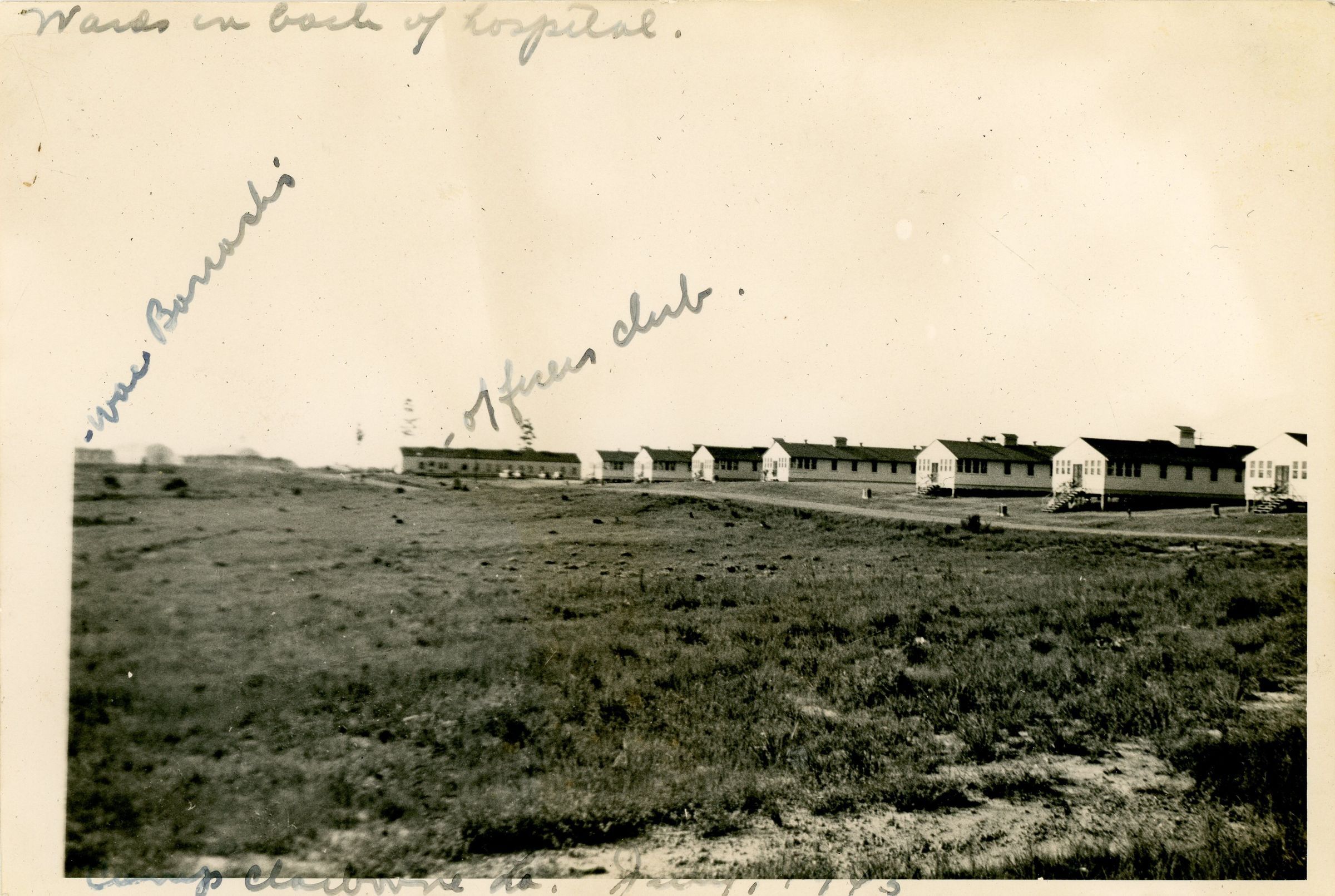Photo of wards in back of the hospital of Camp Claiborne, with handwritten inscriptions, July 1943Photograph Details