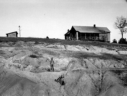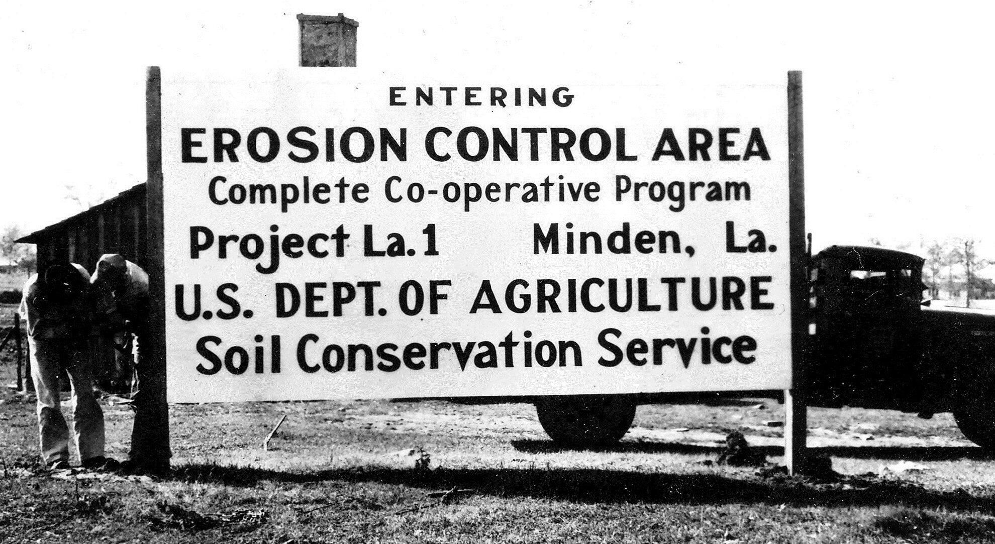 sign for an Erosion Control Area in Minden LA; the effects of erosion on farms; young boy standing in the eroded front yard; planting pine seedlings to control erosionPhotograph Details