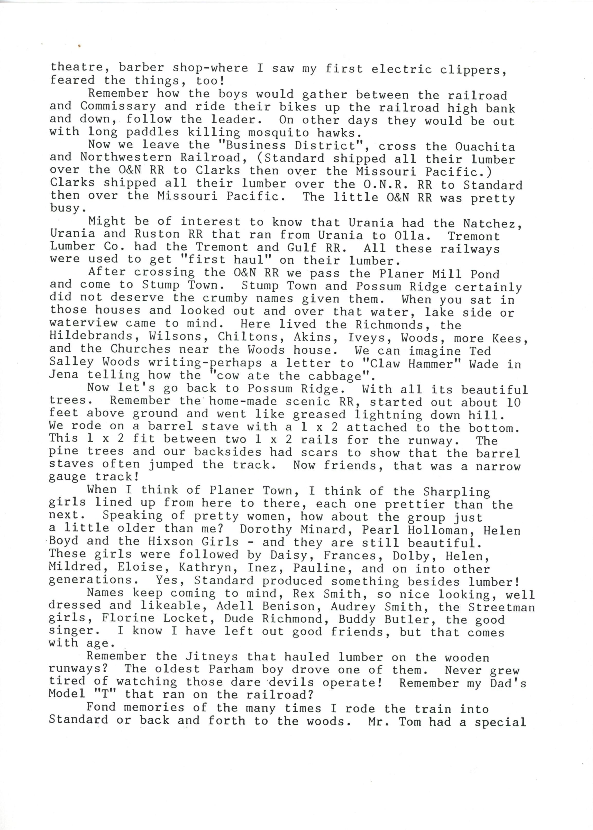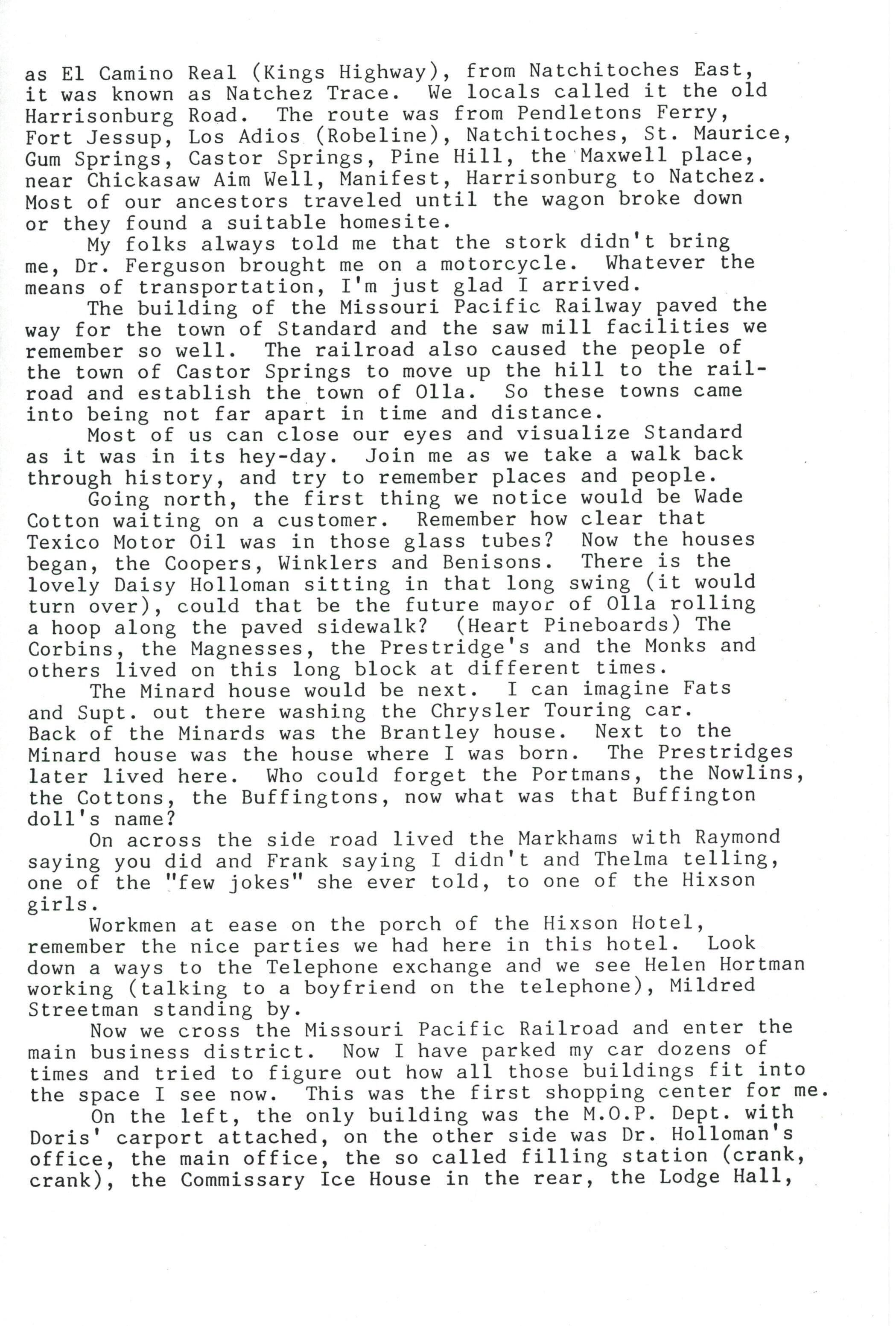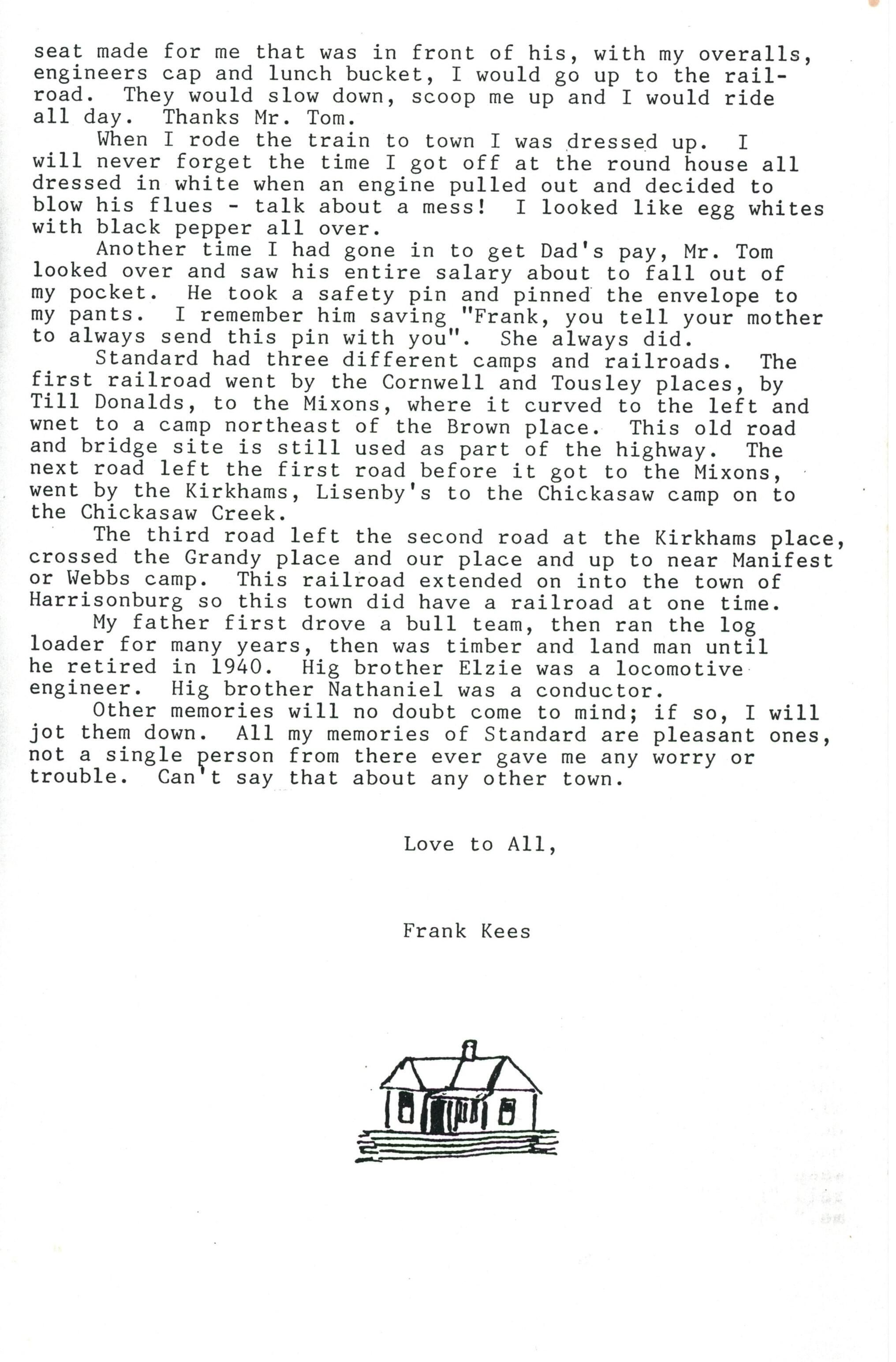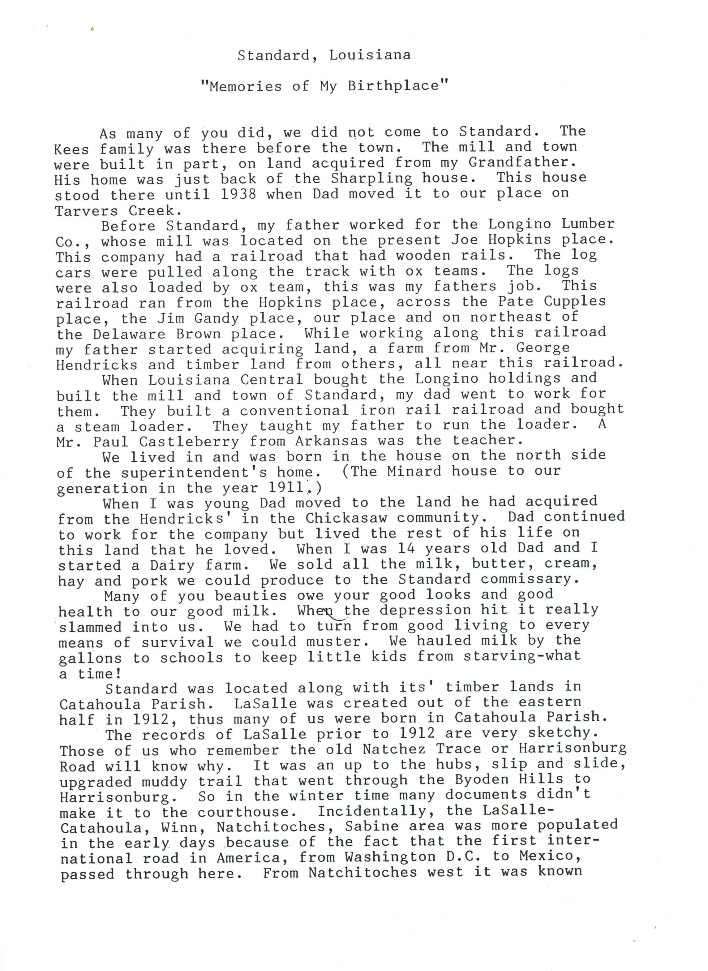 the Kees family had already been in the spot of Standard before it was called that; Frank's father worked for the Longino Lumber Co. as a a driver for the bull team before the mill was bought by Central Louisiana Lumber Co. (1906); his father then ran the steam loader (log loader) Central LA Lbr brought in; he eventually was in timber before retiring in 1940; the family also owned a dairy farm and sold their wares to the commissary of Standard; gives history of the area and roads as the population grew; Kees' gives a walkthrough Standard and surrounding areas by way of visiting places and those that lived thereCreator