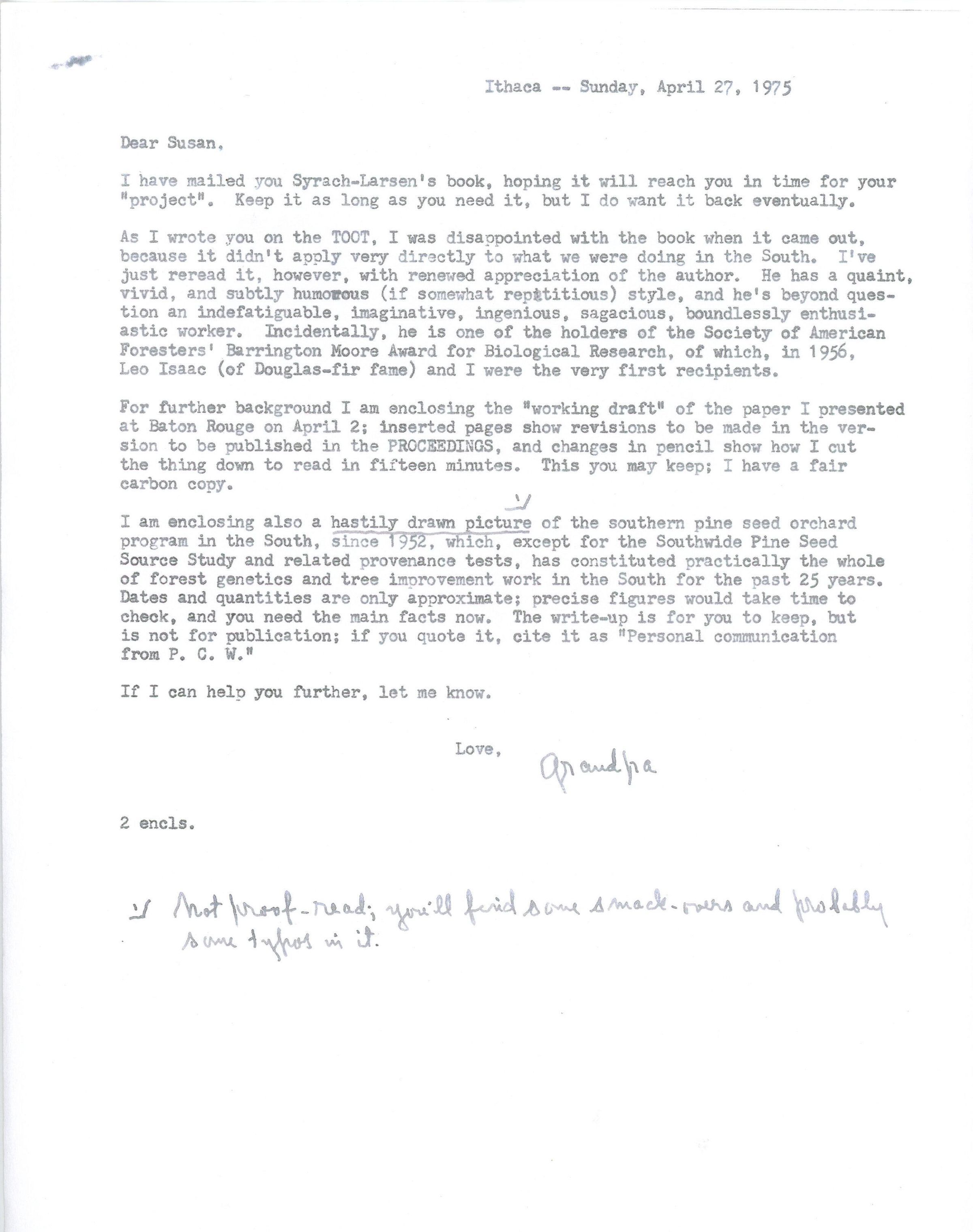 he mailed her a book and included his review on it; he also sends a working draft of a paper he presented on in the Proceedings of LSU's 24th Annual Forestry Symposium; will be eventually published in "Proceedings" (Forest Tree Improvement--the Third Decade); in a P.S. "Not proof-read; you'll find some [undecipherable words] and probably some typos in it."