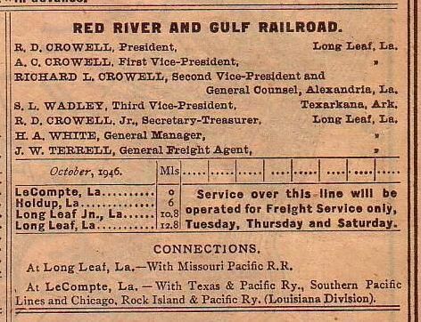 the officials in 1946 were R. D. Crowell president in Long Leaf, H. A. White general manager in Long Leaf, A. C. Crowell first vice president in Long Leaf, Richard L. Crowell second vice president and general counsel in Alexandria, S. L. Wadley third vice president in Texarkana, R. D. Crowell Jr. secretary-treasurer in Long Leaf and J. W. Terrell general freight agent in Long Leaf;