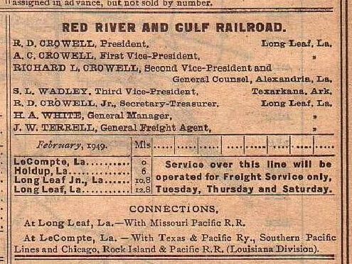 the officials in 1949 were R. D. Crowell president in Long Leaf, H. A. White general manager in Long Leaf, A. C. Crowell first vice president in Long Leaf, Richard L. Crowell second vice president and general counsel in Alexandria, S. L. Wadley third vice president in Texarkana, R. D. Crowell Jr. secretary-treasurer in Long Leaf and J. W. Terrell general freight agent in Long Leaf;