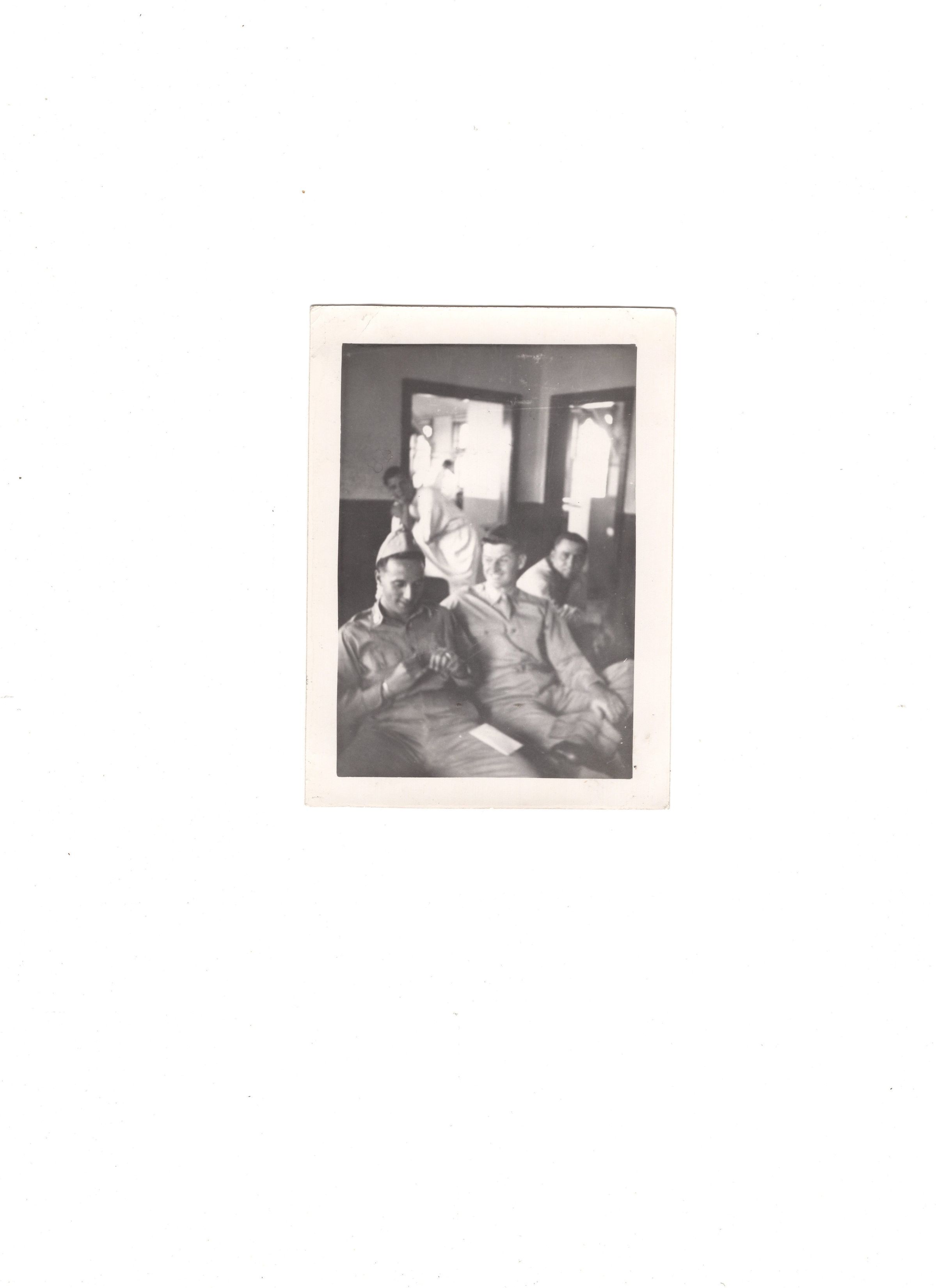 Photo shows three servicemembers in uniform and a man posing in the background (likely a medical staff member) at the dental clinic at Camp Claiborne.Photograph Details