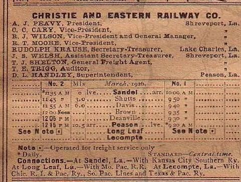 the officials in 1926 were A. J. Peavy president at Shreveport, C. C. Cray vice president at Shreveport, R. J. Wilson vice president and general manger at Peason, R. T. Moore vice president at Shreveport, Rudolph Krause secretary and treasurer at Lake Charles, J. S. Welsh assistant secretary-treasurer at Lake Charles, T. J. Shelton general freight agent at Shreveport, T. E. Trigg auditor at Shreveport, D. L. Handley superintendent at Peason;