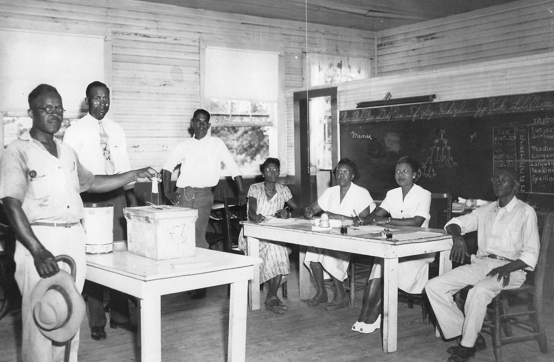 Long Leaf's first Negro Voting Commission; L to R: (casting ballot) "Kooky" James, Earnest Hurks Sr., Philip Young (teamster), Beatrice Simon, Ara Jackson (school principal), Percival S. Bell (teacher), and Henry Walker "Sweat Peas" (teamster)Photograph Details