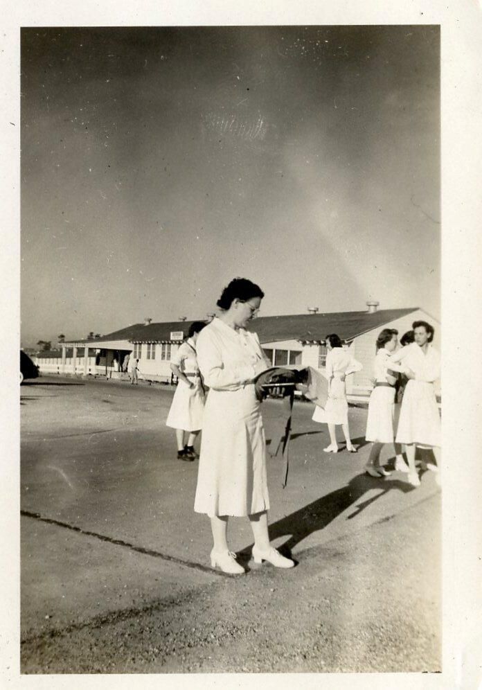 A photo of the head nurse of the nurses barracks at Camp Claiborne, as well as five other nurses; Nurses Barracks in the backgroundPhotograph Details