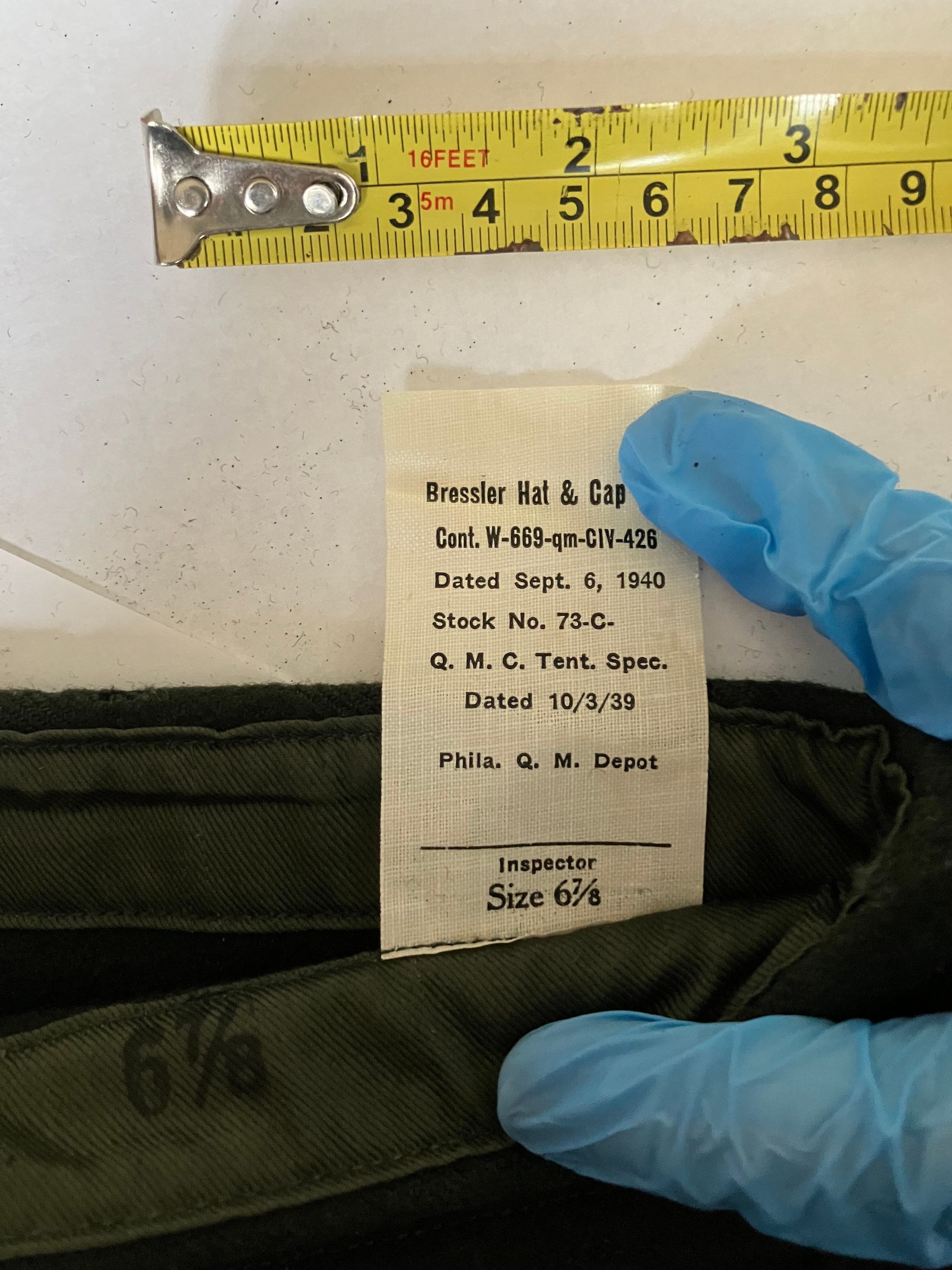 Bressler Hat & Cap Co. Cont. W-669-qm-CIV-426 Dated Sept. 6, 1940 Stock No. 73-C- Q. M. C. Tent. Spec. Dated 10/3/39 Phila. Q. M. Depot Inspector Size 6 7/8Material/Technique