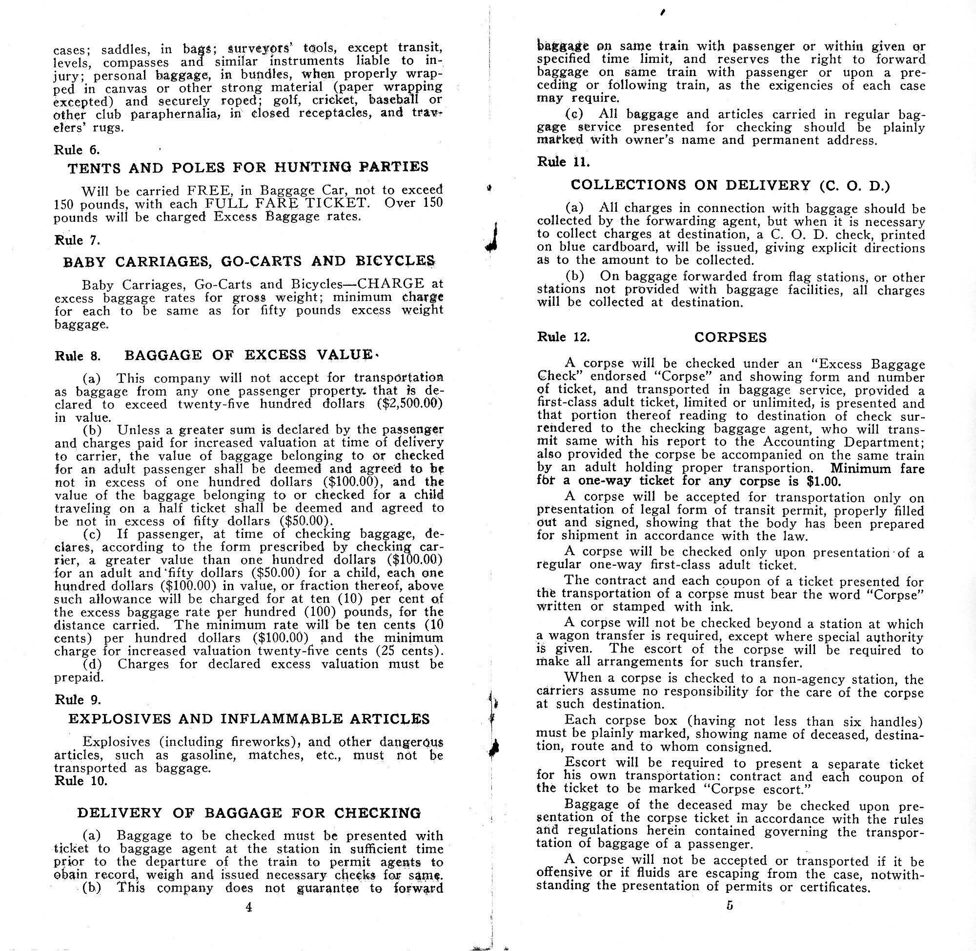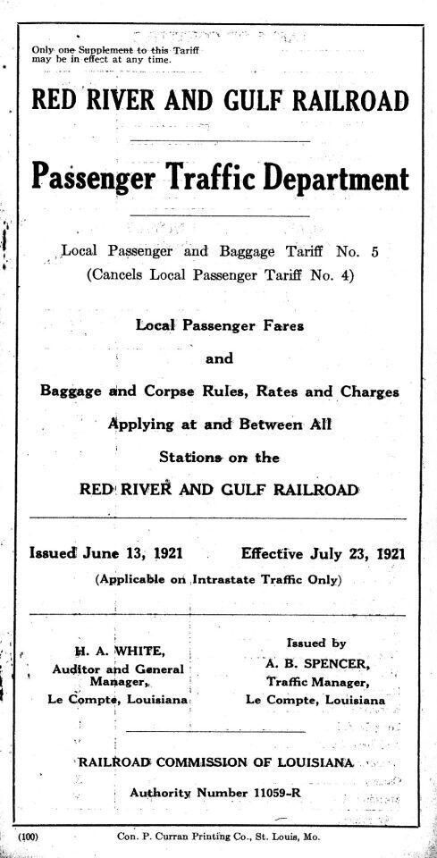 local passenger fares and baggage and corpse rules, rates and charges applied at and between the stations of the Red River & Gulf Railroad Co.;