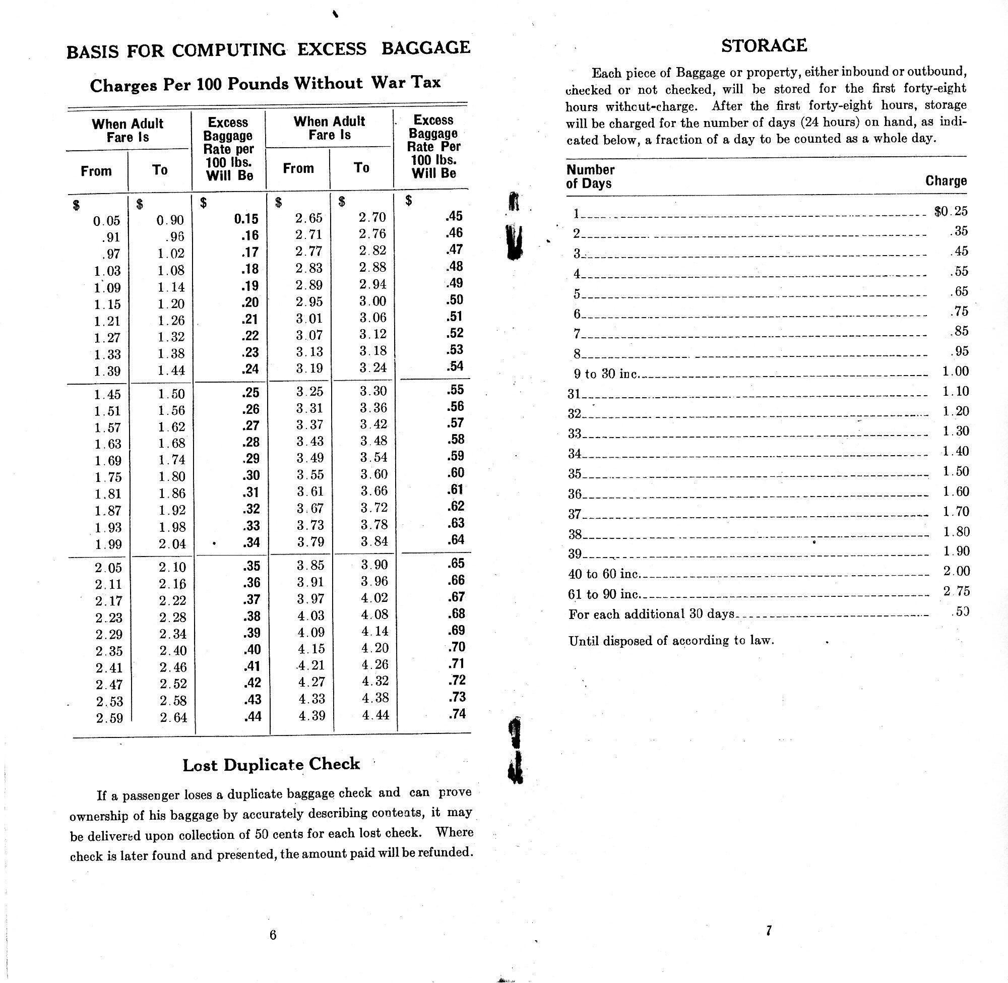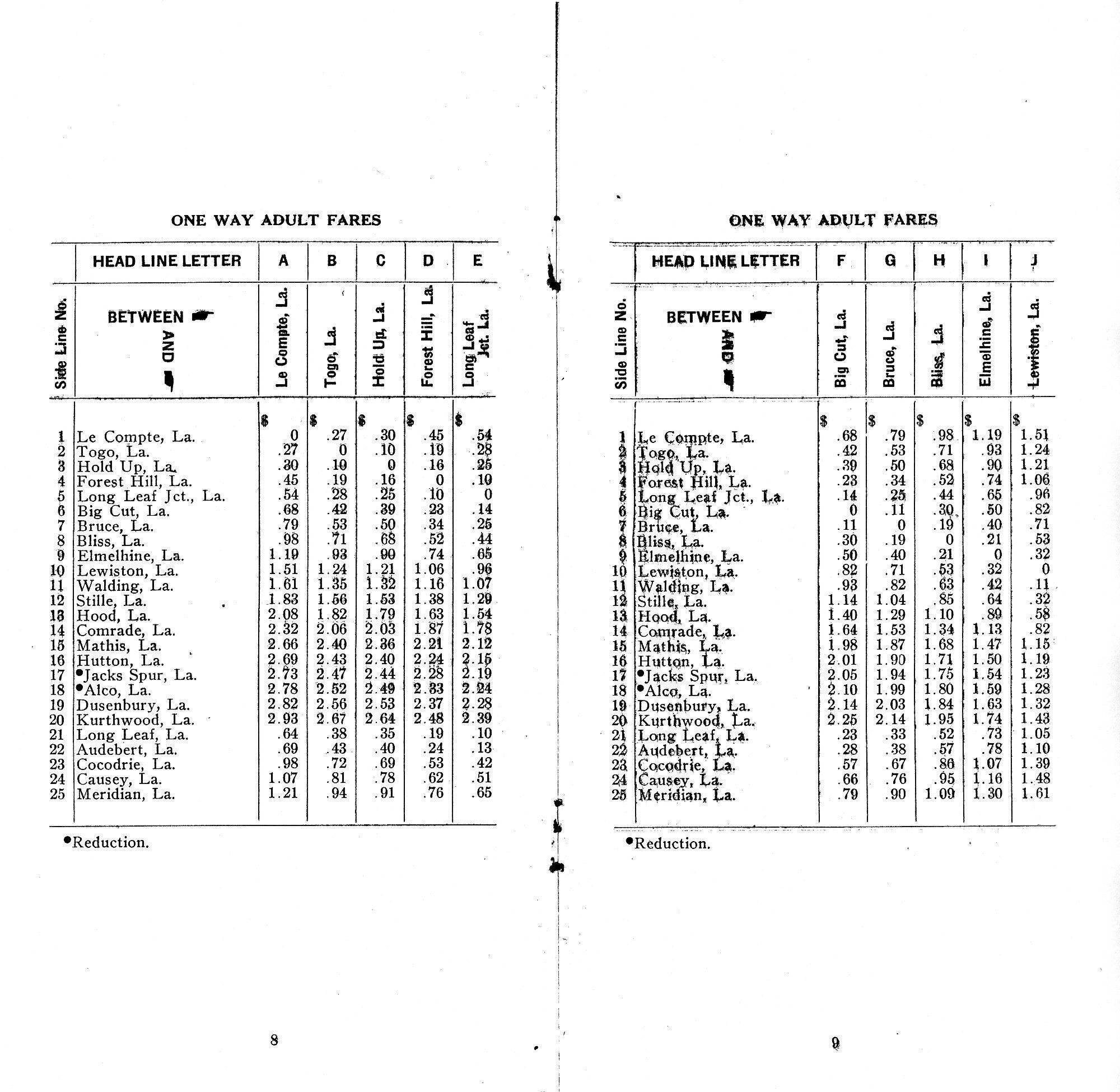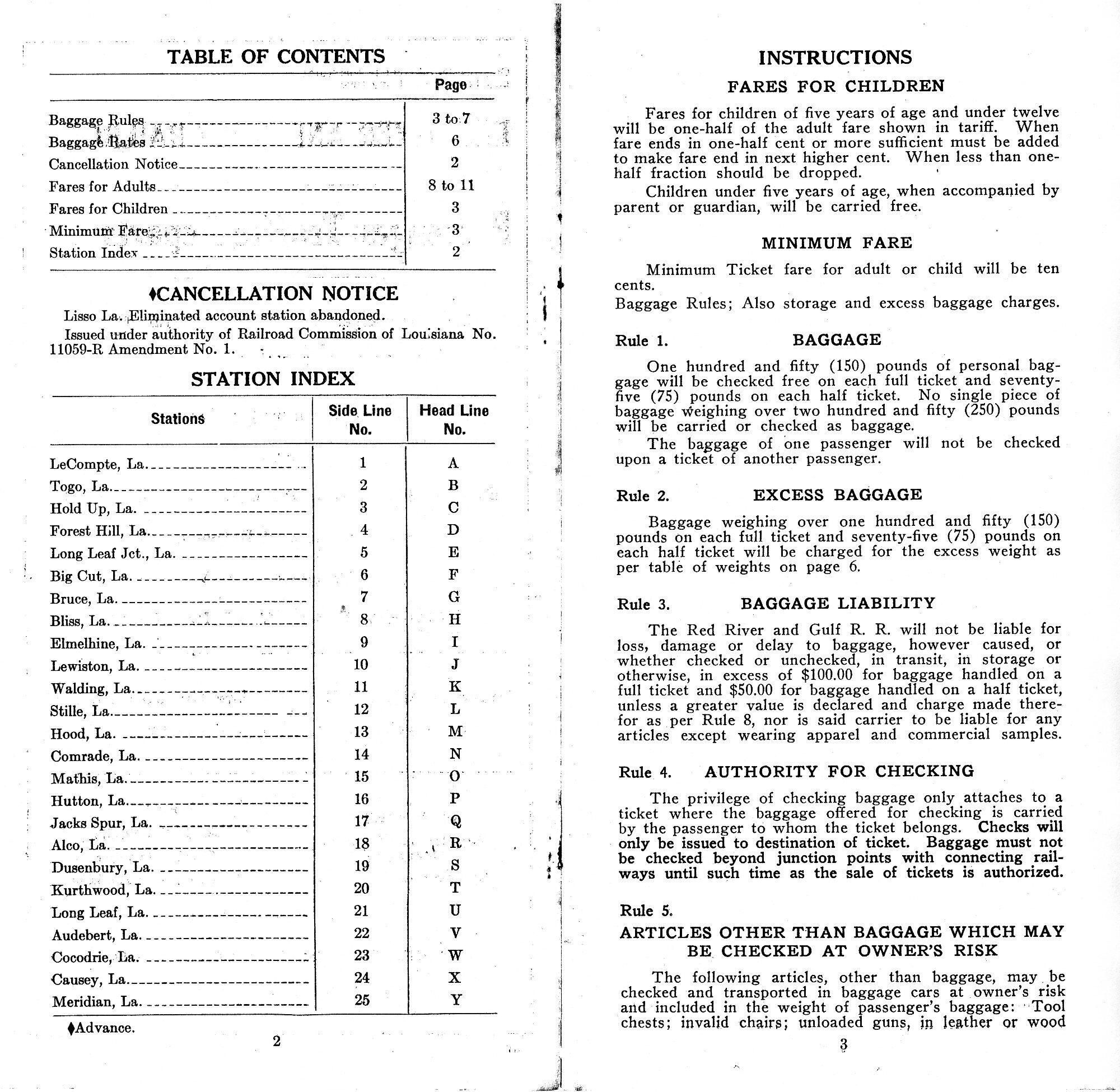 provides baggage rules and rates, fares for adults and children, and minimum fare; cancellation notice of Lisso station abandoned; stations: LeCompte, Togo, Hold Up, Forest Hill, Long Leaf Junction, Big Cut, Bruce, Bliss, Elmelhine, Lewiston, Walding, Stille, Hood, Comrade, Mathis, Hutton, Jacks Spur, Alco, Dusenbury, Kurthwood, Long Leaf, Audebert, Cocodrie, Causey, and MeridianContext