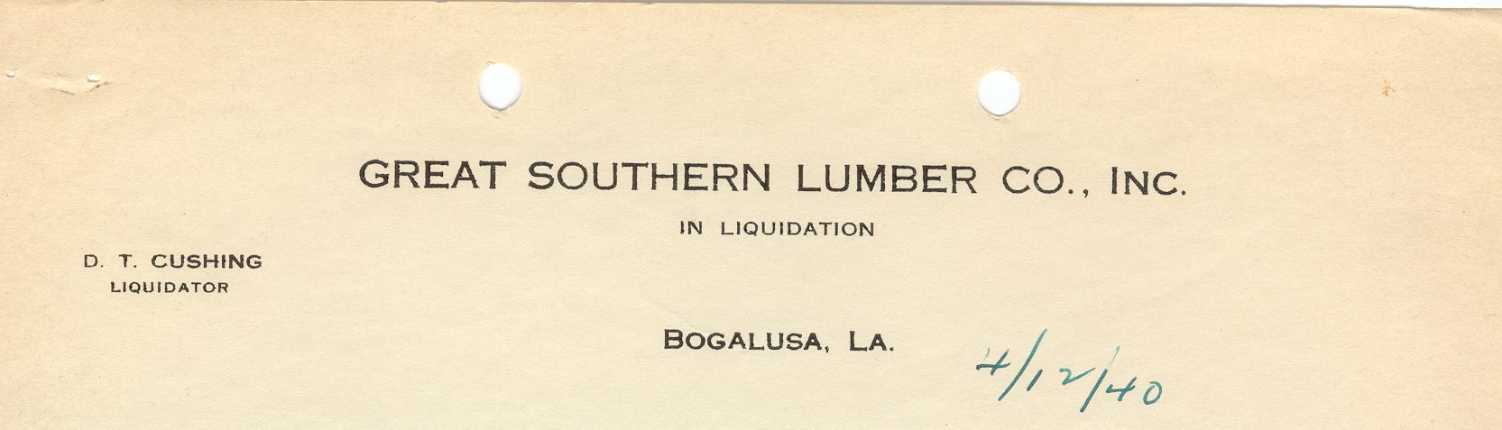 Great Southern Lumber Co., was based in Bogalusa, LA. D.T, Cushing was the Vice President and General Manager of the lumber company. Whenever the Bogalusa lumber supply went dry, the company was forced to shut down.Collection