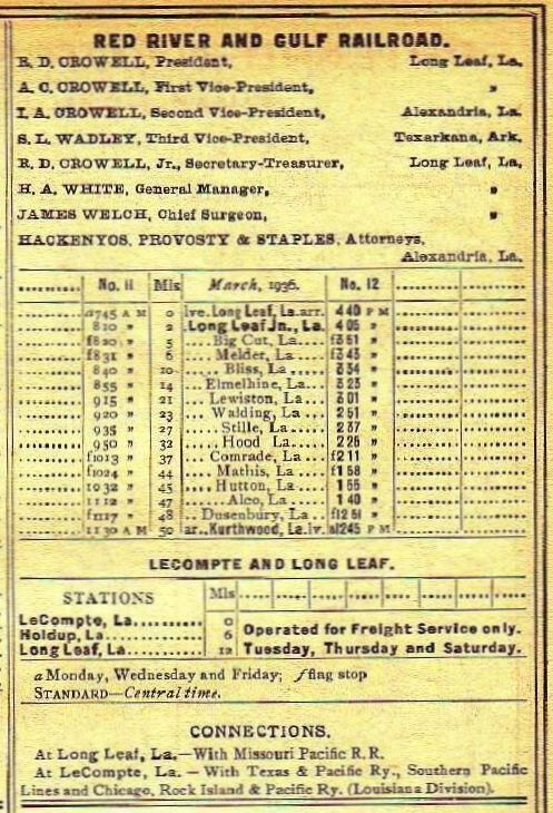 the officials in 1936 were R. D. Crowell president in Long Leaf, H. A. White general manager in Long Leaf, Idella A. Crowell first vice president in Alexandria, Susie L. Wadley second vice president in Texarkana, Ida Crowell third vice president in Los Angeles R. D. Crowell Jr. secretary-treasurer in Long Leaf, Hakenyos, Provosty & Staples attorneys in Alexandria, James Welch chief surgeon in Long Leaf, and J. J. Bridges roadmaster in Long leaf;