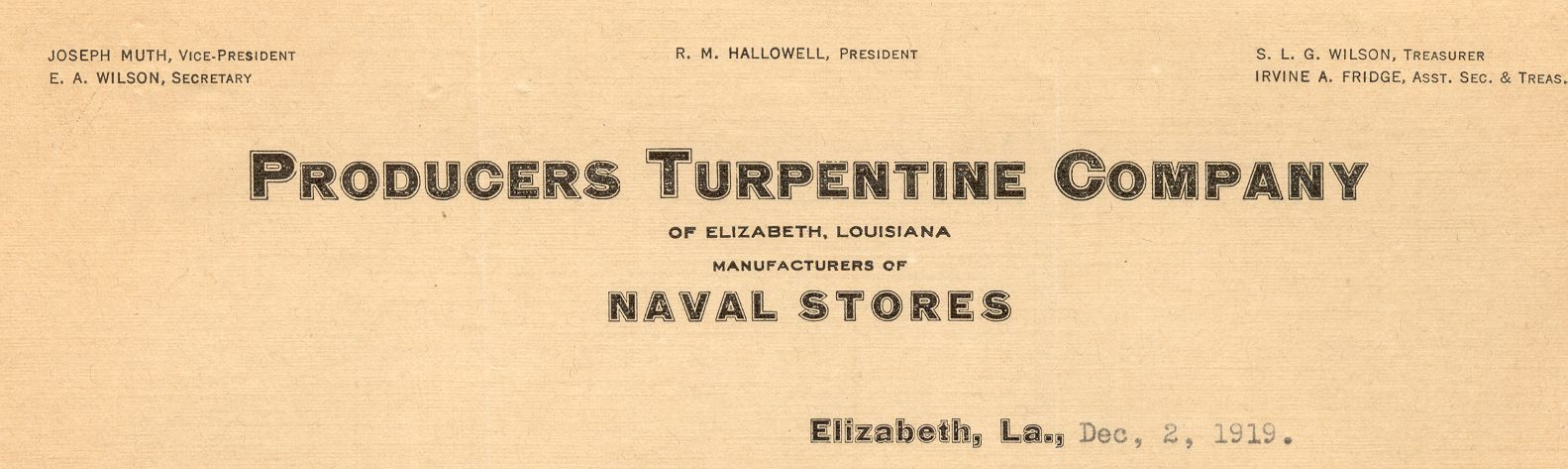 Producers Turpentine Company began operations in Elizabeth, Louisiana. The company specialized in the production of Naval Stores and Turpentine which were crucial to the U.S. Navy and the entire lumber industry in Louisiana as a whole. However, the company was forced to close down due to local resources drying up.Collection