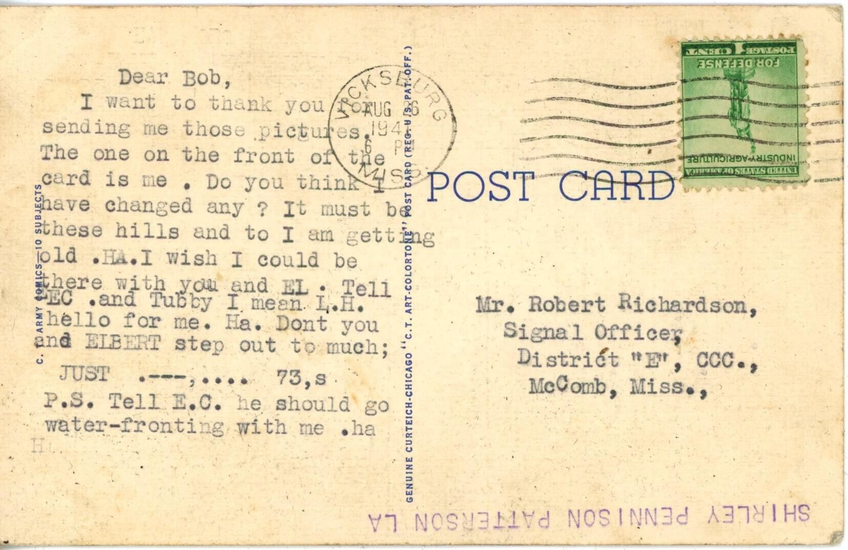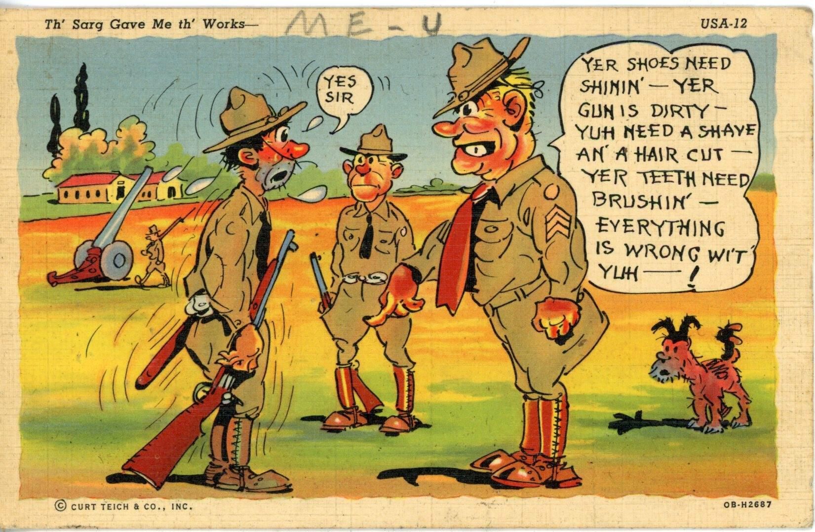 postcard with the C. T. Army Comic--10 Subjects, "Th' Sarg Gave Me th' Works"; sender wrote above the soldier "ME" and above the Sargent "U"; postcard to "Bob" (Robert Richardson); thanks for some pictures and wishes a few people hello; gives a message in Morse code (?)Collection