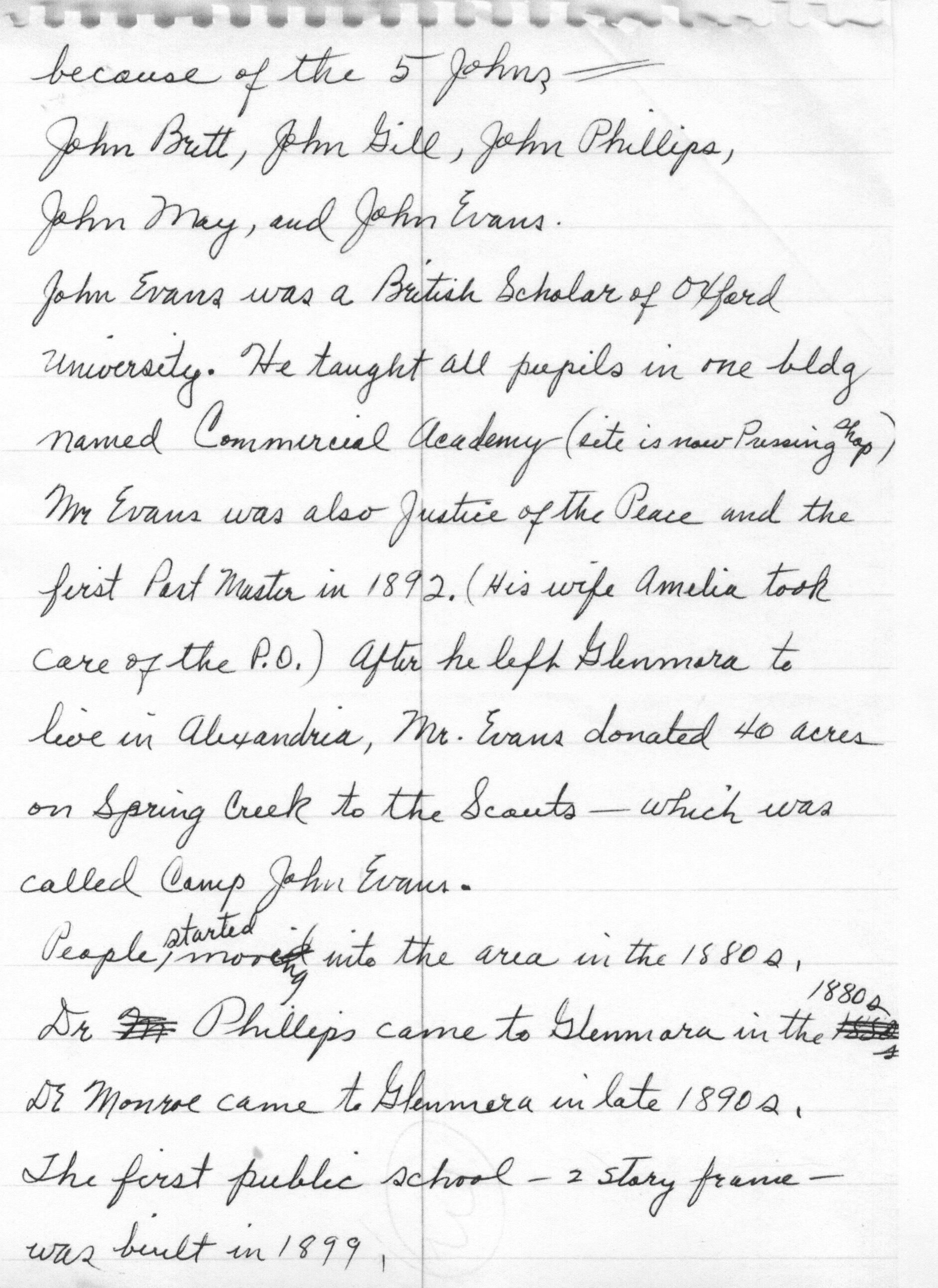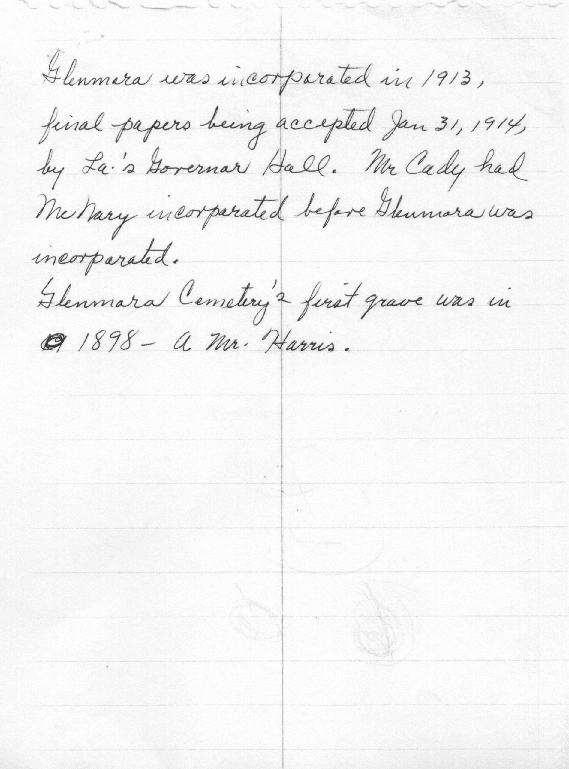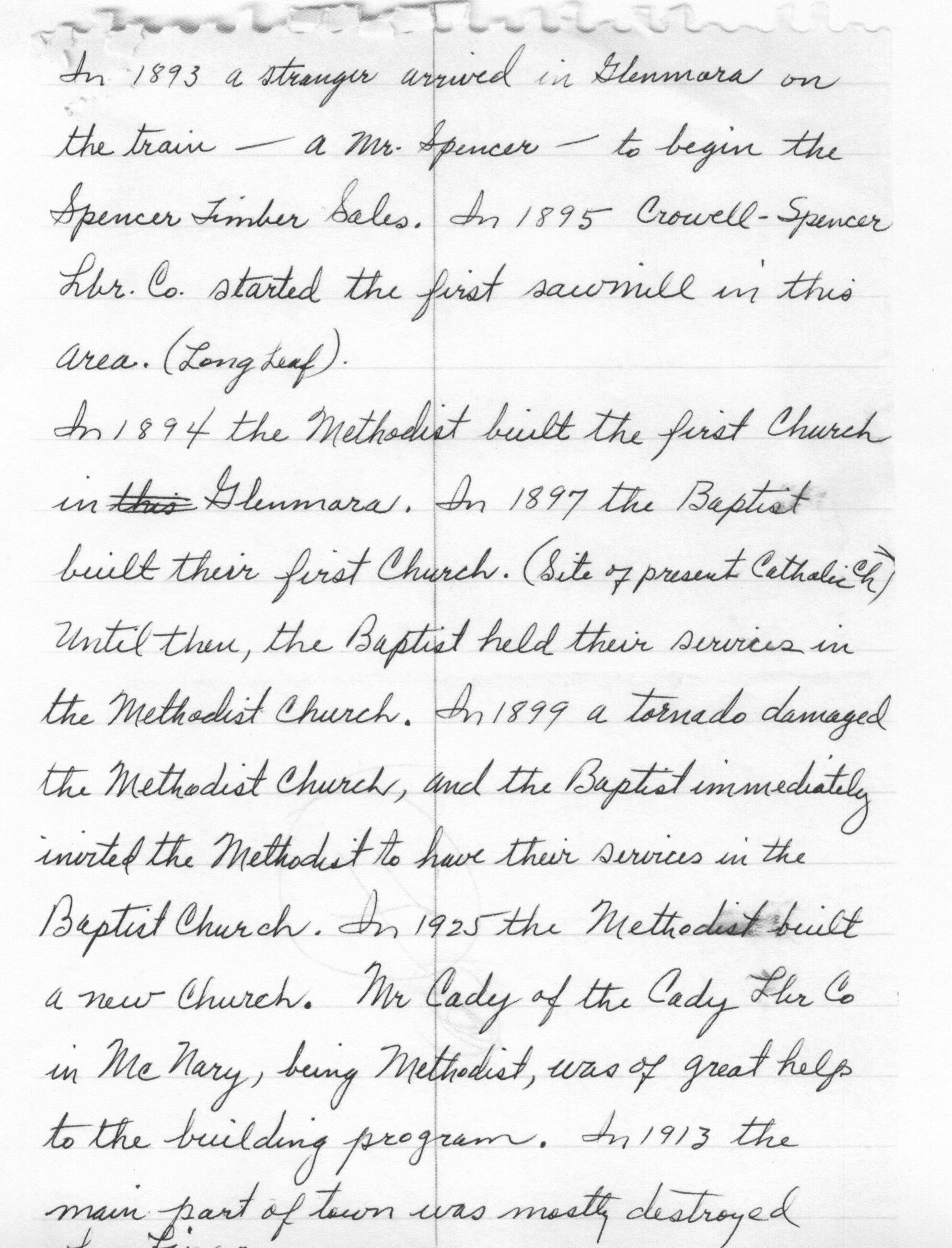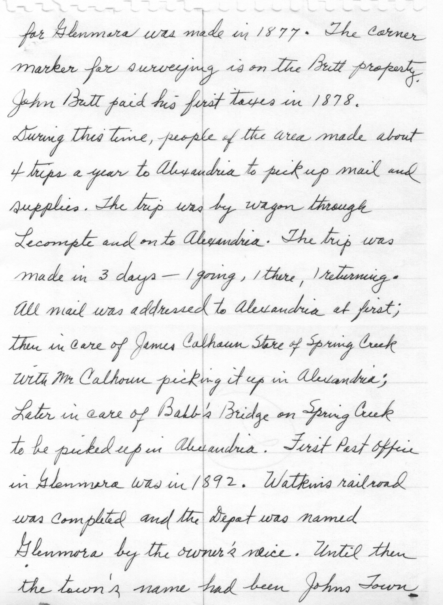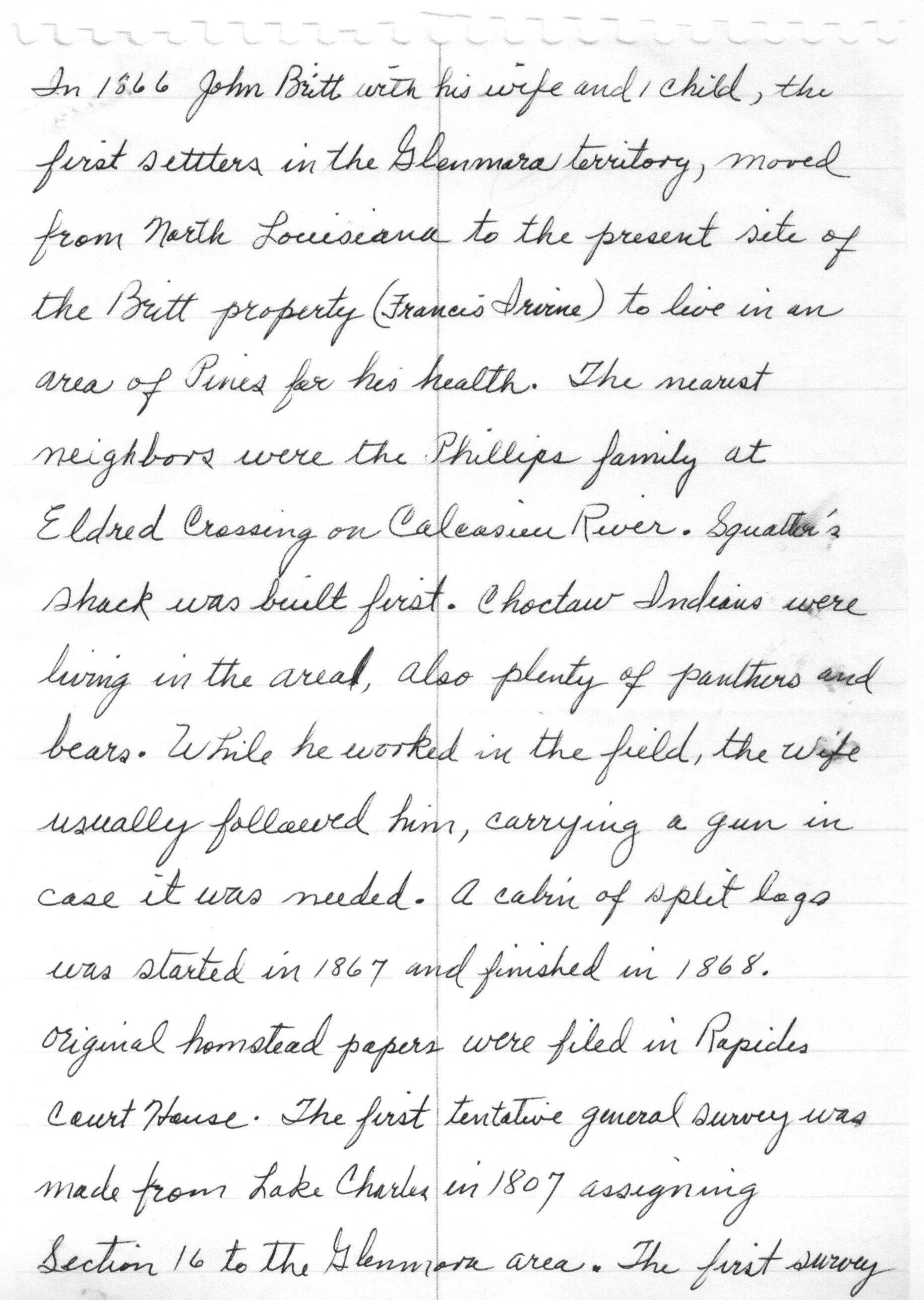 the first settler to the area was John Britt in 1866. The first post office was in 1892 and that same year the Watkins railroad was completed. Its depot was named "Glenmora" after a niece of the railroad owner. Originally the area was being called Johns Town as there were 5 Johns that lived there/helped settle to area. A. D. Spencer came in 1893 to start Spencer Timber sales and then closing in 1895 and opening Crowell & Spencer Lumber Co.'s to its first sawmill for long leaf (called Long Leaf Mill).Other Names and Numbers