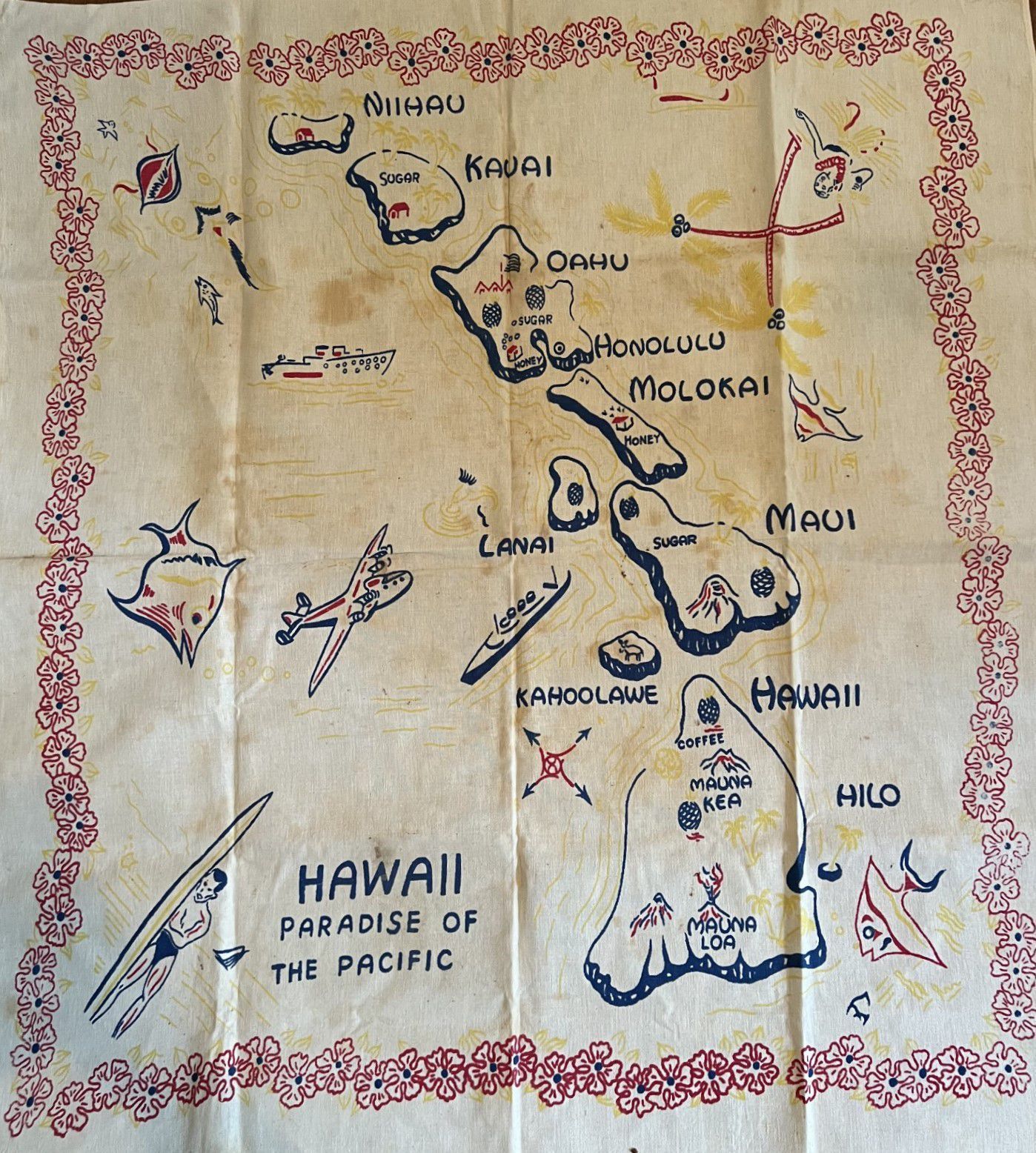 Map of the "Pacific Paradise" Hawai'i depicting islands Niihau, Kauai, Oahu, Honolulu, Molokai, Lanai, Maui, Kahoolawe, Hawai'i, and Hilo.Other Names and Numbers