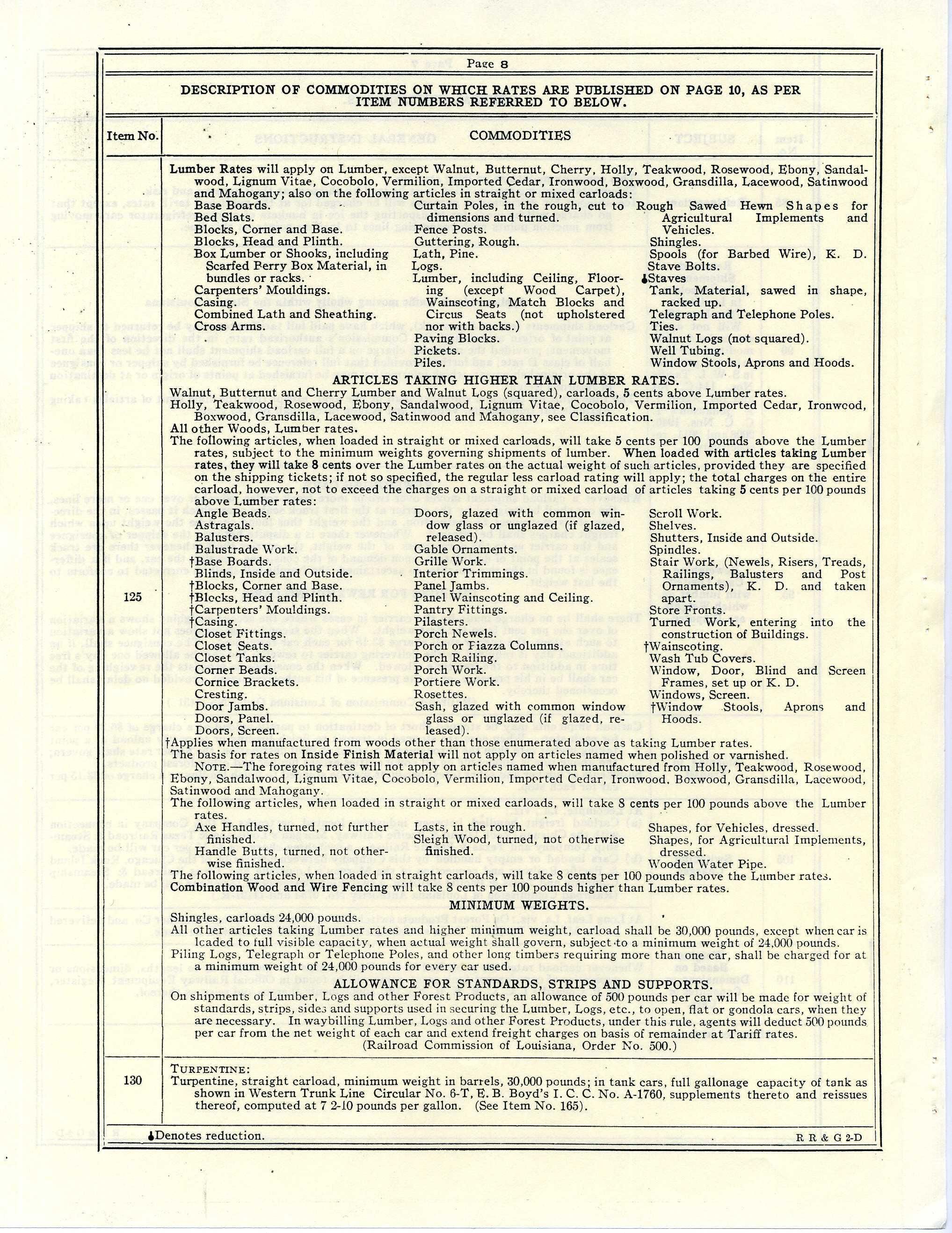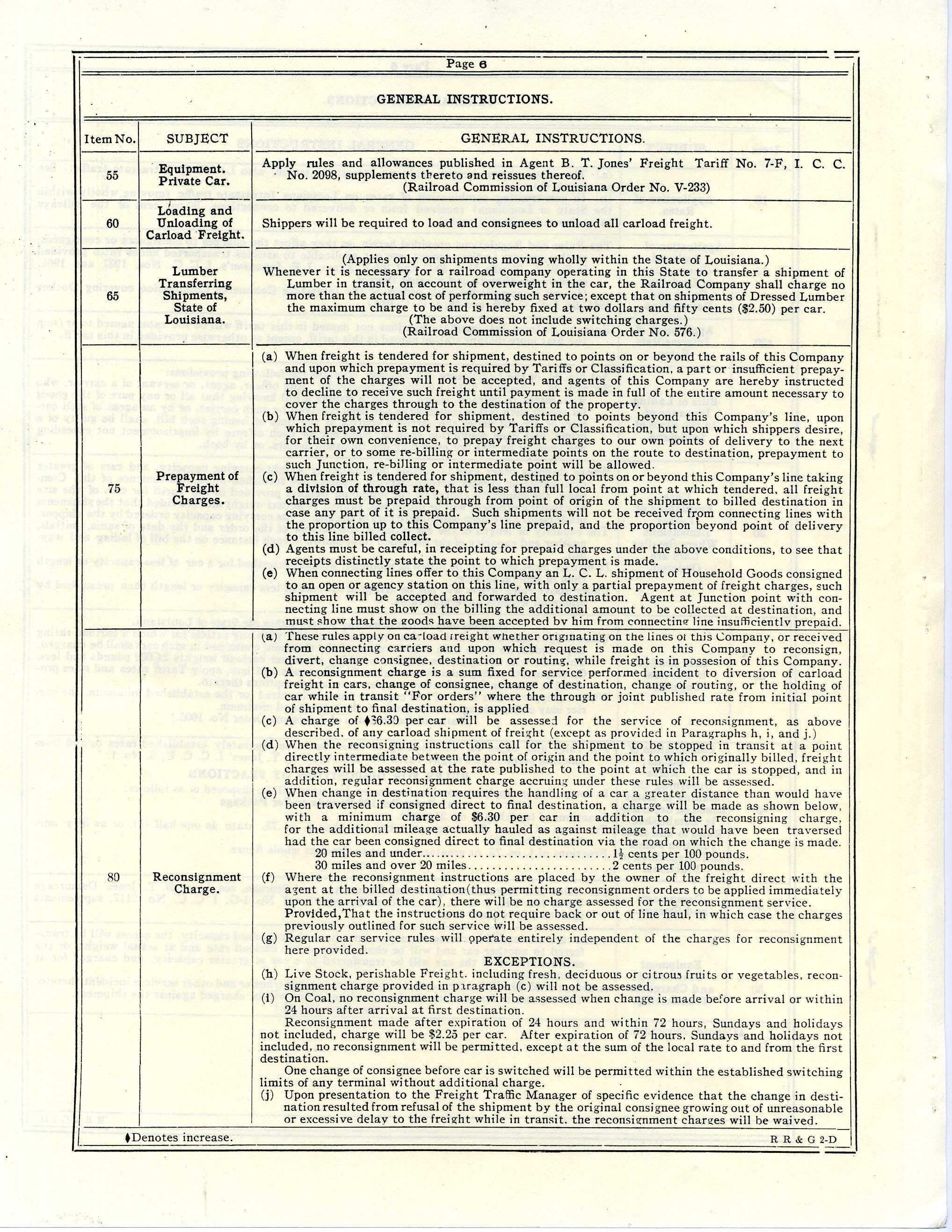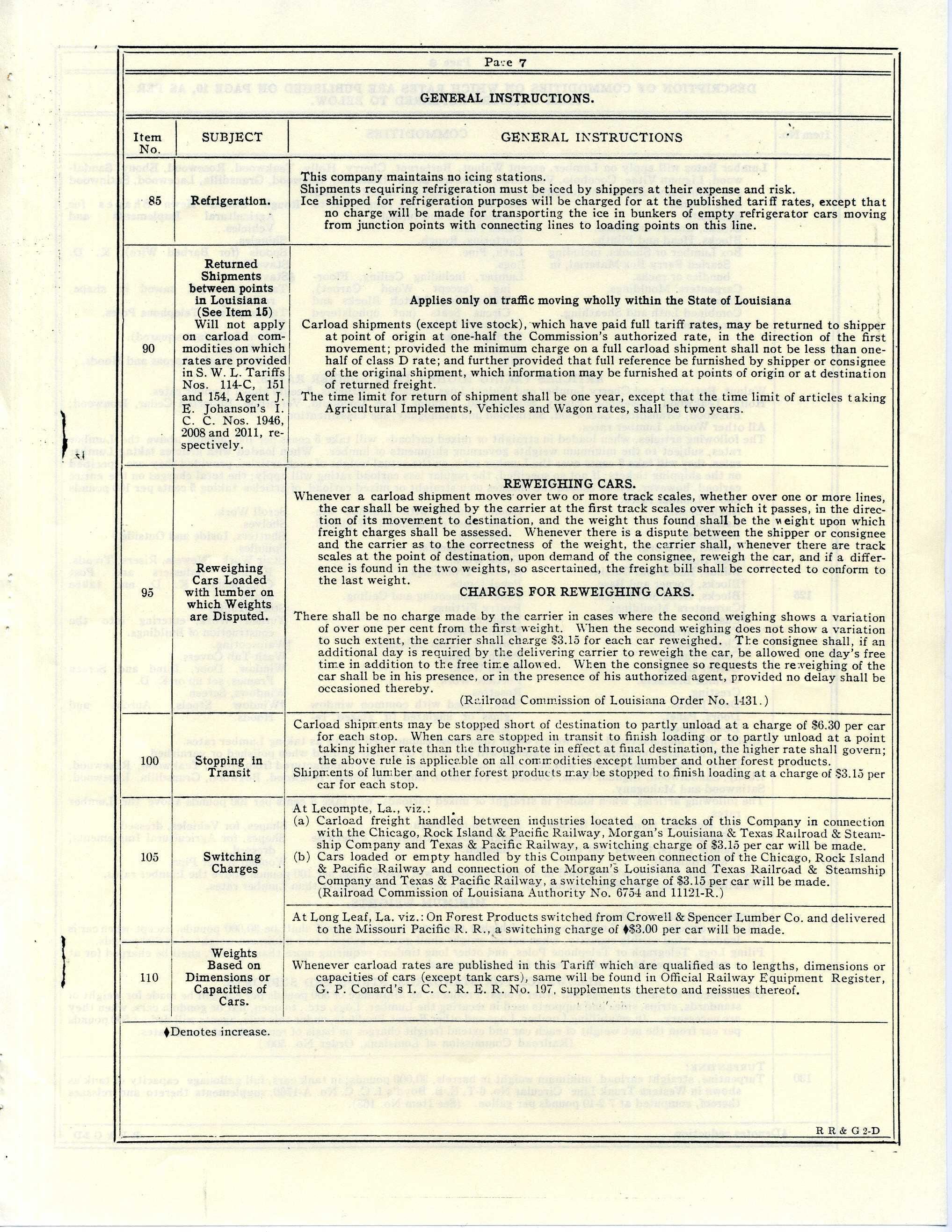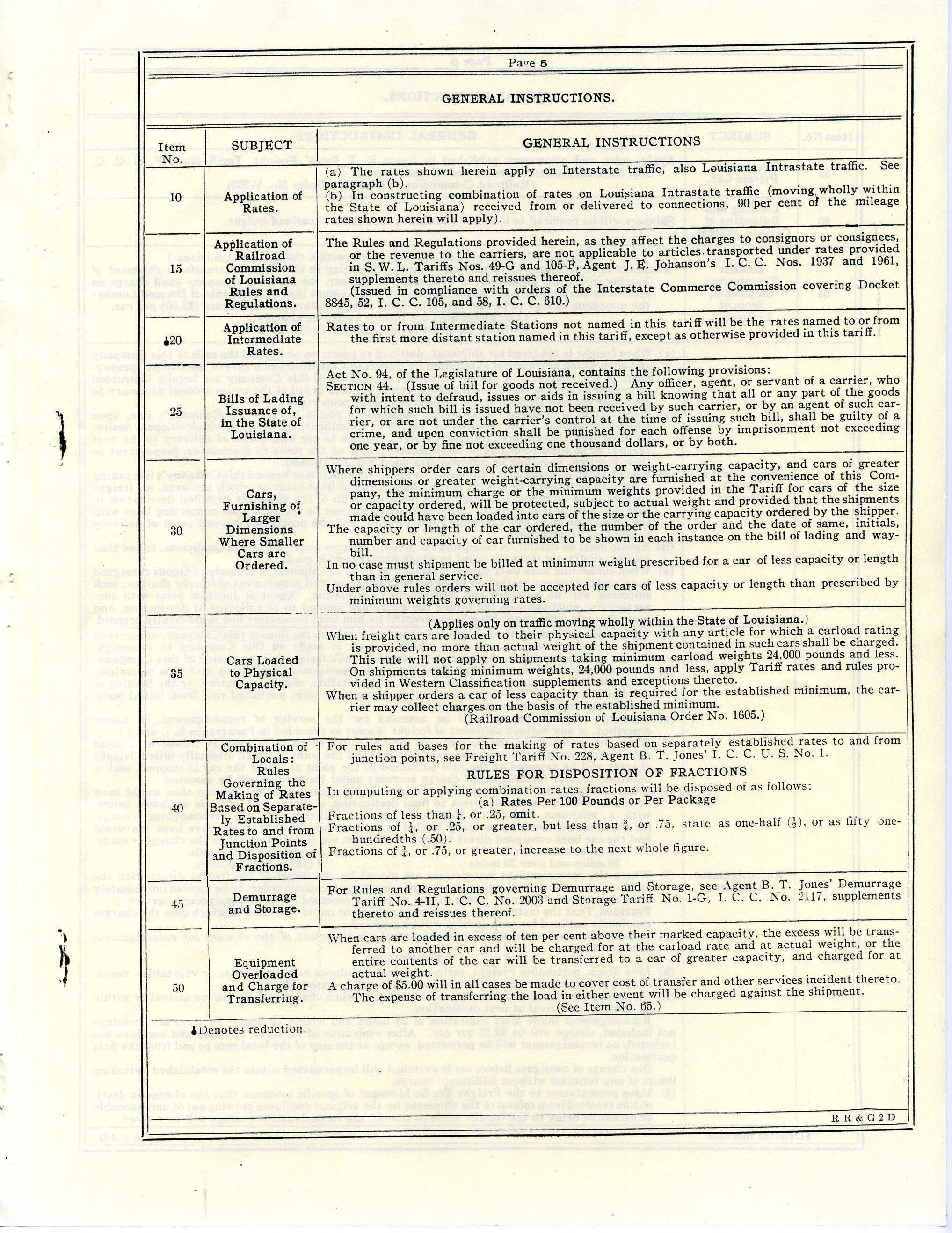 provides: allowance for standards, strips and supports, application of intermediate rates, application to R. R. Com. of LA, applications of general rates, bills of issuance of Lading, classification and rules circular governing, combination of locals, commodity descriptions, demurrage and storage rules, distances to be used in computing rates, equipment overload, furnishing cars of larger dimensions and small cars, loading and unloading carload freight, loading cars to physical capacity, minimum weights, prepayment of freight charges, private car equipment, rates of application, commodity and distance, reconsignment charges, refrigeration, returned shipments, reweighing cars, stations where rates apply, stopping in transit, switching charges, transferring shipments of lumber, and weights of carload shipments;