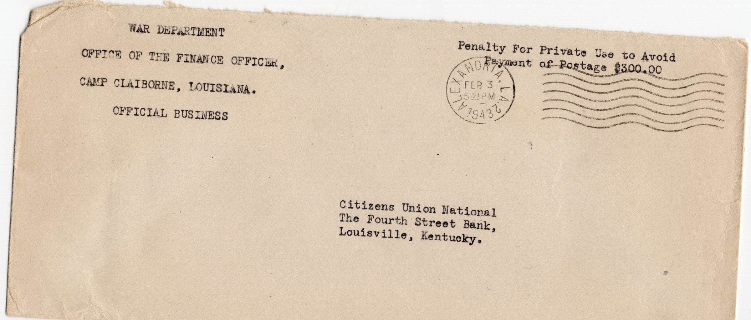 The image shows an old envelope from the War Department, specifically from the Office of the Finance Officer at Camp Claiborne, Louisiana, marked for official business. It is addressed to Citizens Union National, The Fourth Street Bank, located in Louisville, Kentucky. There is a postal stamp from Alexandria, L.A., dated February 3, 1943, at 6:30 PM. The envelope also includes a note stating a penalty for private use, indicating the importance of its official nature, with