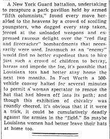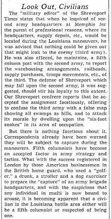 with the oncoming LA maneuvers, the "military editor" of the Shreveport Times was informed that the armies will be treating the civilians as "enemies;" as in the real war one cannot know if the friendly civilians that come up might be friendly or are foes; goes on to write that were some incidents in the past with young LA teenagers playing pranks and mocking the soldiers and a convoy stopping to let a woman get her hat--these will not be repeated and will more than likely end up with said civilians becoming prisoners of war; article closes with saying to keep the kids and hats at home during the maneuversCollection