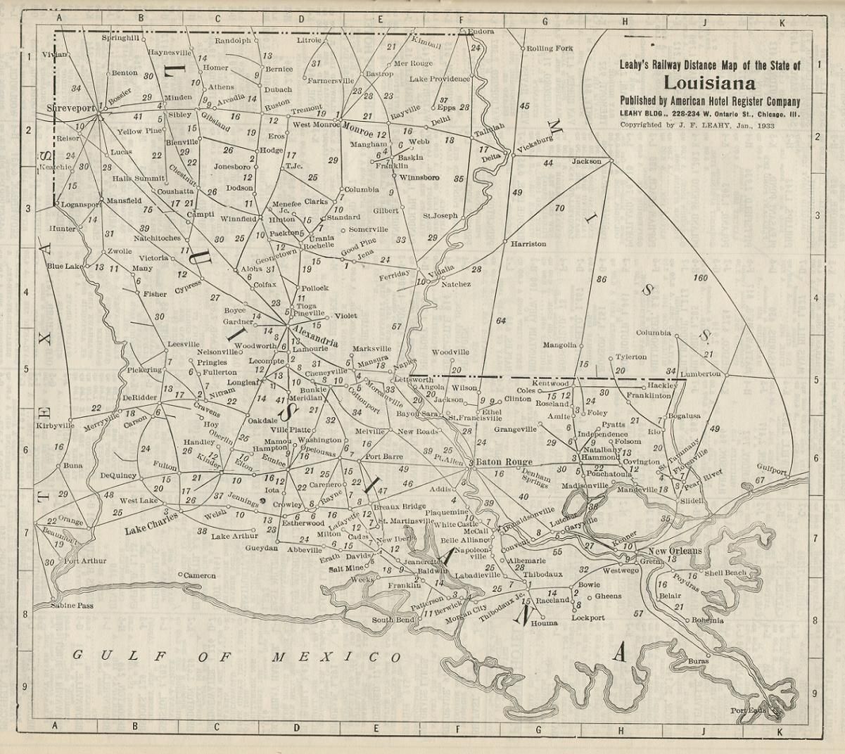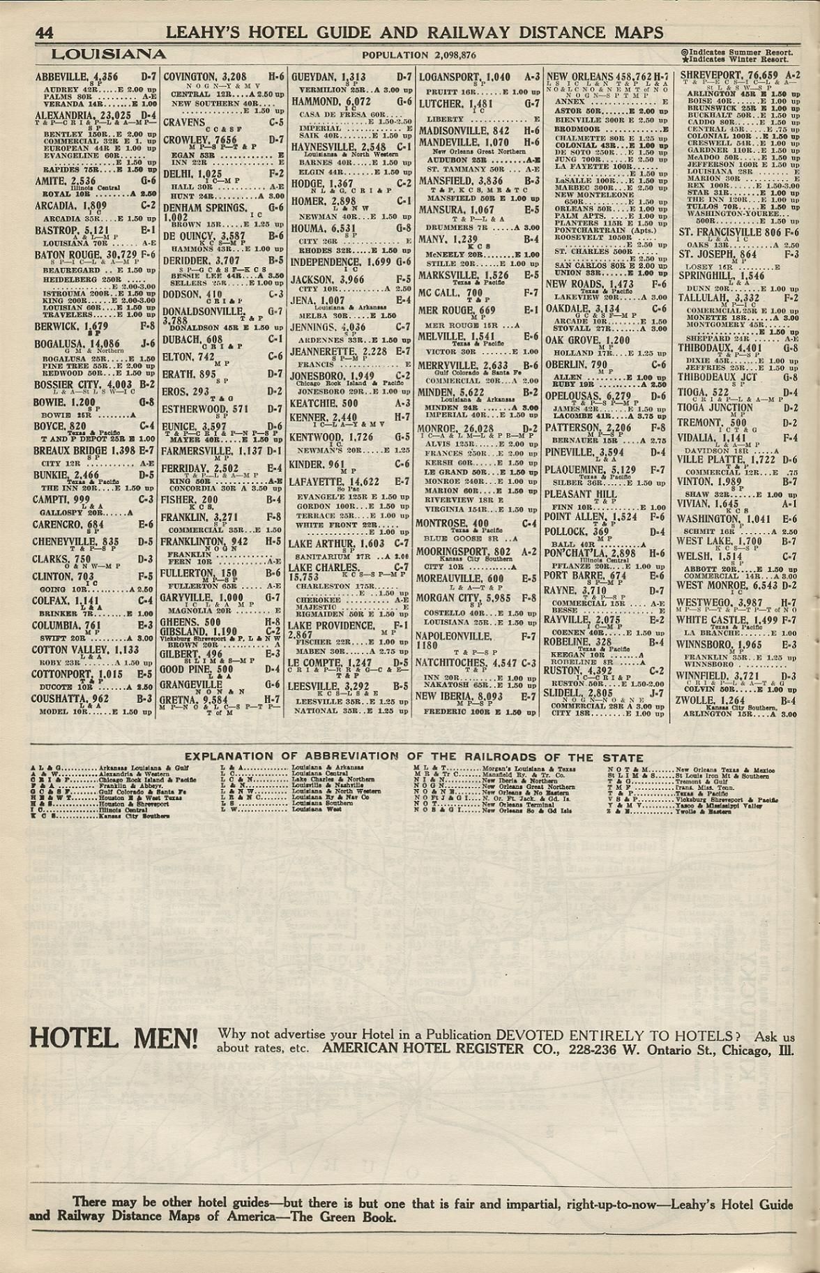 pages 44-45 is the LA guide to hotels and a map; population was 2,098,876; offers cities and town names in alphabetical order with map coordinates; Long Leaf is not on the list but Lecompte is (B-5); under the names are the abbreviations of the railroads and a dash indicates connections; a map of LA with railway distance is on the next page; circles indicate where cities are and if they are any railways; Long Leaf is seen in C-5Context