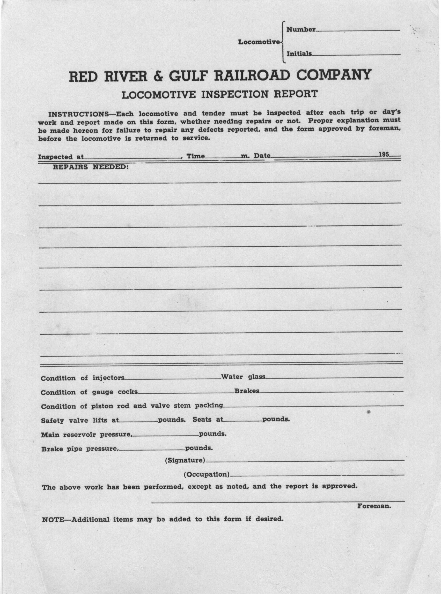 a blank locomotive inspection report for the Red River & Gulf Railroad CoContext