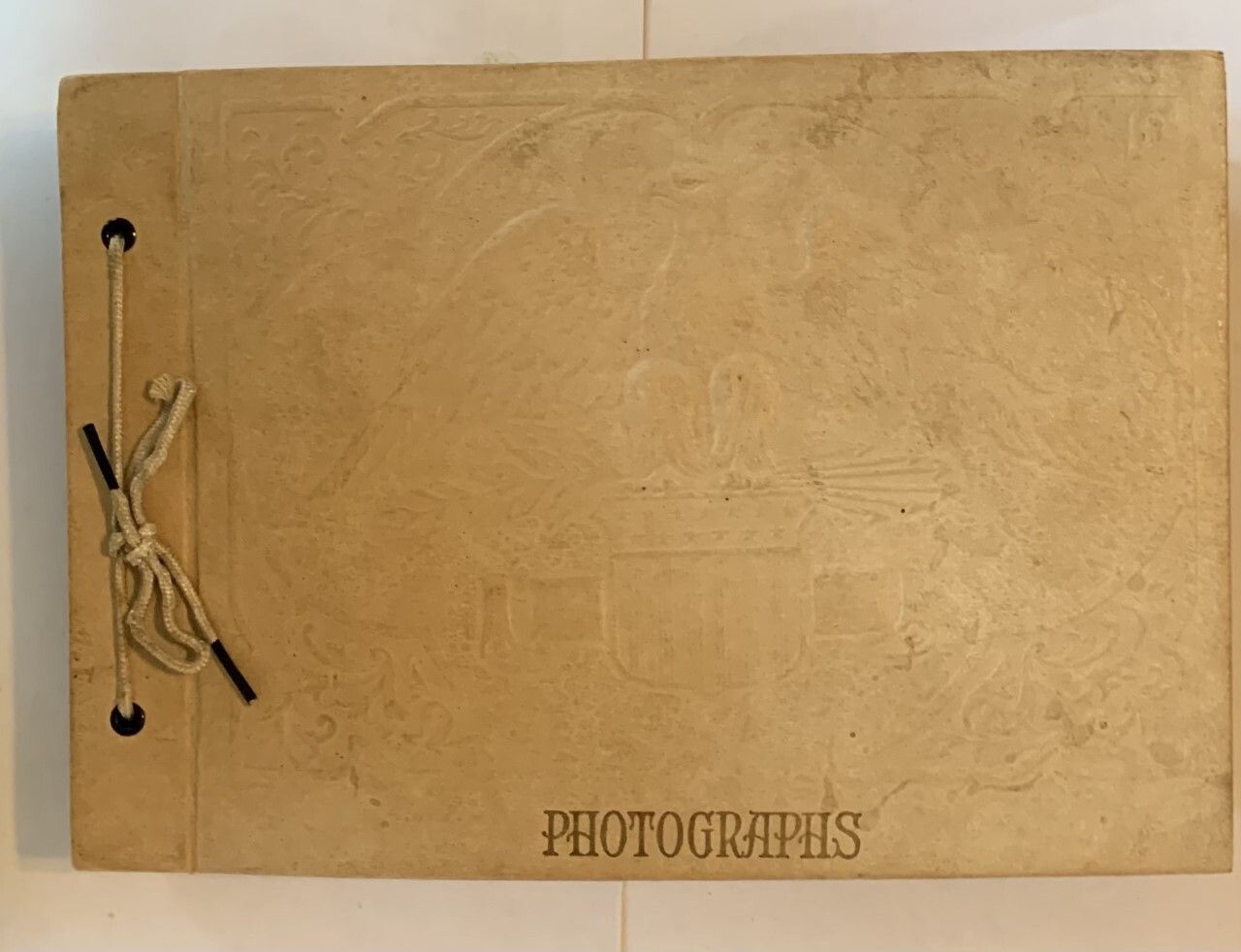 A large book of photos of buildings and soldiers, newspaper articles and clippings, and more from Camp Claiborne, LA.Context