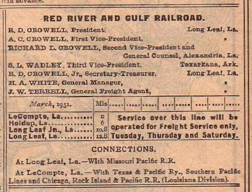the officials in 1951 were R. D. Crowell president in Long Leaf, H. A. White general manager in Long Leaf, A. C. Crowell first vice president in Long Leaf, Richard L. Crowell second vice president and general counsel in Alexandria, S. L. Wadley third vice president in Texarkana, R. D. Crowell Jr. secretary-treasurer in Long Leaf and J. W. Terrell general freight agent in Long Leaf;